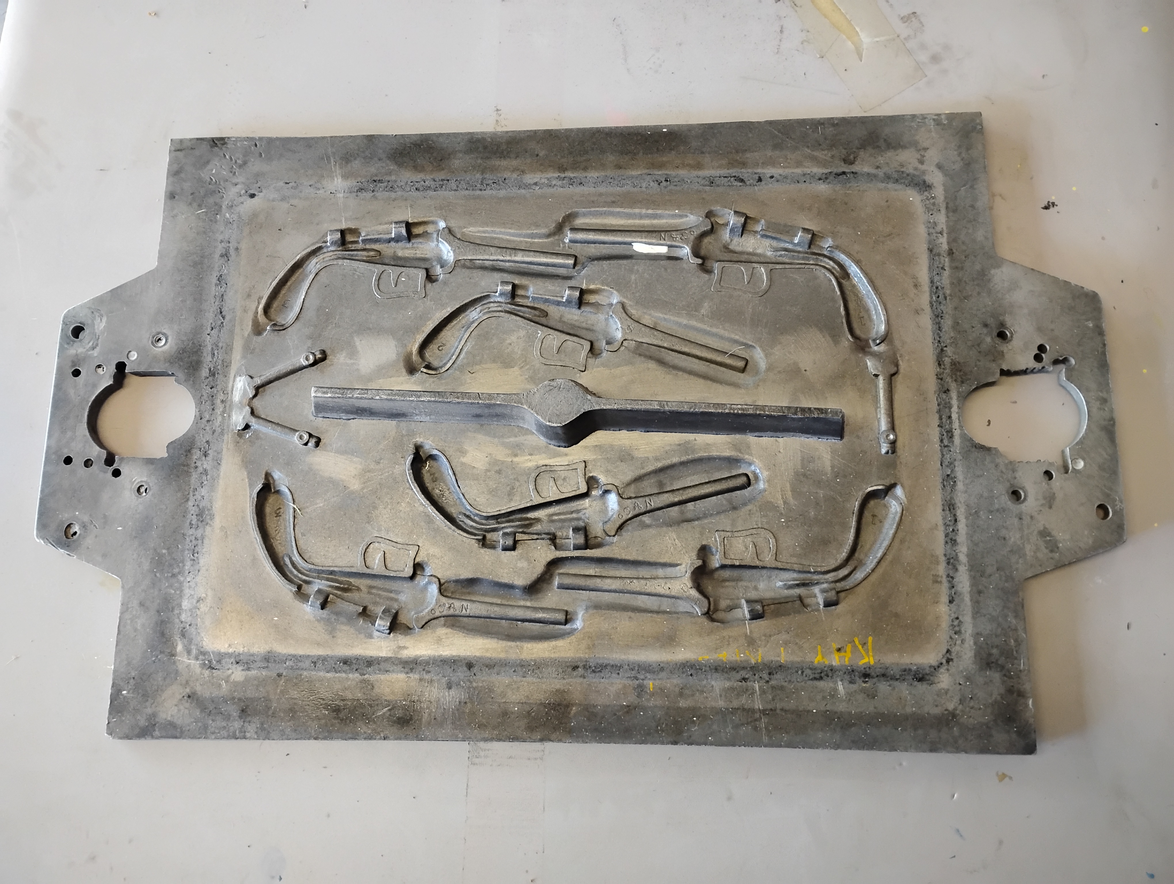 The American Bulldog Bootjack is made from solid brass and features a unique design resembling a pair of revolvers. The bootjack is accompanied by a heavy cast iron mold used for its production. The dimensions of the bootjack are approximately 12 inches in length and 4 inches in width, though exact measurements may vary. The mold is significantly heavier and is likely around 20-30 lbs. The distinguishing mark on the mold reads "Ray J. Friesen".