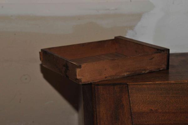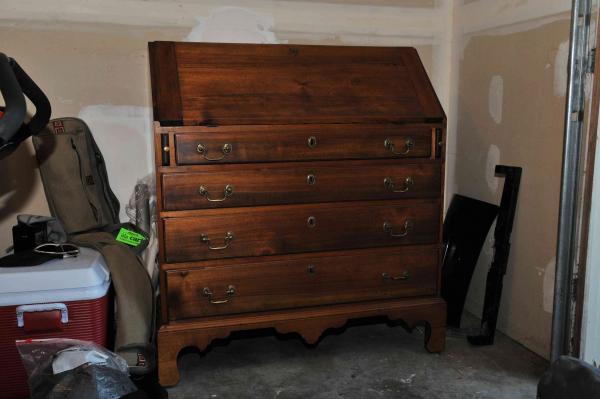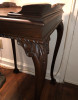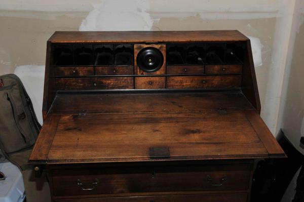 American Chippendale slant front desk. Reportedly from early 1800's or late 1700's. Seller's auction report says the wood is Birch, but resembles Walnut to me. Side panels and lid are one piece of wood. All but one lock is present, brasses look original, and there is no overt sign of refinishing. Although the finish is dull and I'm not convinced it hasn't been worked on. Some cracking in the lid. Repairs to several drawers. Front legs repaired. Interior drawers have black fronts; I'm not sure if this is orginal 'ebonization' or has been painted.