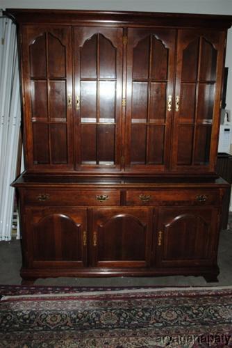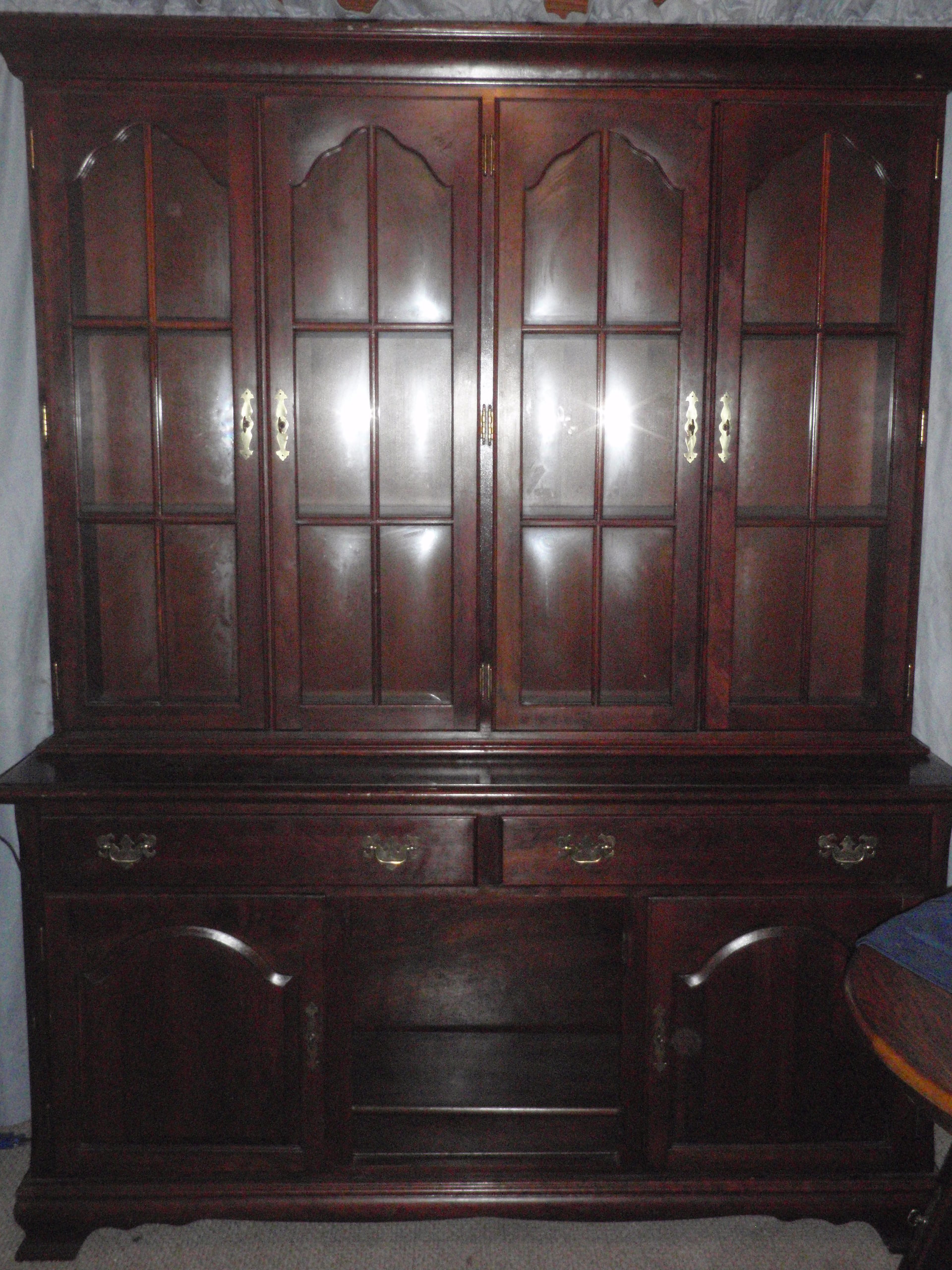 Beautiful China Cabinet with Oneils Dept Str tag stapled on the back both pieces, felt lined divided silver/lineon drawers 4 glass panel doors but individual panes in the door are beveled. Wooden Shlves no lights 3 doors bottom w/ 1 shelf ... BELIEVED TO BE AMERICAN DREW saw exact one on ebay with no marks either also American Drew ..... BUT NO MARKS FOUND ...1 MINOR REPAIR MADE ... reglued middle bottom door ... 1st Photo shows door off... 2nd Photo IS AN ACTUAL AMERICAN DREW ... I CANT TELL THE DIFFERENCE EXCEPT COLOR