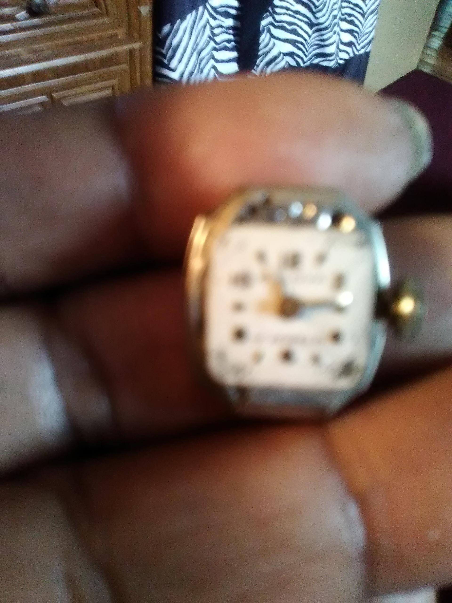 17 Jewels, Movement 6AM, Watch has a push button opens top section to expose watch face. Case Signature Format "Leading Stainless", Movement 6AII, 17 Jewels, Unadjusted, swiss, BXM, Movement date: 1946; Case Materials, Stainless steel, crystals, rhinestone,