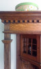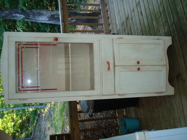 It has a cream colored painted wood surface. Has been repainted at one time in it's life. Has one glass door with two red broken stenciled lines painted from the inside. Behind the glass it has three shelves. Under the glass doors it has one centered drawer with a red hard plastic possible melamine pull that has a small silver metal stars on each side of it holding it on the wooden drawer. Below the drawer it does have two wooden doors with one red knob in each corner made of the same material as the drawer pull and each one has the silver medal star in the center. It has two shelves behind the wooden doors. I would love to know more about the maker and the name of the piece if possible and the date it was made along with a guess as to it's current value. Thanks in advance,