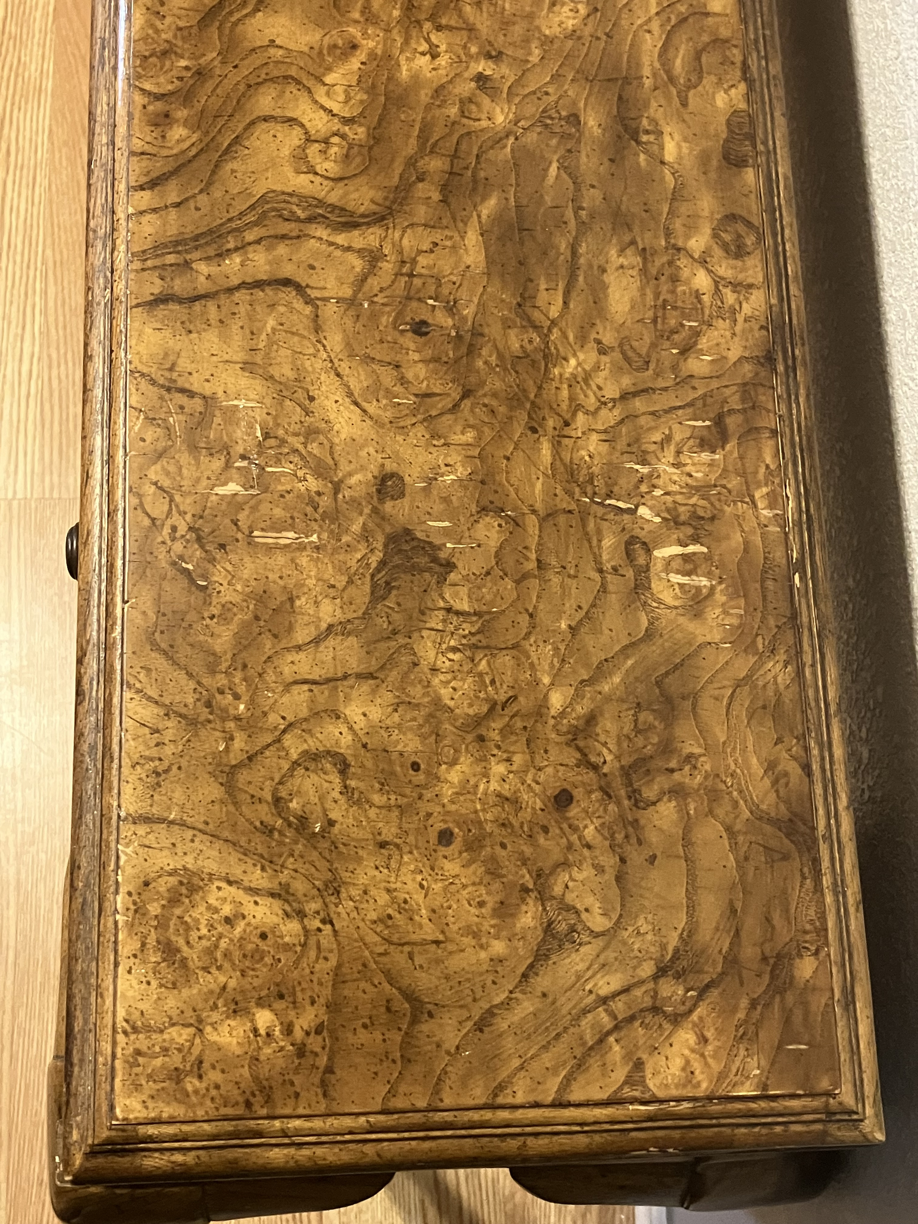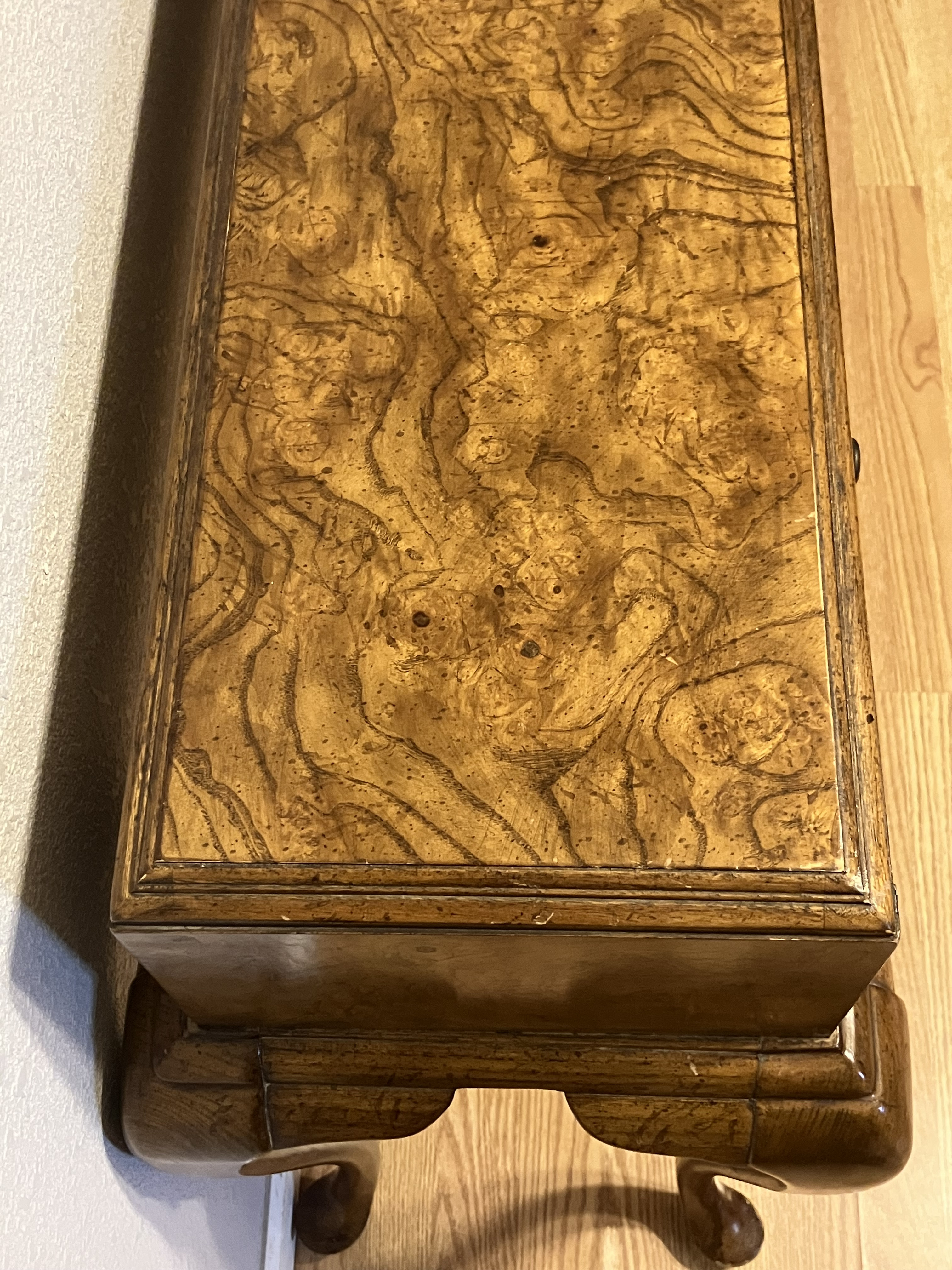 Description American Of Martinsville Burl Queen Anne Style Writing Table Table is structurally sound with minimal deep scratches, but many light scratches which have defected the finish but have not gauged the veneer.