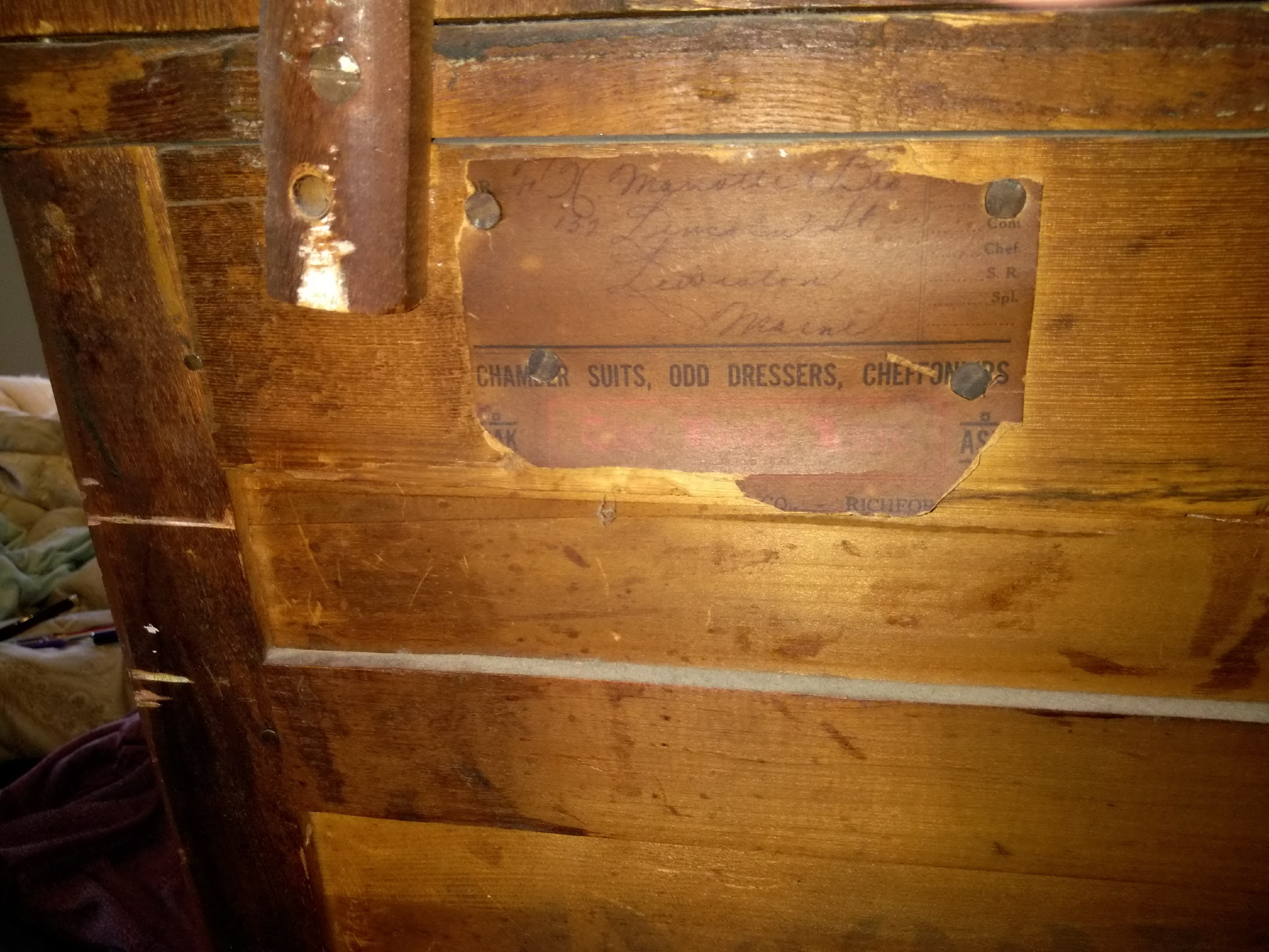 Distinguishing marks Label on back of dresser: F.X. Marcotte & Bro. 132 Lincoln St., Lewiston, Maine. Chamber Suits, Odd Dressers, Cheffoniers