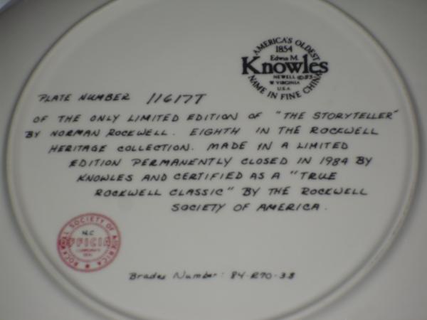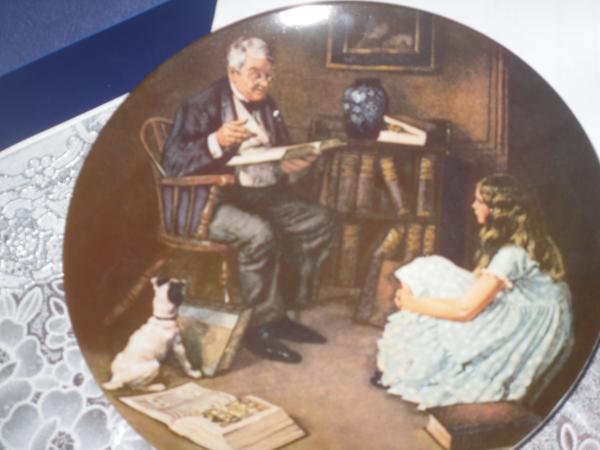 Plate has a picture of an older man reading to a girl and a dog..there's book shelfs with books on the the back has a description and a stamp making it official... I have attached pictures