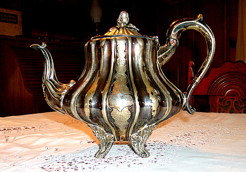 I bought this very pretty and ornate set at a tag sale here in Chicopee, MA. It was made by the Ames Mfg. Company, which was located here in town, and is most notable for their civil war swords, which are very collectible today. (The buildings are still here, by the way, and are being converted to retail/condo space.) I have been unable to find out much about their silver/silverplate, however, and would like to know what this set could be worth. I think it is a presentation set - the medallions are engraved "G....(something, can't make it out)...Morrison". It is in beautiful condition, with the exception of a missing lid on the...sugar bowl? Anything you can tell me about this would be greatly appreciated! Also, should I polish it? Thanks so much for any information you can provide.