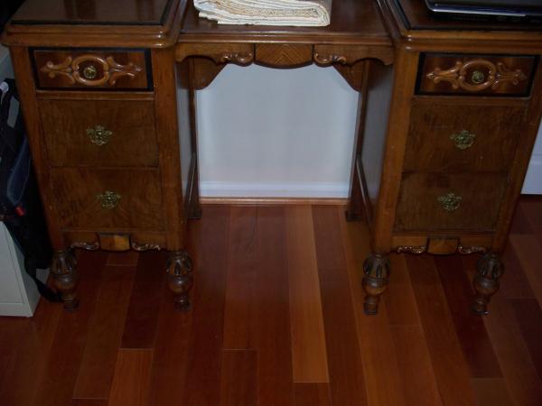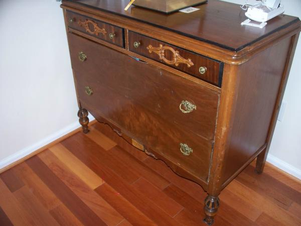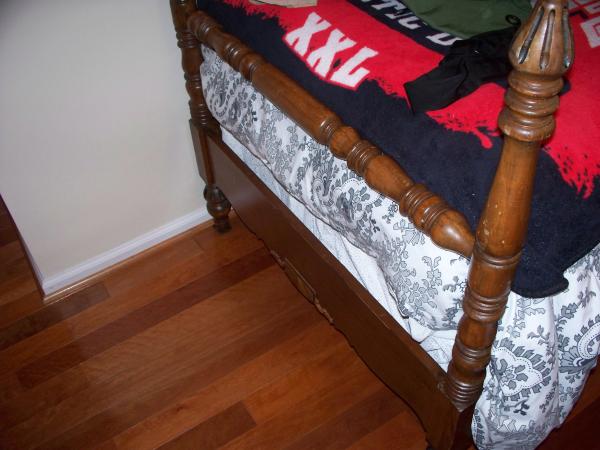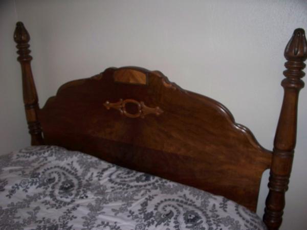 The set has a twin bed, dresser and a vanity type piece.