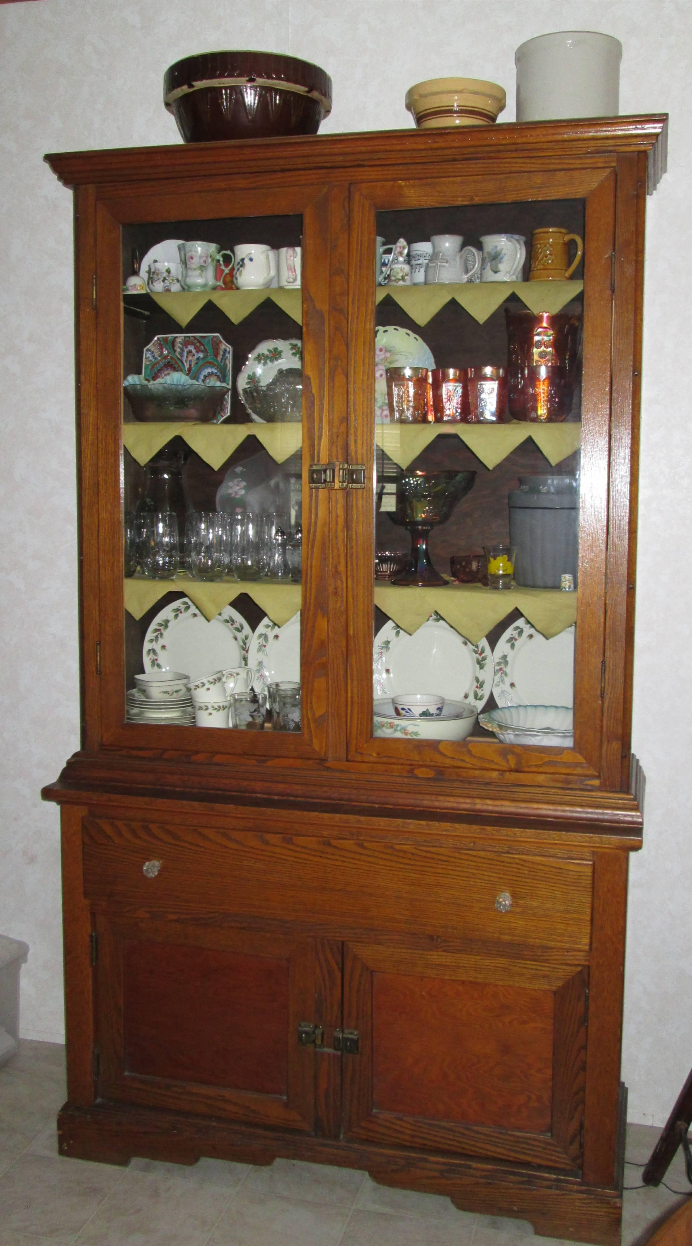 This is a one-of-a-kind piece, built by my Amish father ca. 1942 or 1943. All original finishings and glass. It is in two pieces, with a solid base and the glass hutch sitting on top. It is 42" wide, 14" deep, and approx. 6' high. I have nothing with which to compare it to know its value. Much interest has been expressed in it over the years, but I have not been prepared to consider selling until recently.