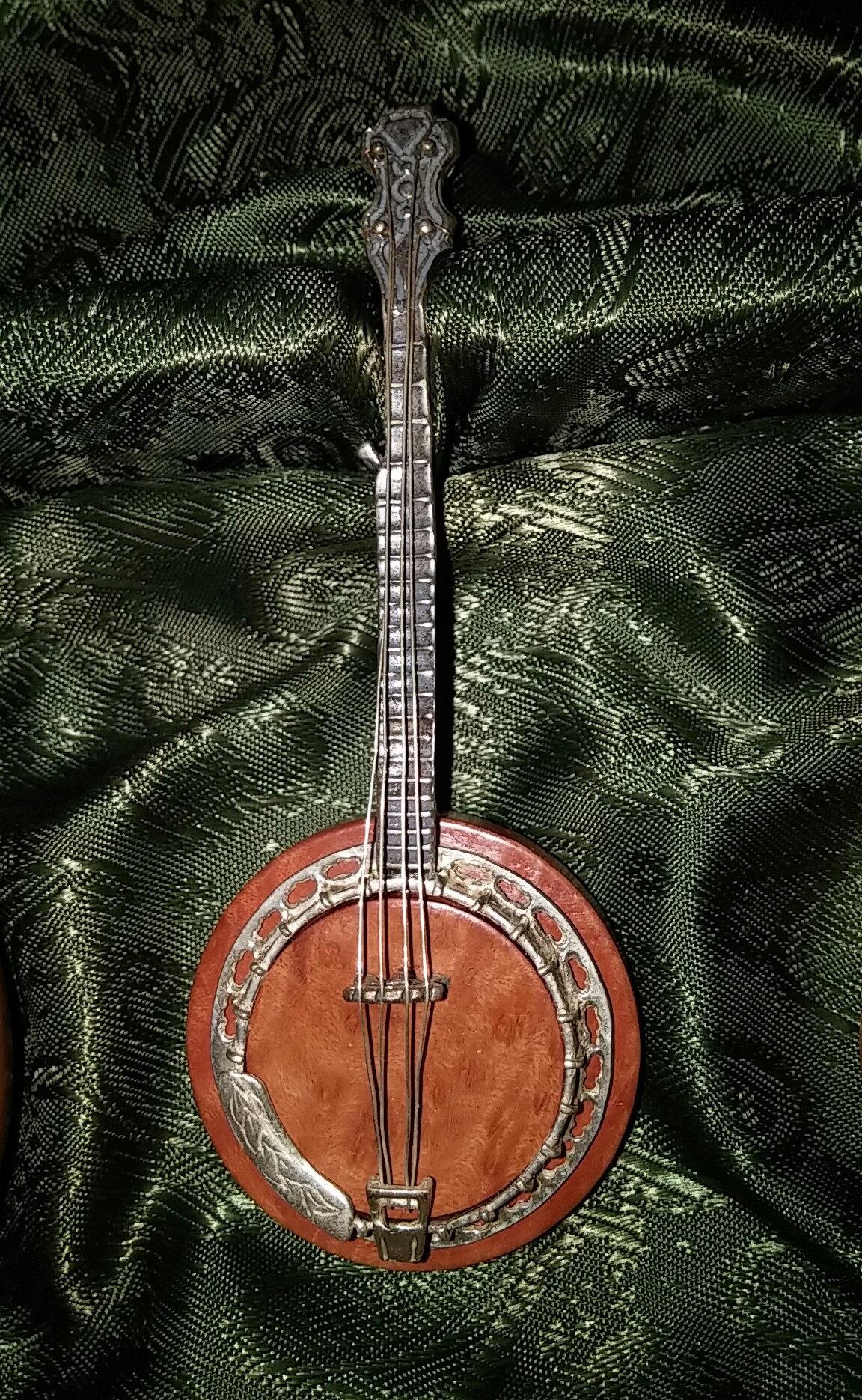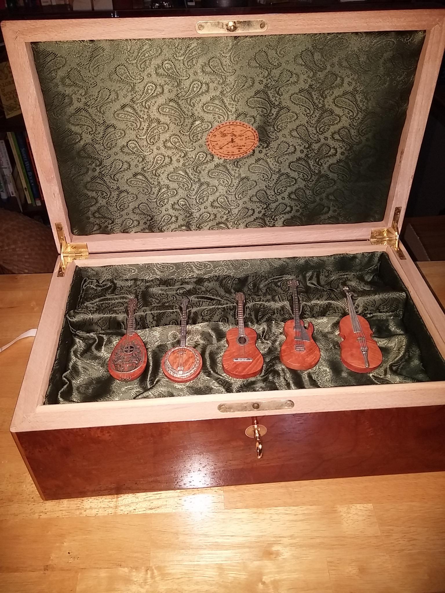 This box contains 5 different string instruments crafted in wood with sterling silver detailing. Each instrument is 4 - 4 1/2" tall. The box itself is a work of art in it's construction and quality. The dimensions of the box are 16"w x 9 1/2" d x 6"h. I would appreciate any identifying information and/or information as to it's age and value. I have had it for ca.5 years and have not been able to find anything that closely resembles it. Thank You!
