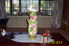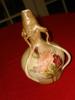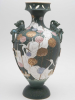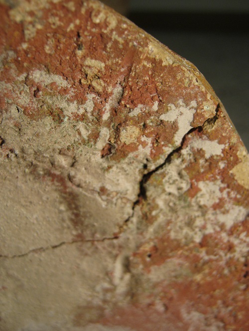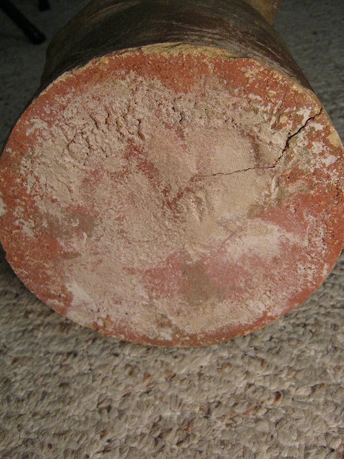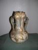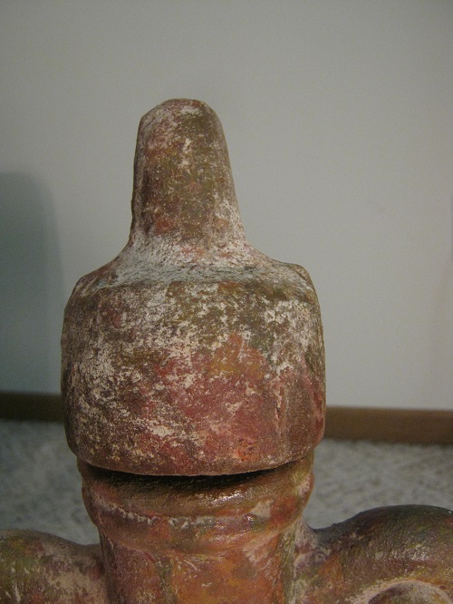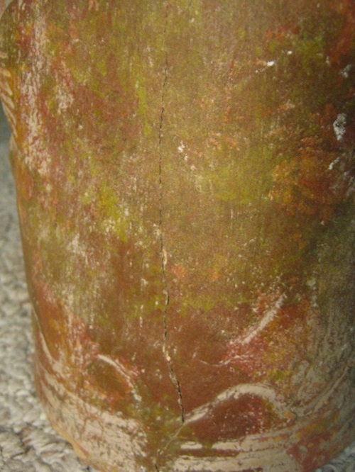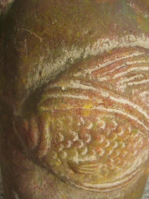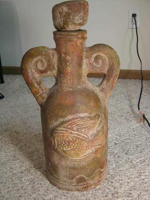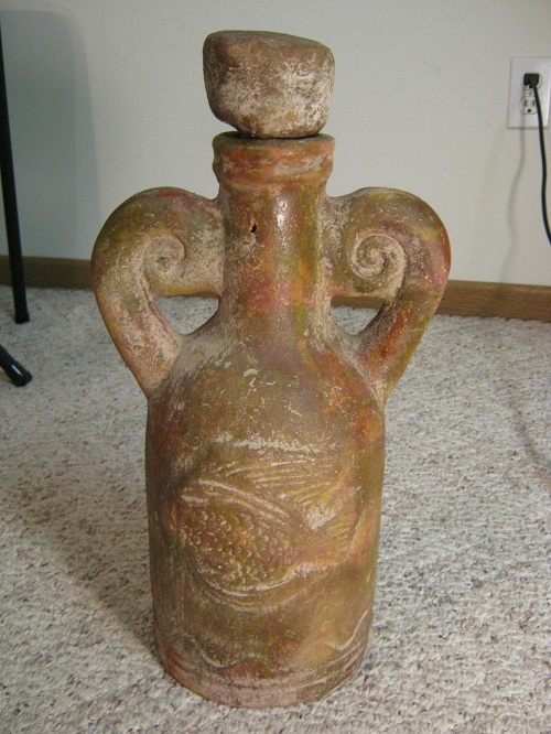 Amphora relief vase with plug. No markings on it that I can see. All of the spirals that connect to the neck are different sizes. There are two fish total, one on each side. They are different sizes. The inside is a grey color. Looks like the colors used were red, green, and yellow. The bottom of the vase looks like red and grey sandy material. Large crack in the side. Plug is an irregular shape. Some areas look glazed around the handles and the rim however the rest of the item is rather rough. Minor nicks and chips throughout. Approximate weight is somewhere between 8 and 15 pounds. 16" height and 7" width at base. Any help would be greatly appreciated.
