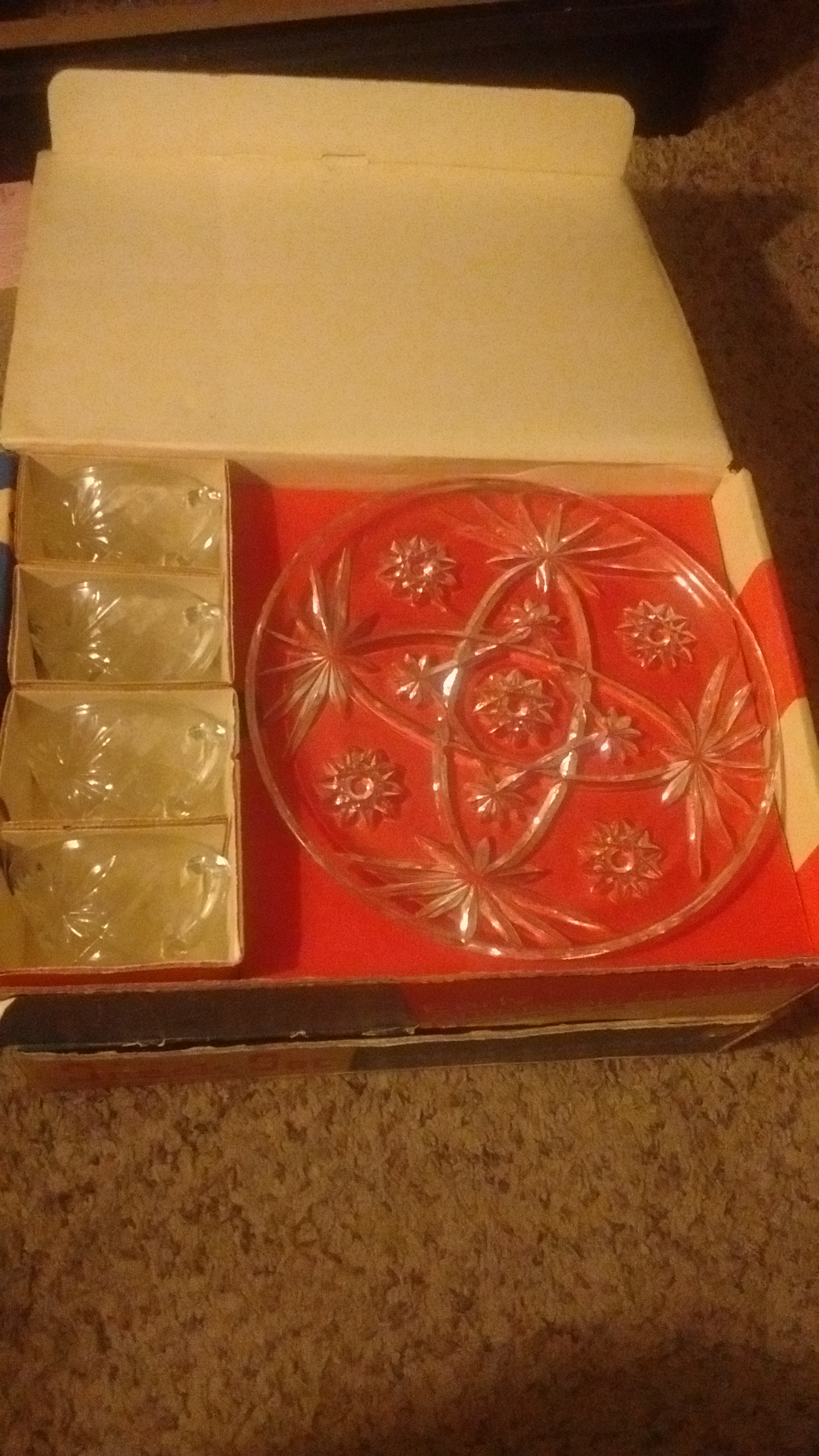 8 peice snack set in original packaging. Never used. Pretty sure it was made in the 1950's.