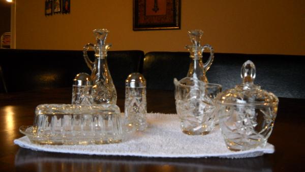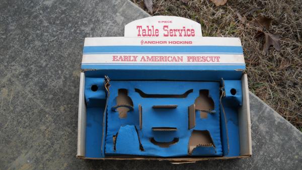 Anchor Hocking Early American Prescut 11 pc. Table Service. Originated in Lancaster, Ohio. Model # 700/720-1/2-C9. Includes butter dish & cover, creamer, sugar & cover, salt & pepper, and 2cruets with stoppers. Set is in MINT condition with original box. Box is worn.