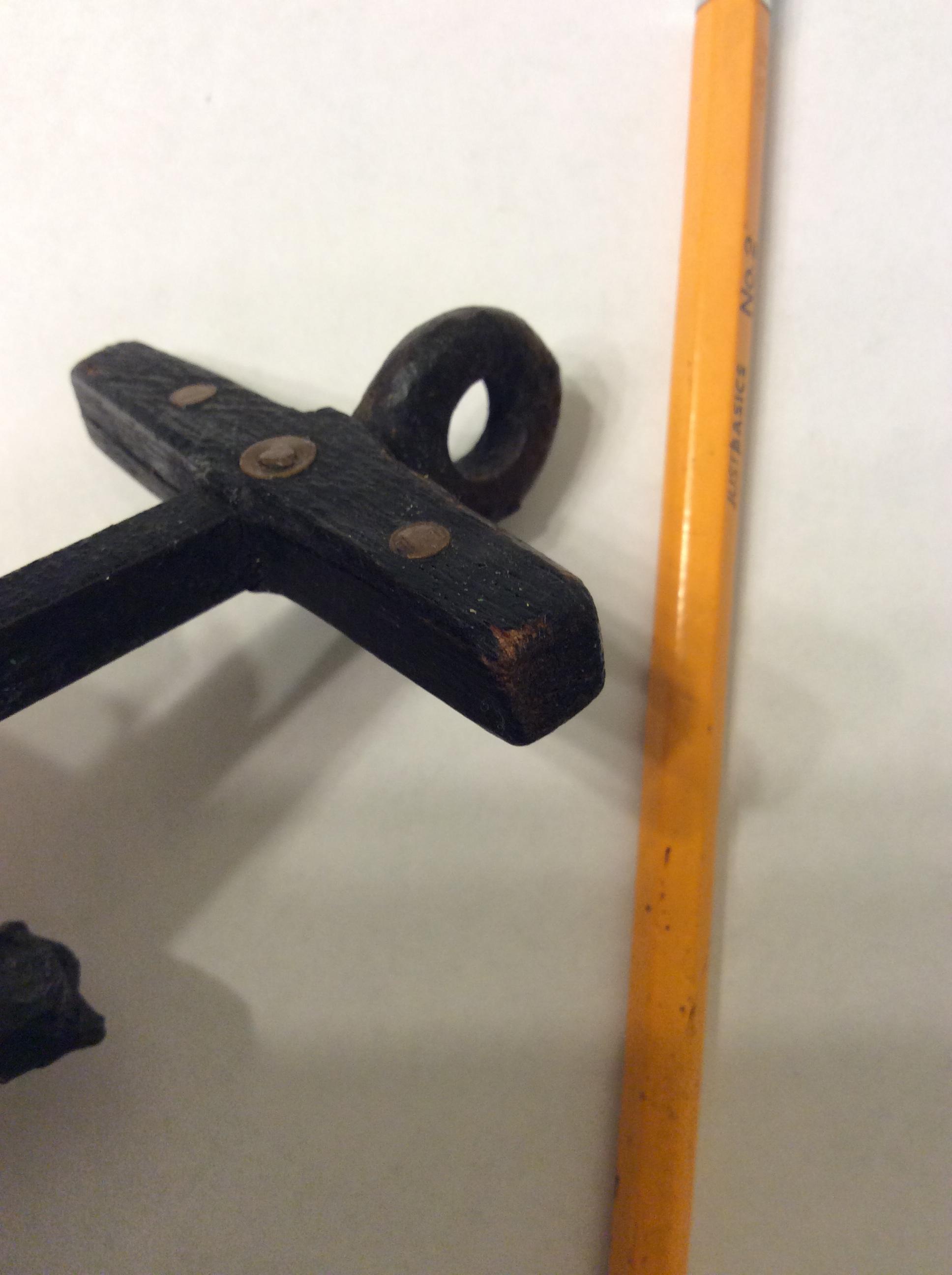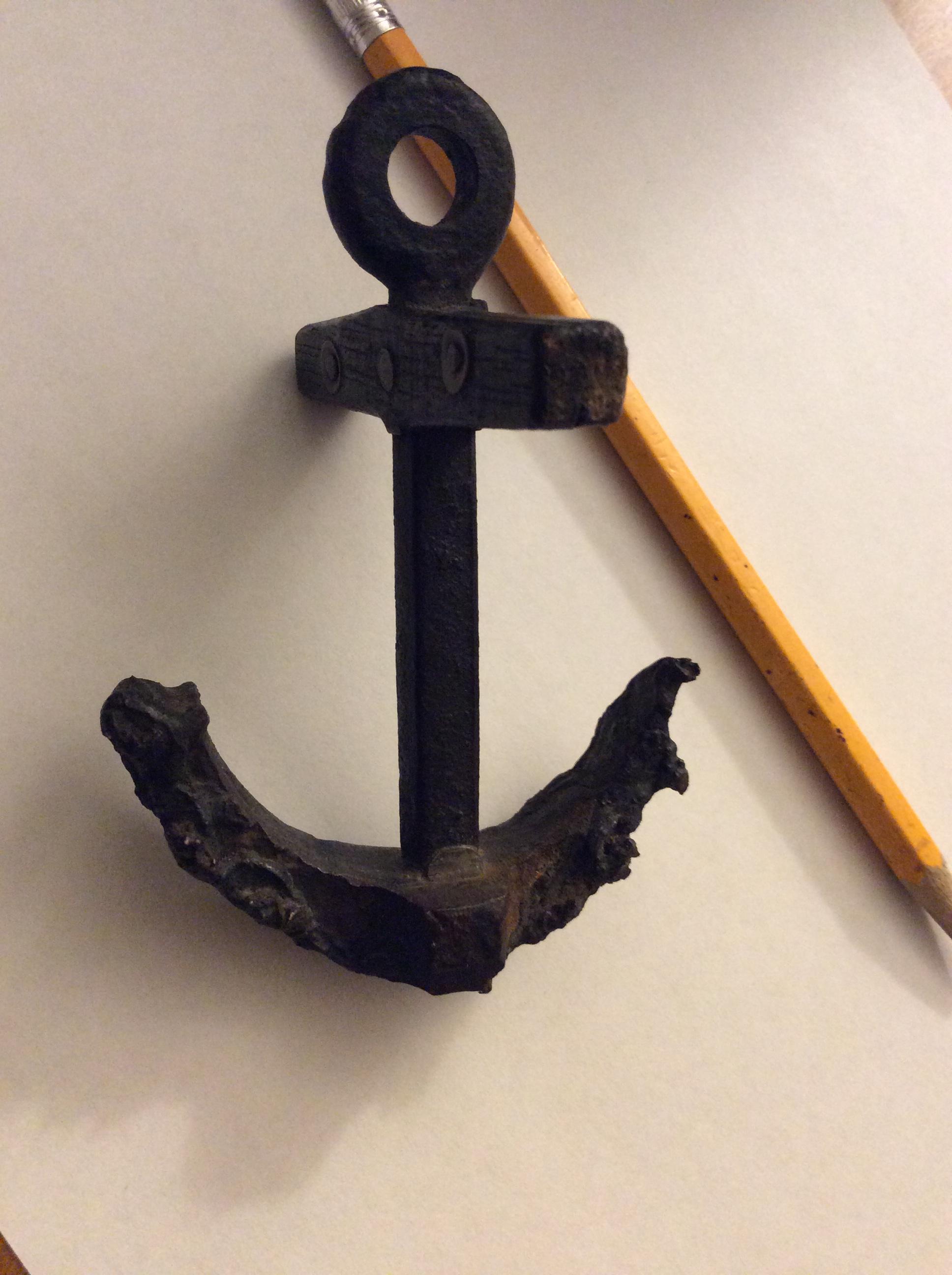 In a foundry somewhere in America (maybe 15th, 16th century), most likely northeast Americas, there was a foundry, a little boy and a big man. 'Twas probably a hook for hauling ore to the vat. When da man burned it to almost unuseful the boy can have it. What a cleaver boy, he attaches a stock to the anchor shank. And sure it is wood as that is the exact way of anchors on ancient Mariner ships on that day. So the boy fastened and changed the hook to something useful, a toy. He was proud, as was the man for now his boy may help in loading the ore.
