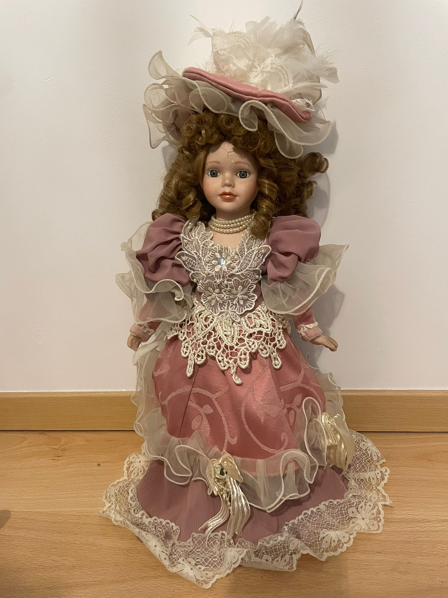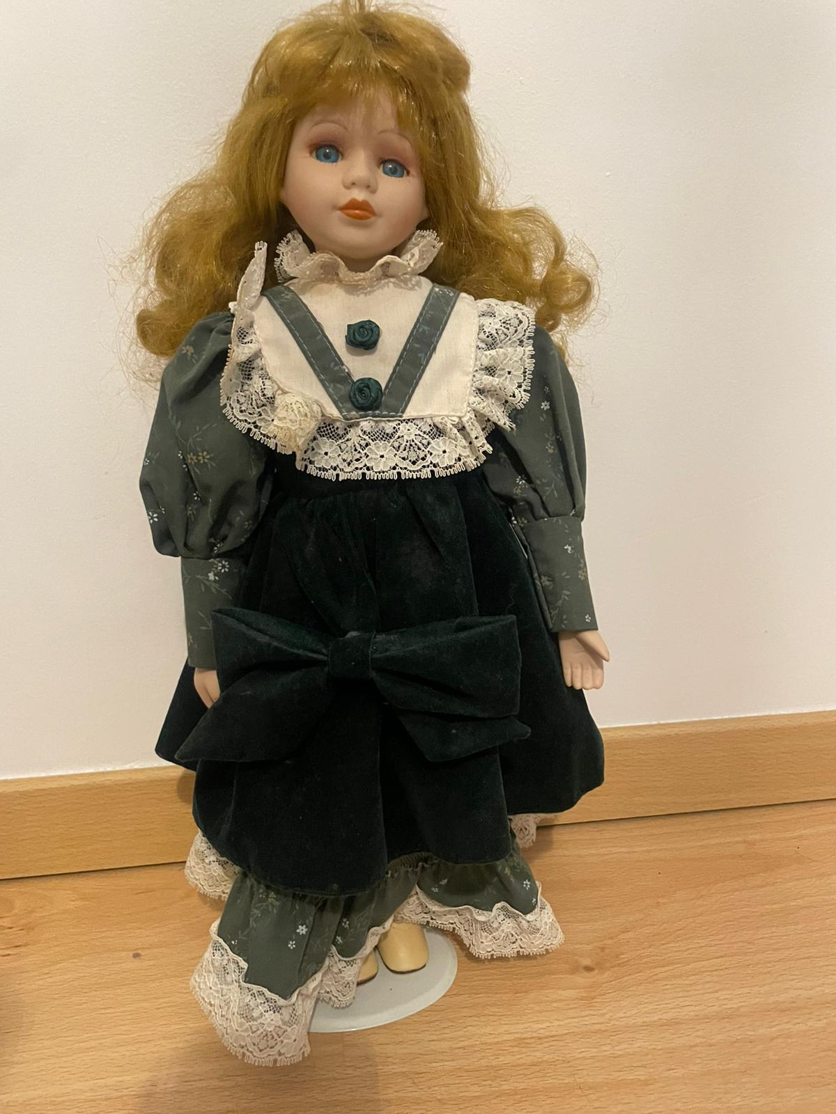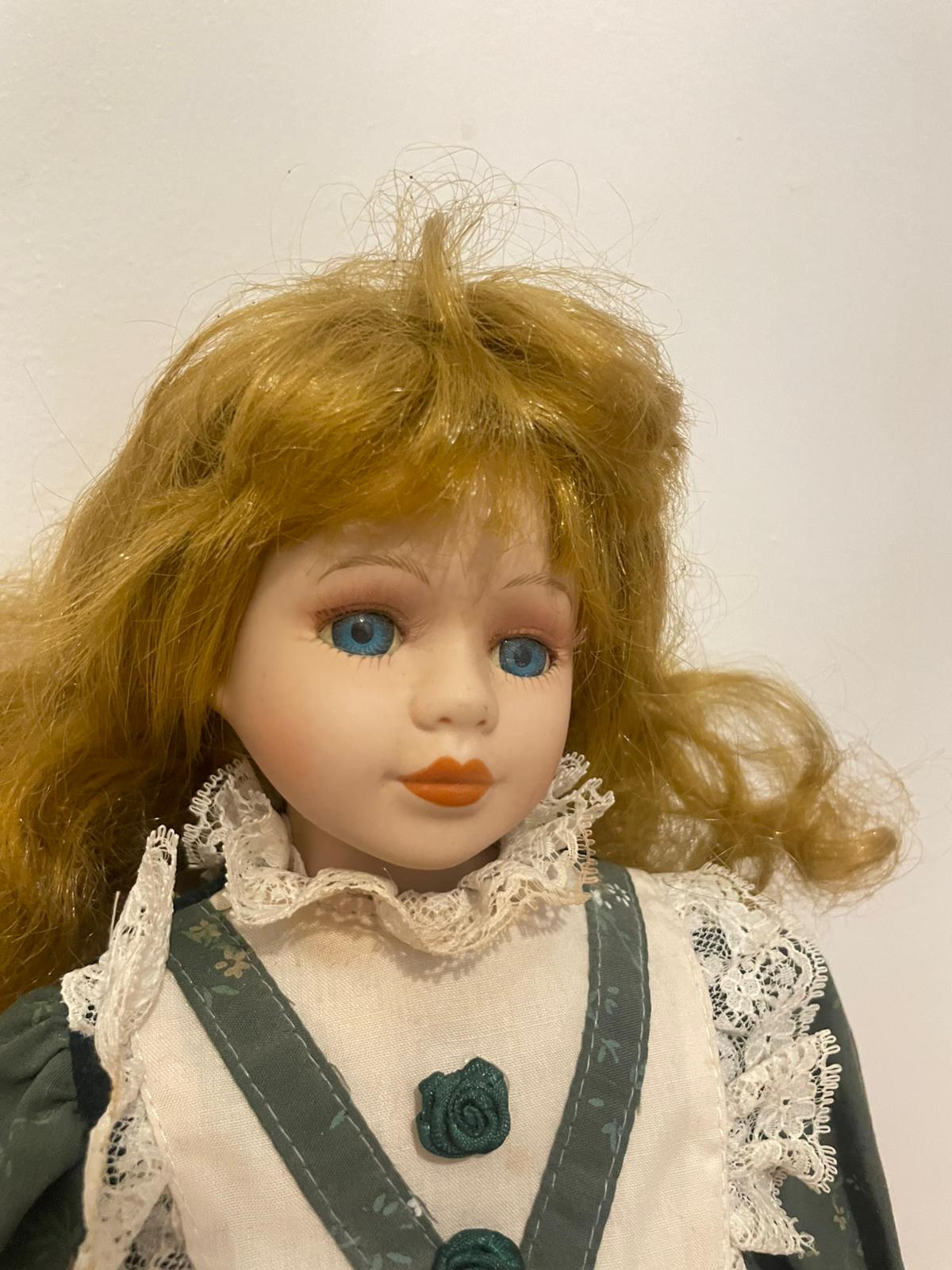 The doll is in good condition with minor wear. The clothing shows slight fading, and the hair may require some styling. Overall, the porcelain head is intact with no visible cracks or chips.
