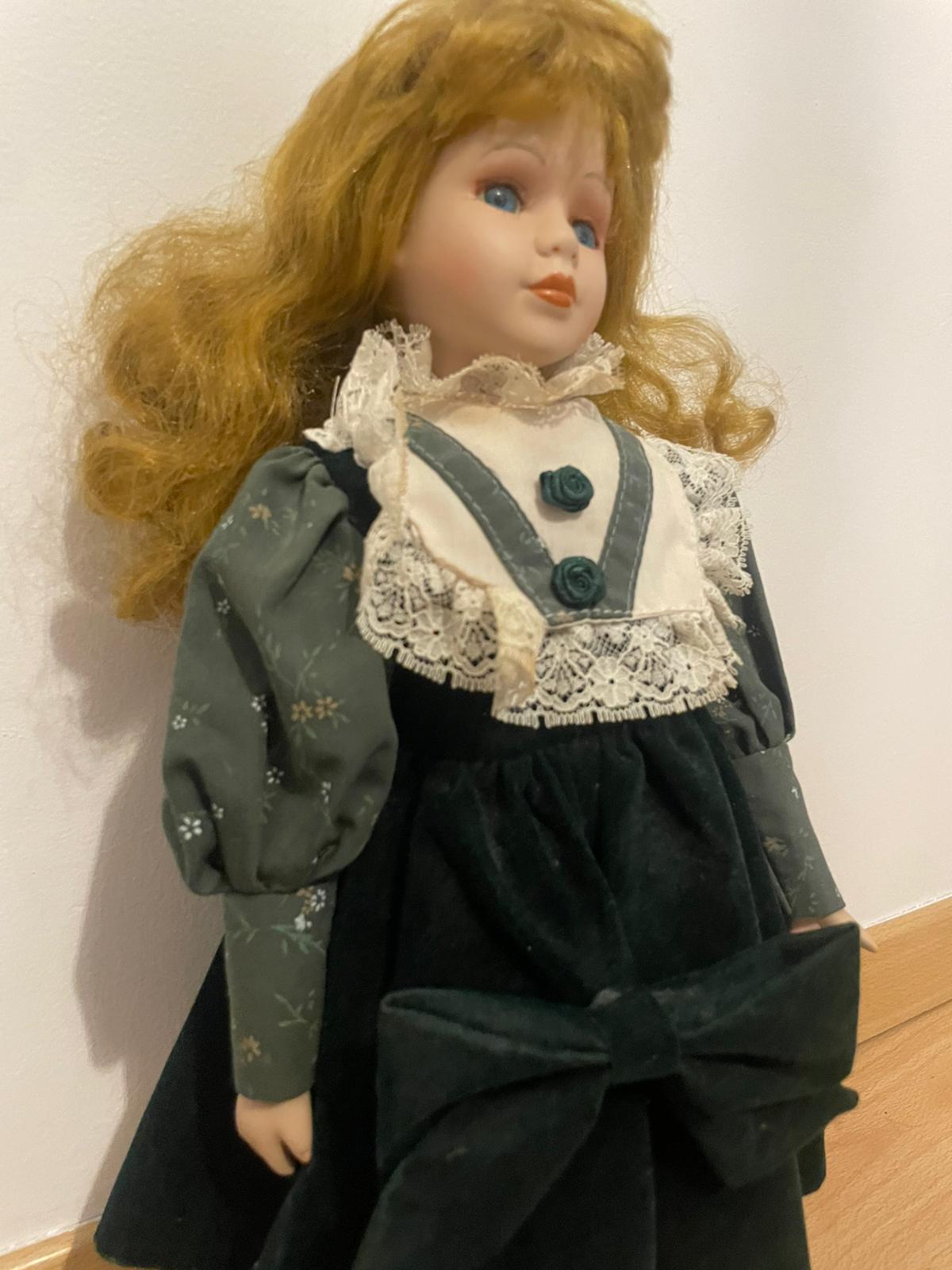 Physical Description: This antique doll features a porcelain head with painted facial features, including blue eyes and rosy cheeks. The doll is dressed in a dark green velvet dress adorned with lace trim and floral patterns. The dress has a prominent bow at the waist and is complemented by a white lace collar. The hair is styled in soft, wavy golden locks. The doll stands approximately 24 inches tall.