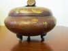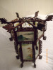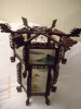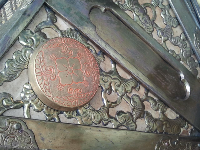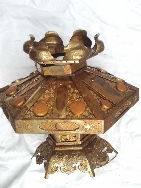The lantern is electric. It hold 45W bulbs in the center. It appears to be gold and copper plated perhaps. There is significent aging effects to the metal.