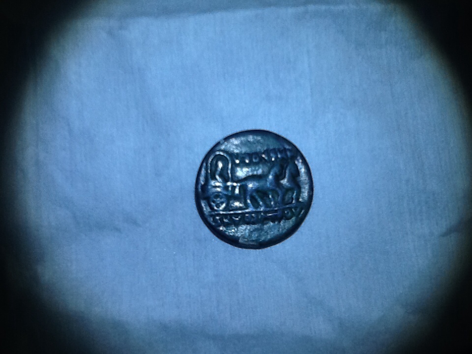 Not sure of the actual age or material. It is for sale here in Afghanistan. I was told this is a rarer coin fromthe others found in this era due to the animals pulling the wagon on the back of the coin.