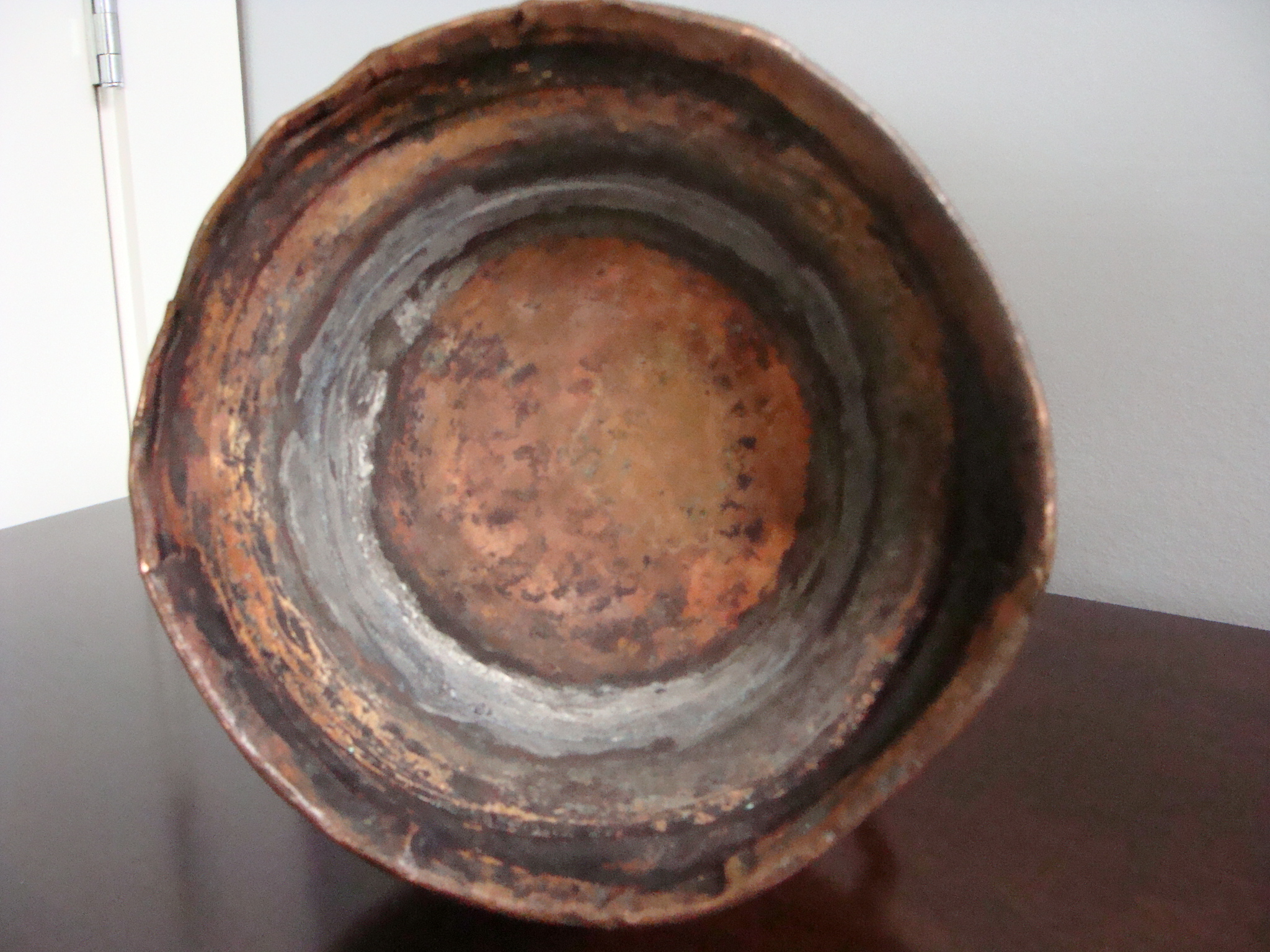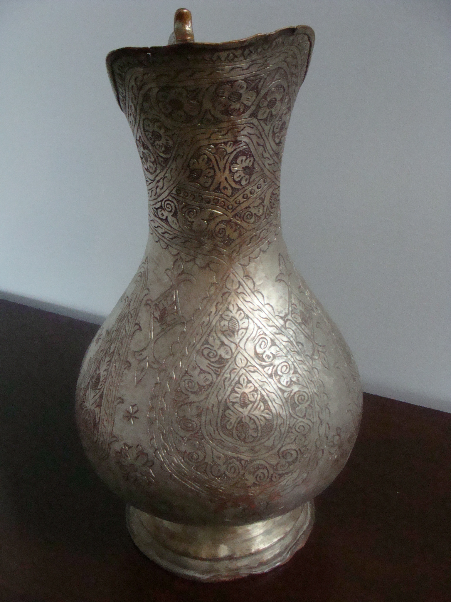It has some rust on the bottom and a few rusty spots on the outside. A very detailed engraving encircles the pitcher.