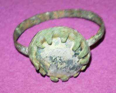 This is an ancient Roman ring that came from the year 500 or 600. I believe the metal is bronze and the stone is not blue; it is actually an extremely deep green, the same color as an emerald. I think it is a glass stone, but I am not sure about that. While I am not selling this ring, I would love to see whatever information that may be available about it: a more accurate year, how much it may be worth, whatever history that can be found about it.