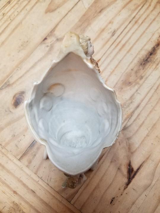 Angle or cherub vase made of Porcelain? Pottery? it is peach and white colored. Very unique with the wheels under the vase. I do not see any makers mark and do not know the value. It is approximatly 7 3/4" T X 7" at widest point