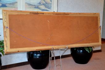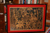 It has an embossed 3D-like appearance. Appears to be in great shape. Mounted on what appears to be plywood and framed. The framing is in fair condition.