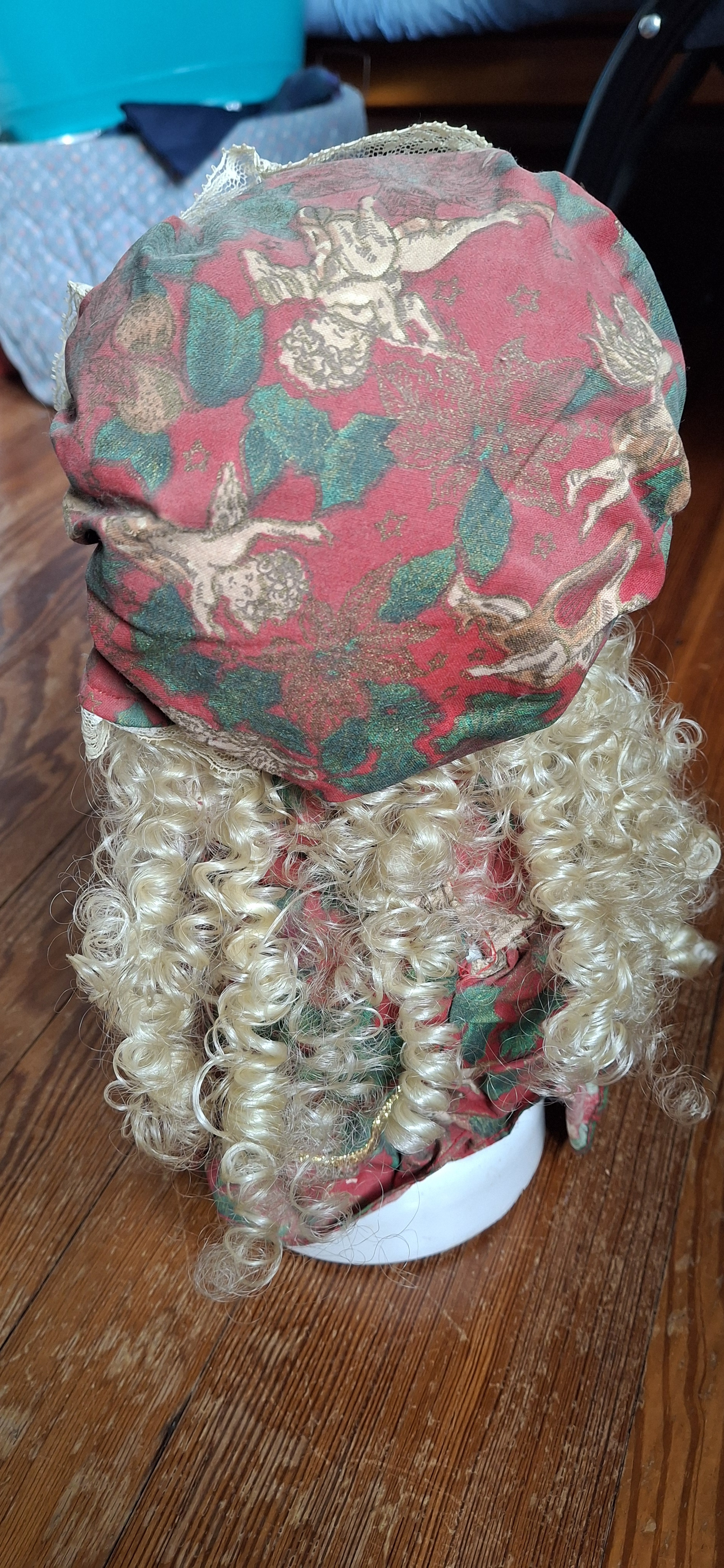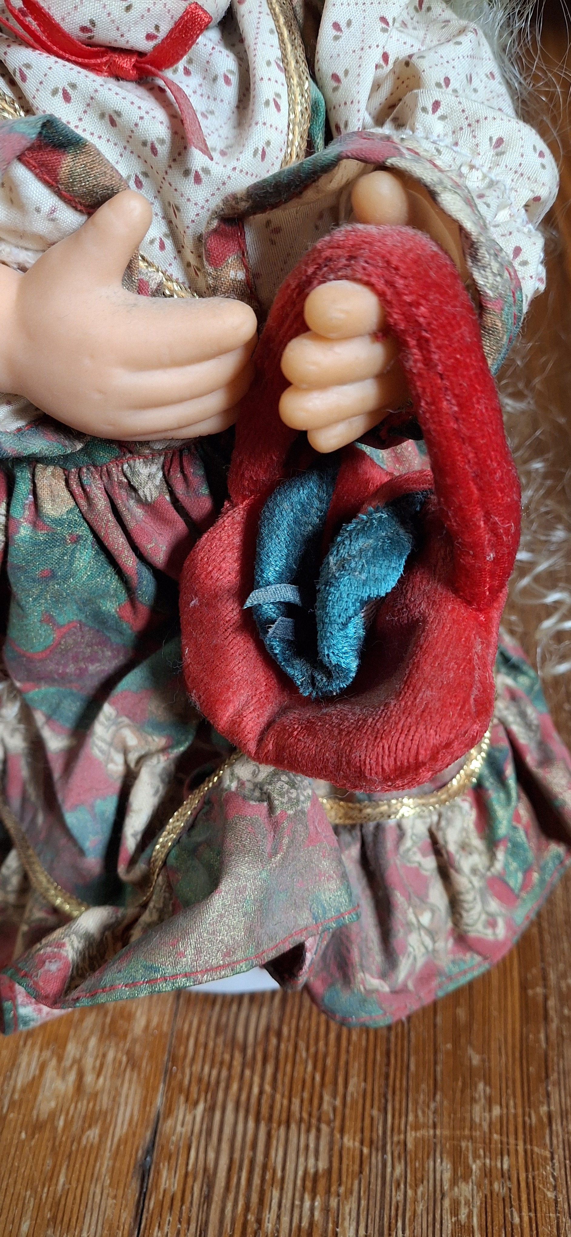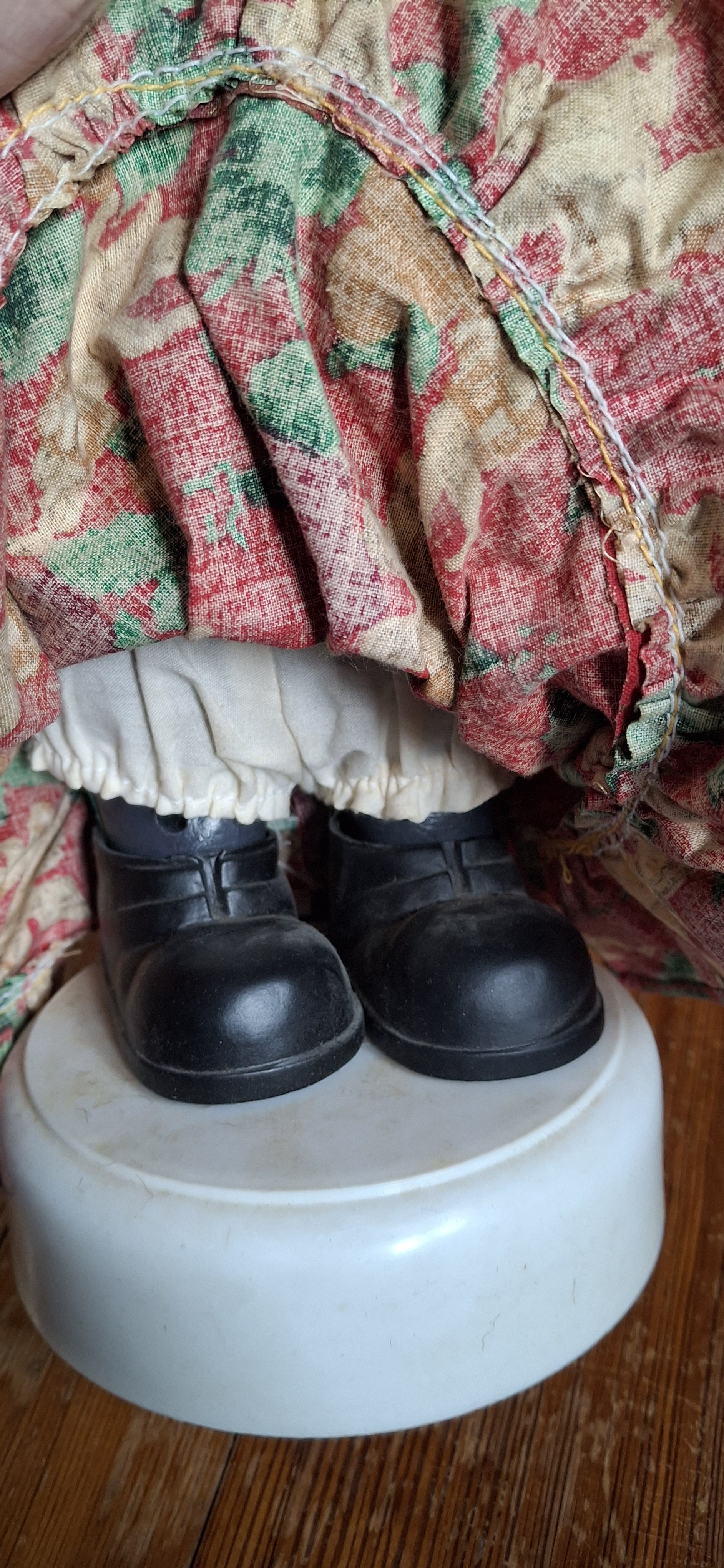Vintage Padma animated christmas motionette girl doll. Motion-activated head and arms. She has a soft vinyl face with freckles, and curly blonde hair. She also has festive holiday clothing.