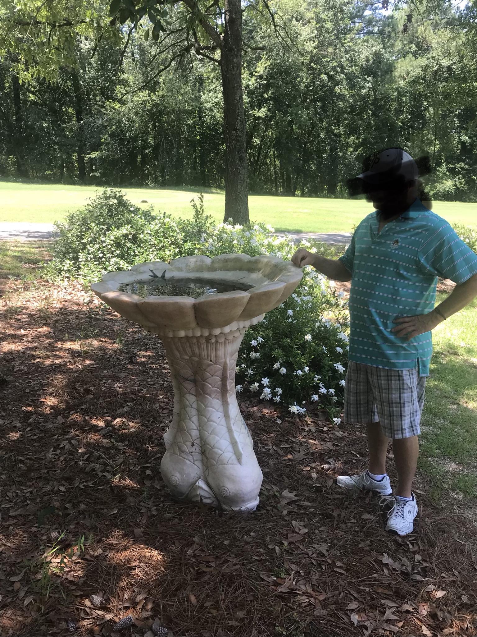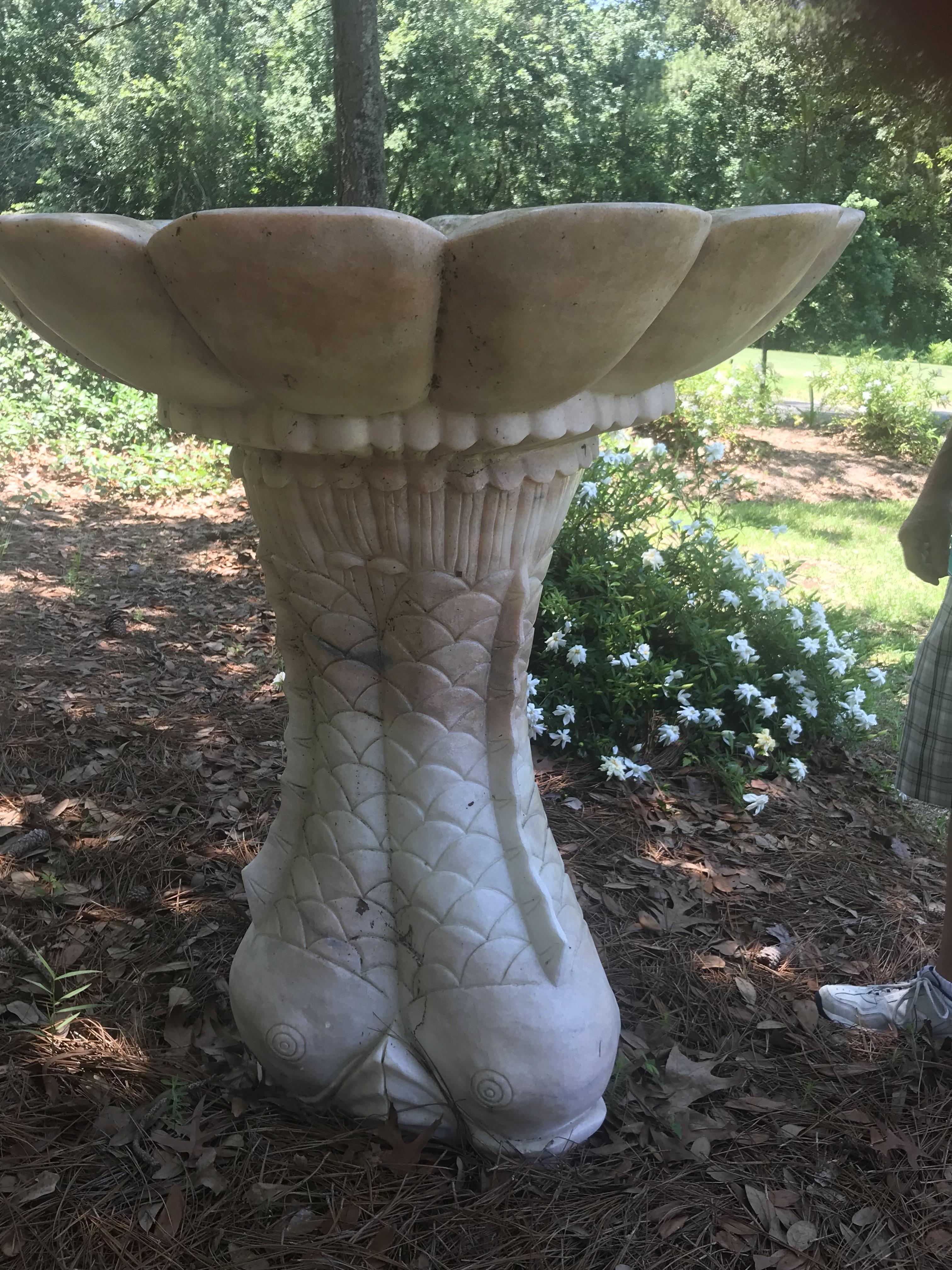 Hand carved pink marble bird bath. Not much history is known. Large heavy three fish base. All one piece.