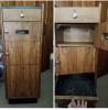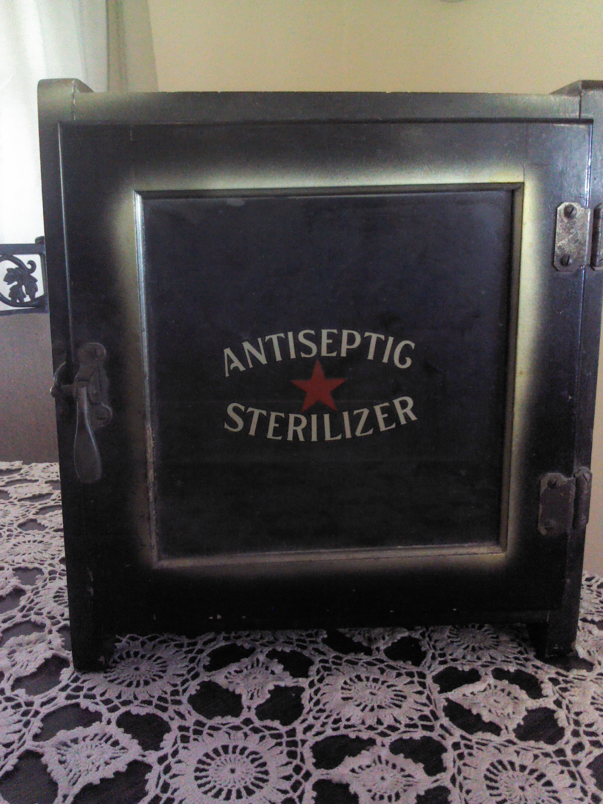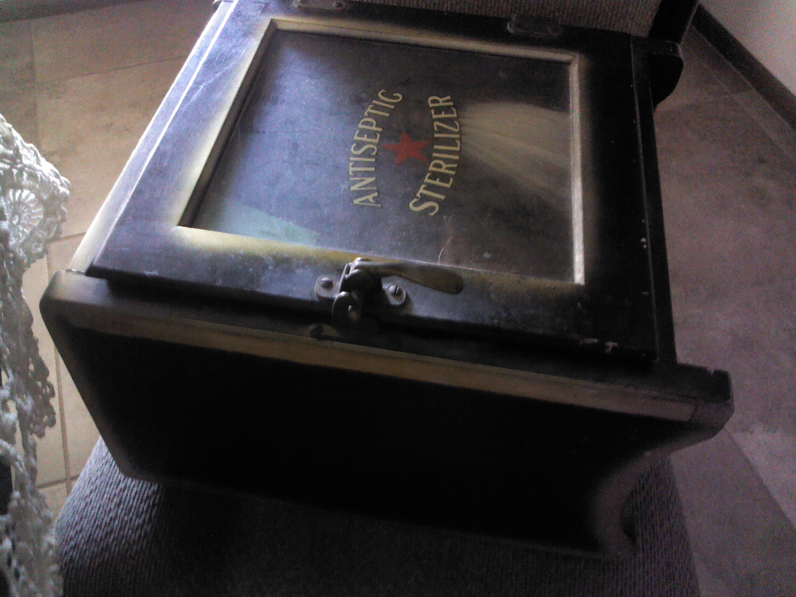 possible 1920-1935, black wooden cabinet, was in a beauty shop. box has a few dents. glass writing is perfect. door hinge's are tight, no slop