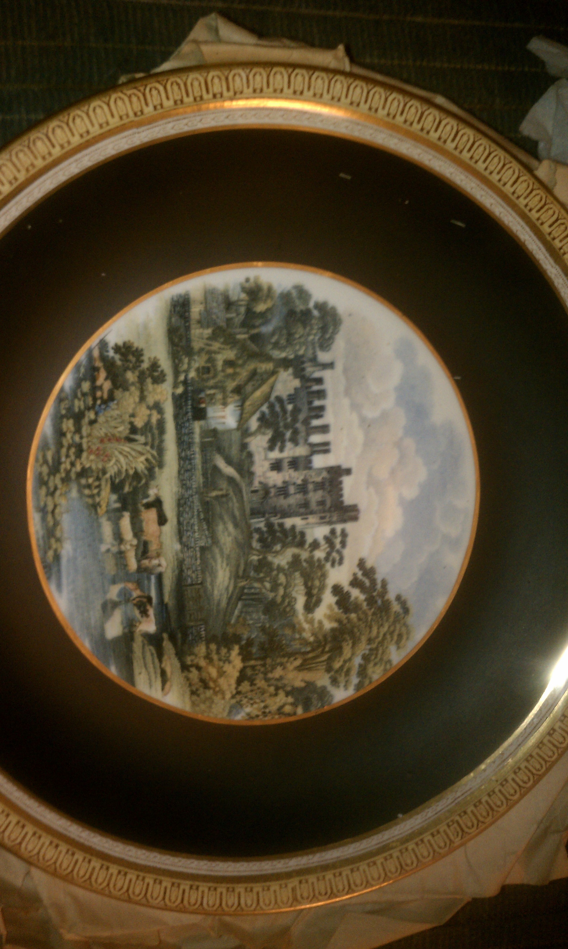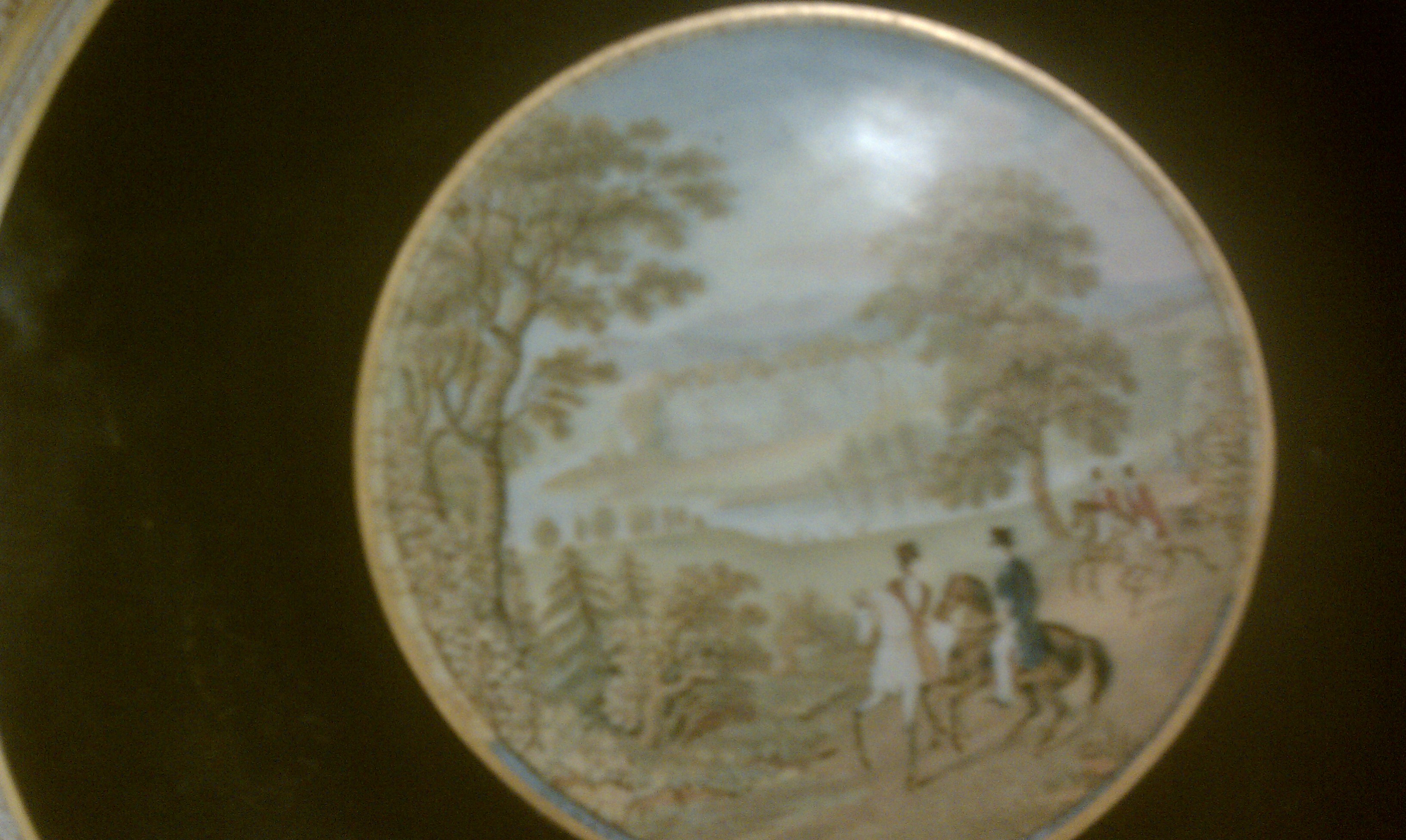 one is a stream with animals grazing. One is a castle, and the third is two people on horse back. there are no markings on any of the plates that I can tell.