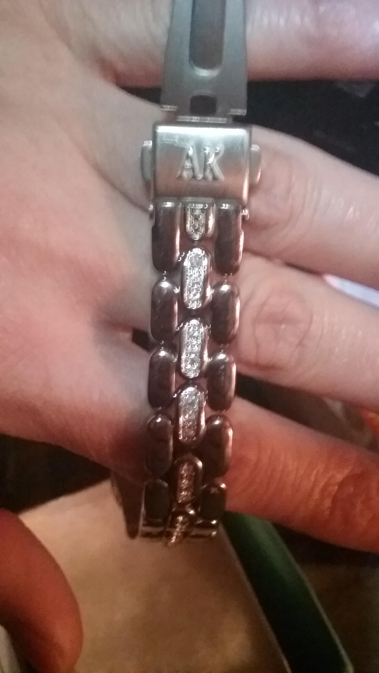 Beautiful woman's watch with gold wrist band with diamond strip down the center of band.
