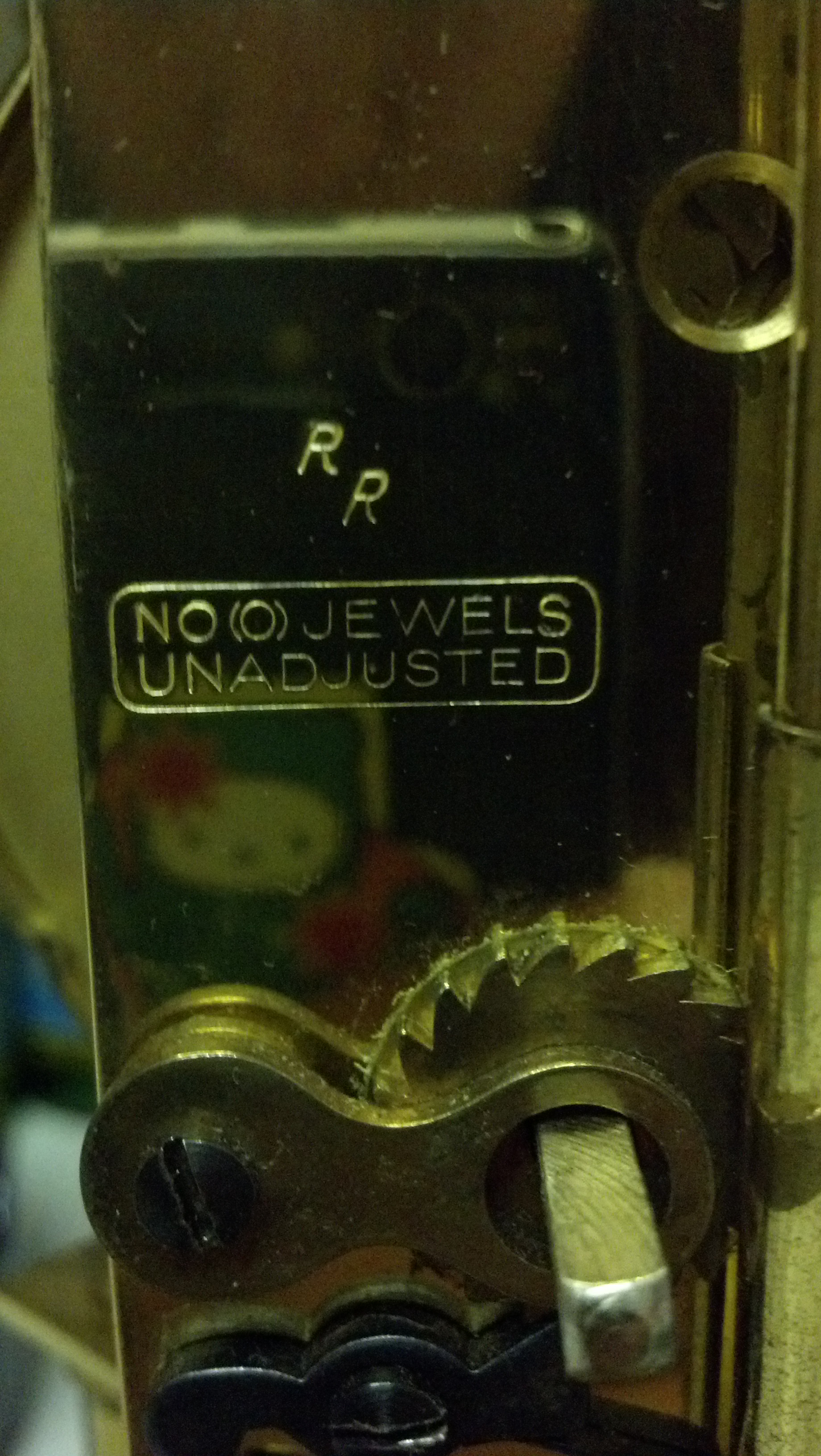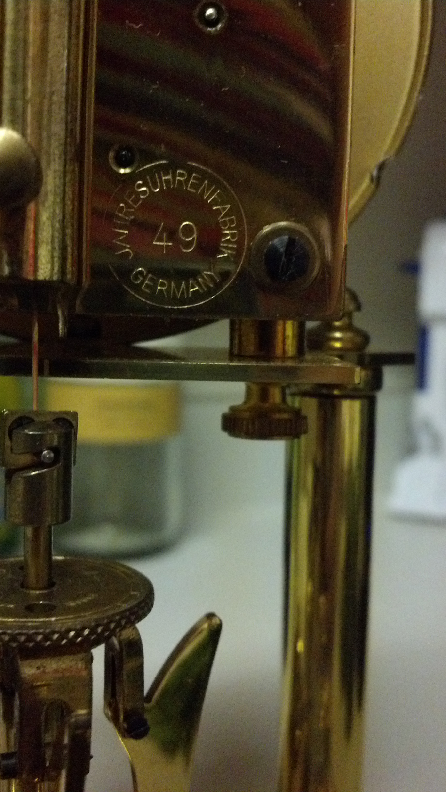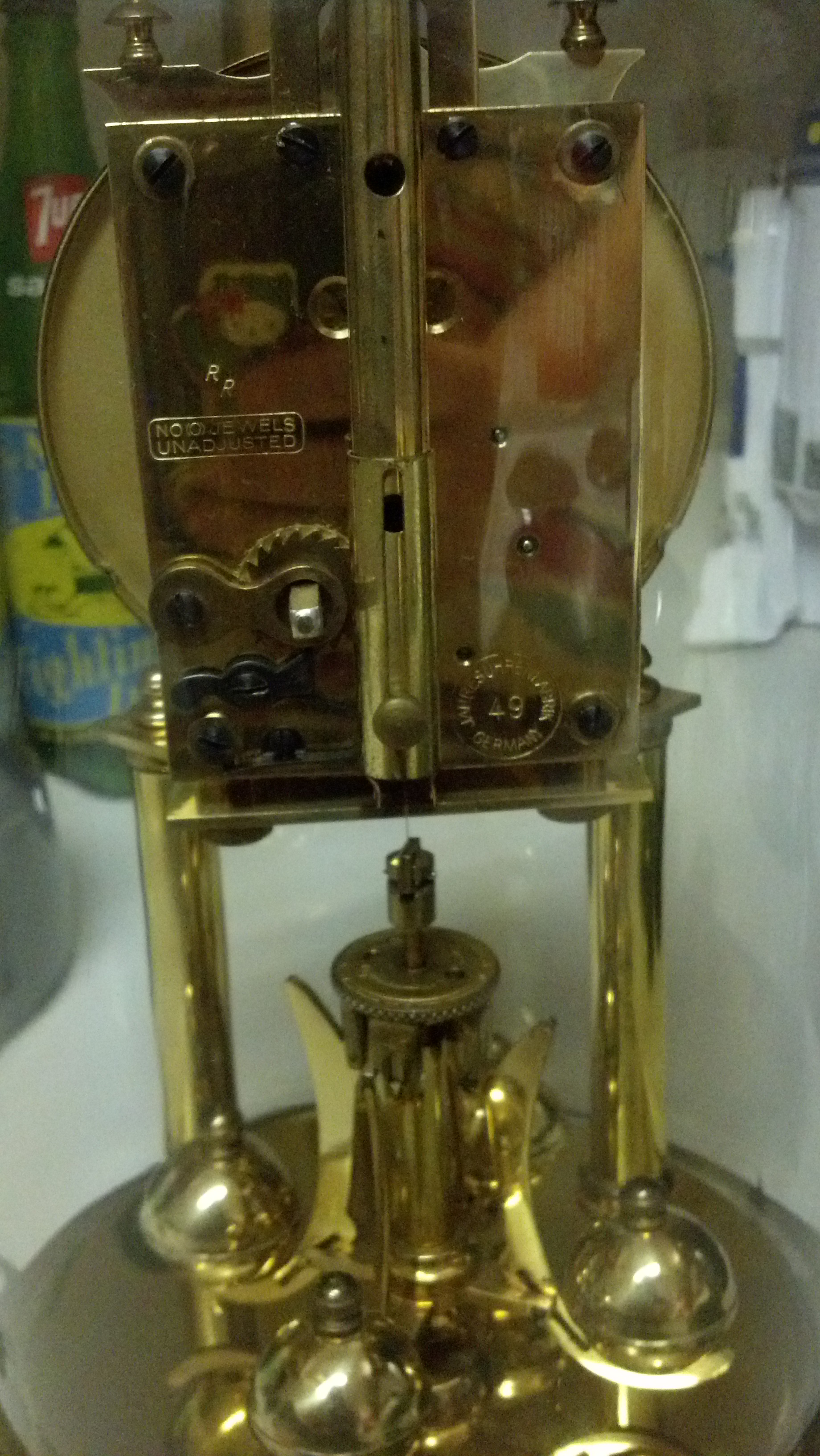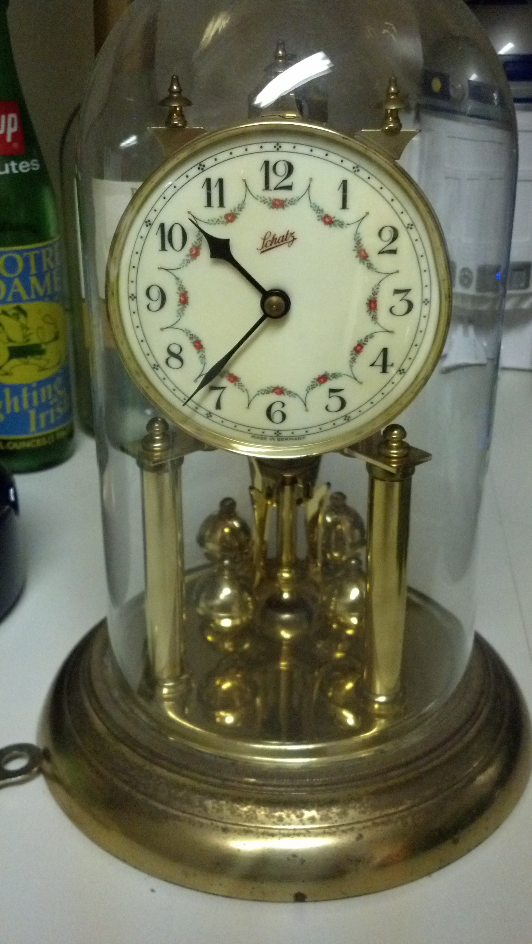 Glass domed anniversary clock in decent condition, Schatz brand, has some markings on the back as follows: "JAHRESUHRENFABRIK 49 GERMANY" in a circle. Also, "NO (O) JEWELS UNADJUSTED" and "RR" above that. Has original glass and key. Cannot wind it I think it needs to be losened or something.