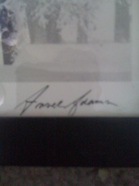 IT is a signed photograph of trees covered in snow. Ansel Adams