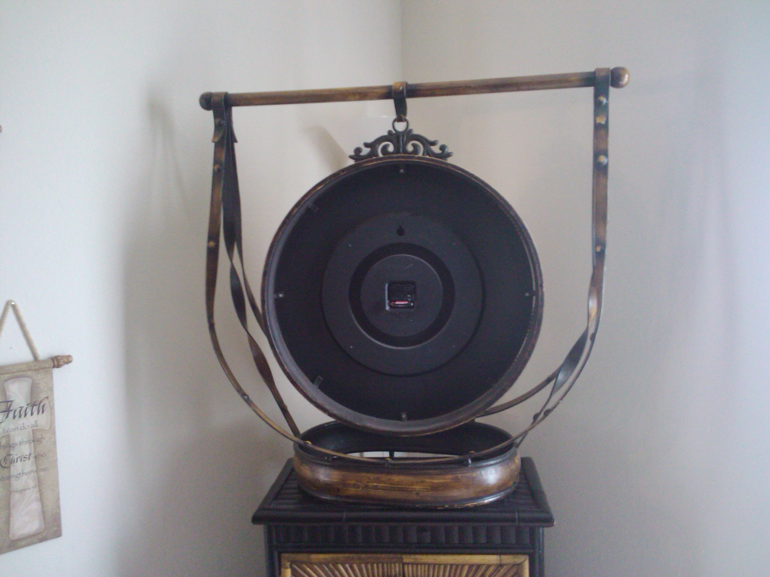 36" base stand 72" circumference 20" diameter clock. Brass or metal finis. A label was once in place but not present when the clock was purchased. I have searched many sites and antique shows and auctin  and to no avail have not discovered anything this massisve.