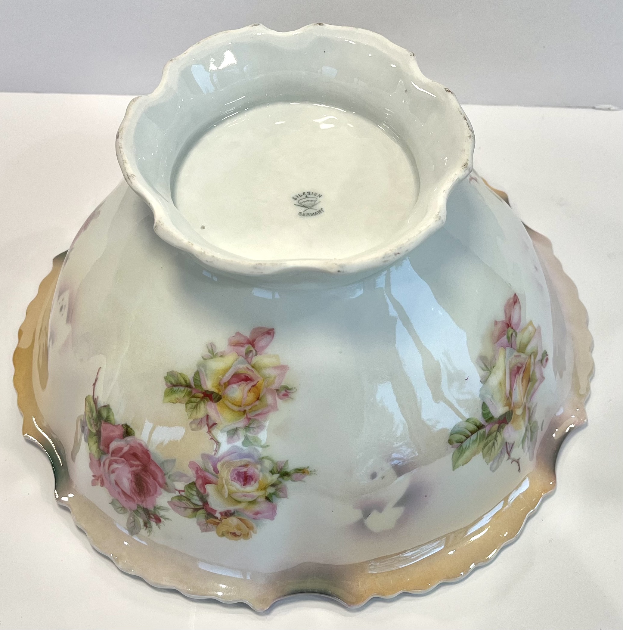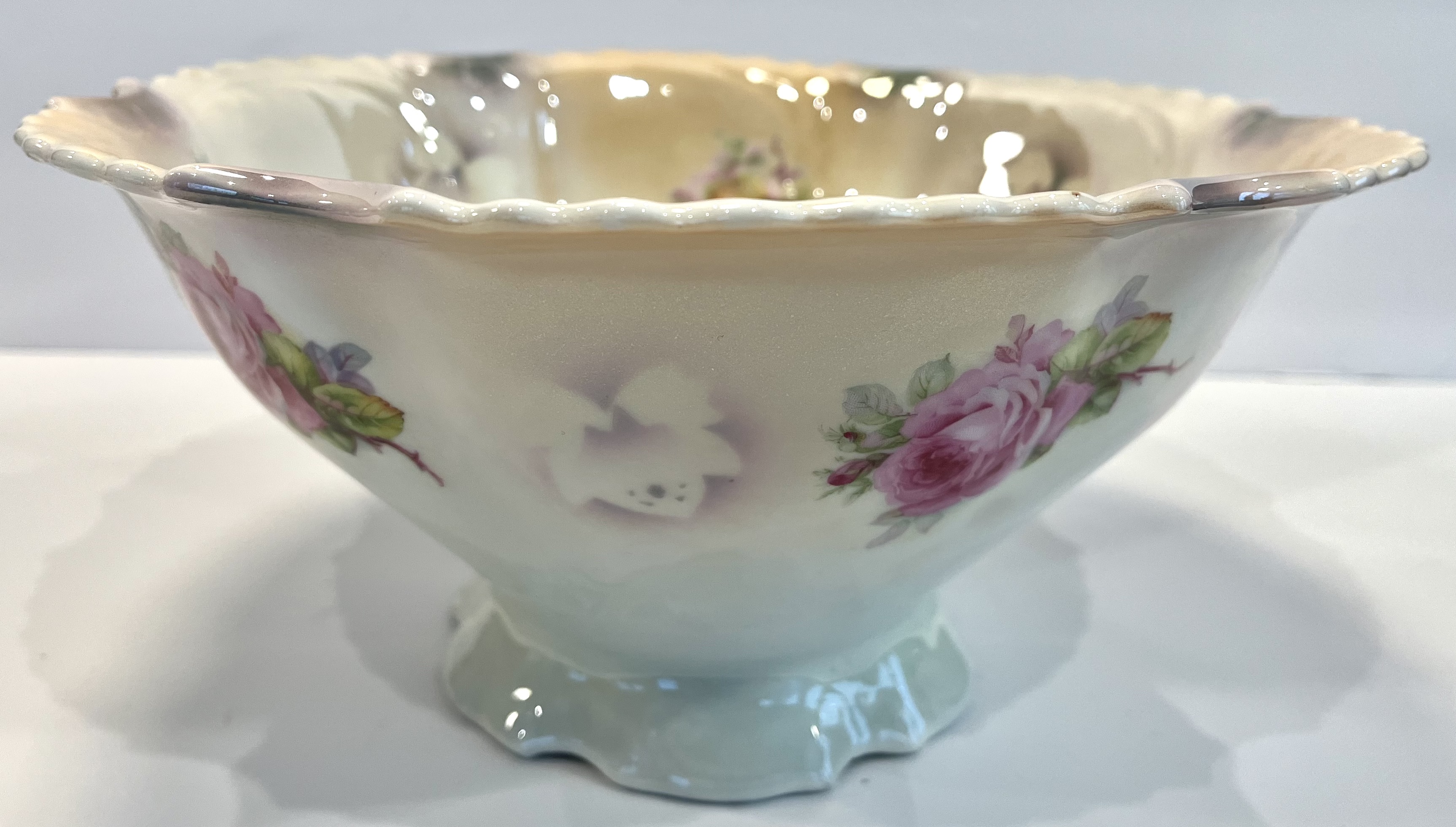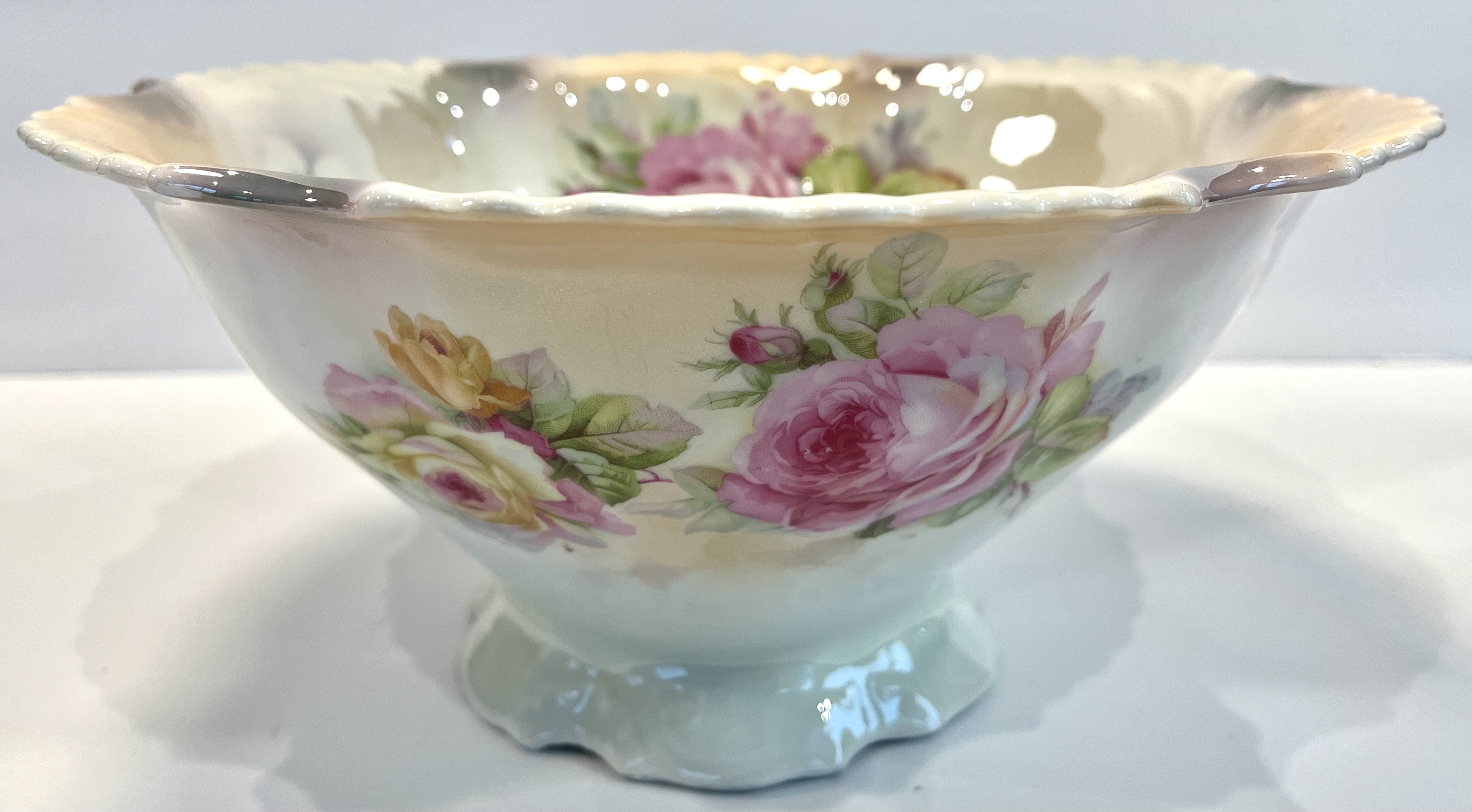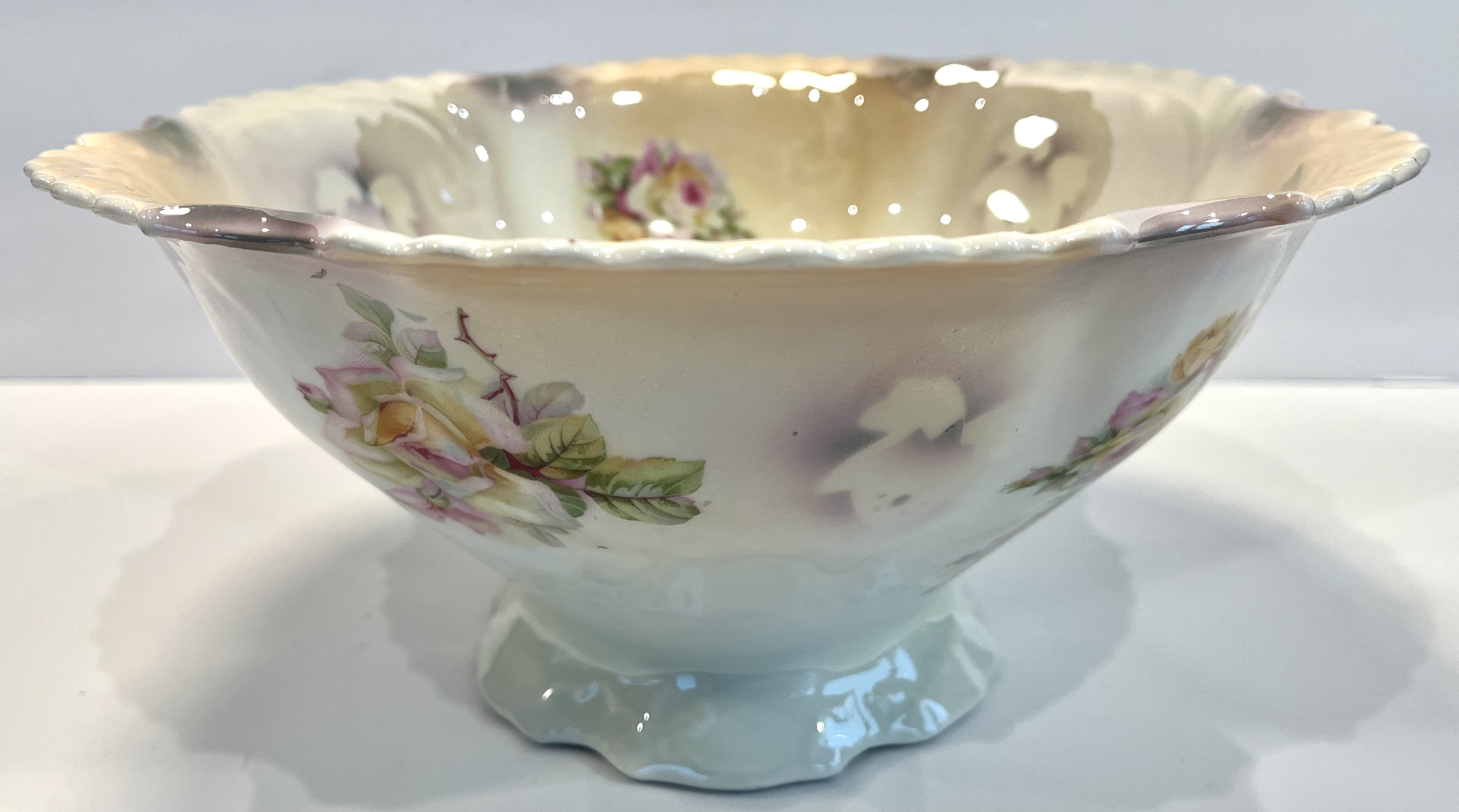 This exquisite antique bowl features a delicate floral design, showcasing a blend of soft pastel colors. The bowl measures approximately 10 inches in diameter and has a scalloped edge, enhancing its aesthetic appeal. The interior is adorned with beautifully painted roses in shades of pink and yellow, while the exterior maintains a subtle cream color with a glossy finish.