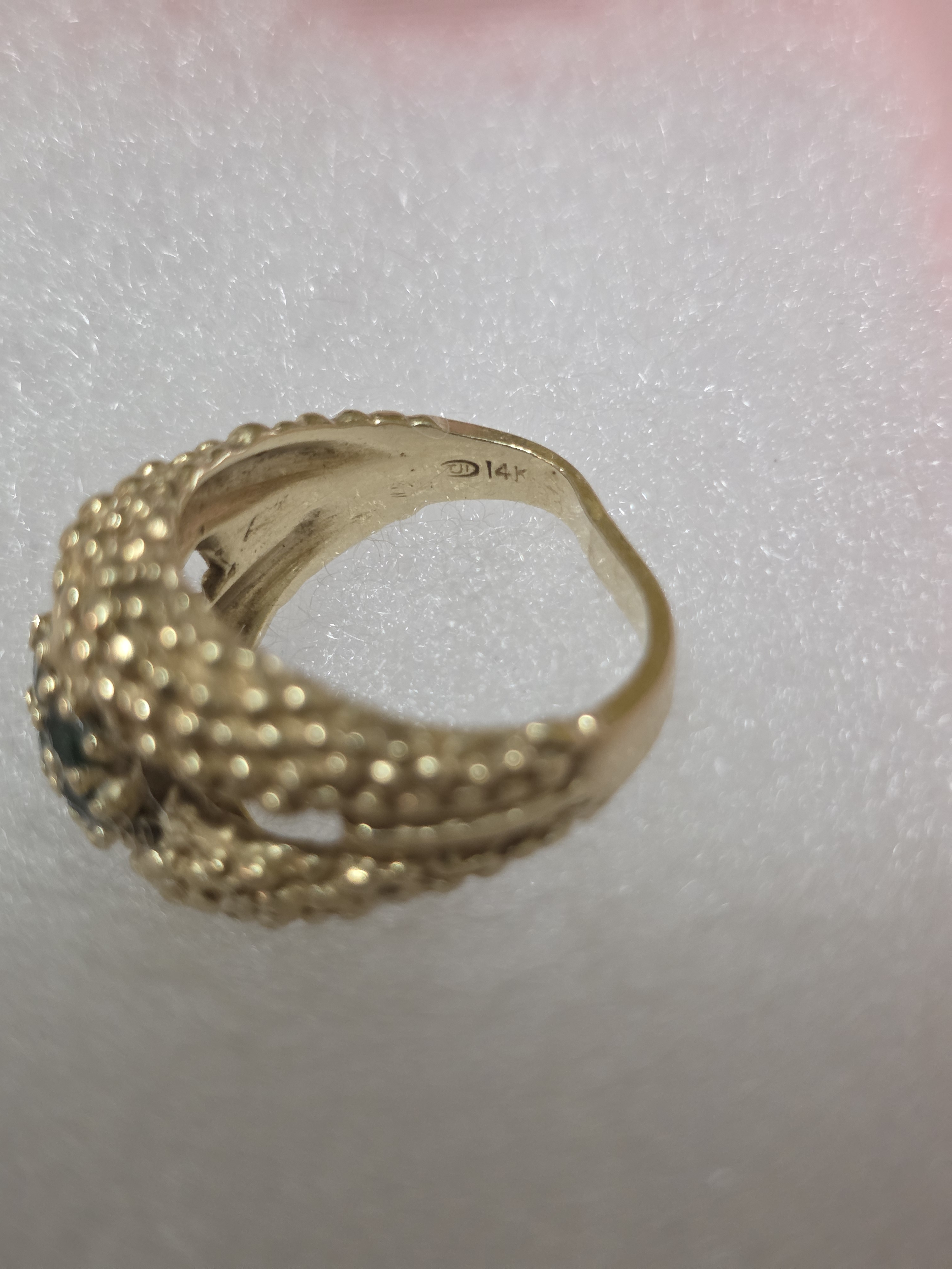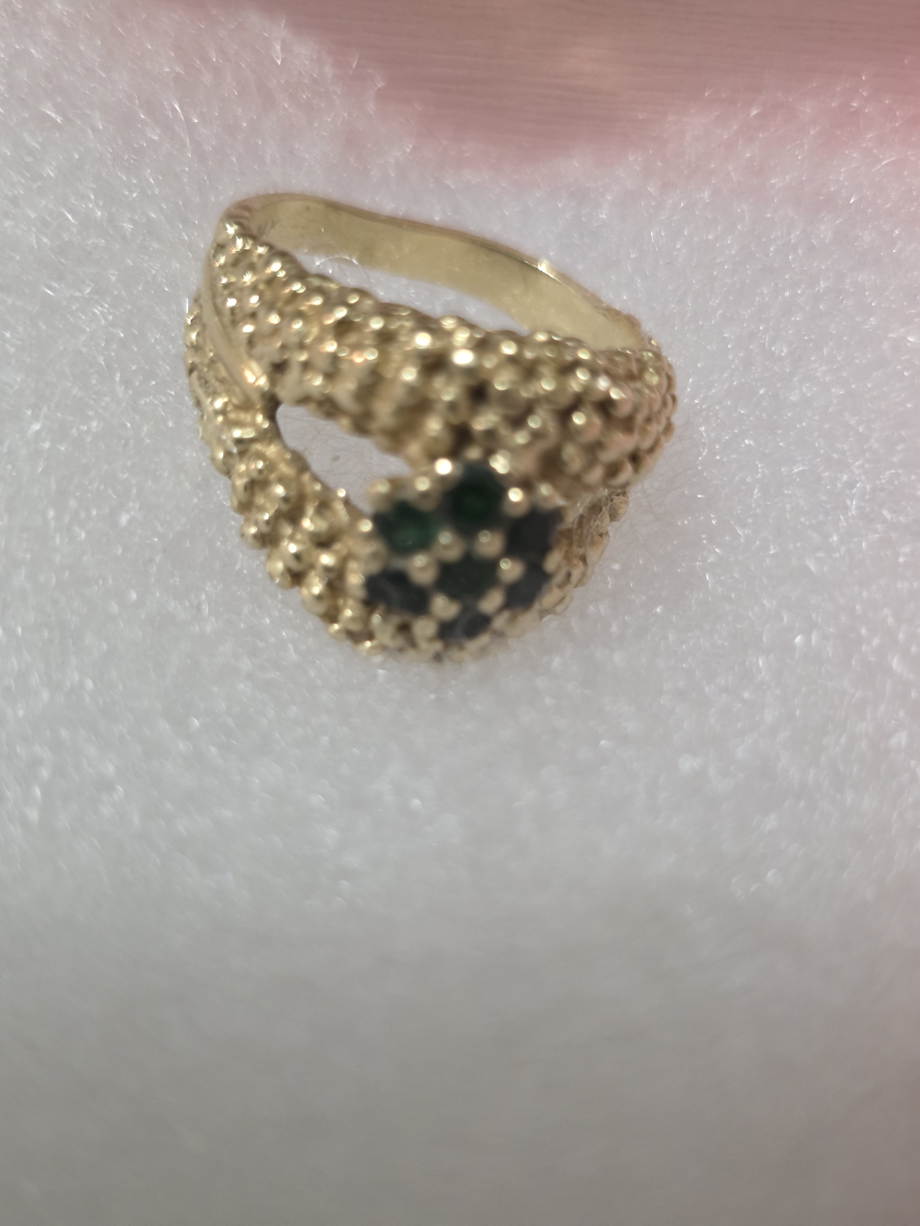 Antique 14K Gold Ring with Green Stones. Dating to Circa 1982. Materials: 14K Gold, Green Stones. Estimated value: $47 – $124. Condition: Very Good. The market for vintage gold jewelry is currently stable, with moderate demand.