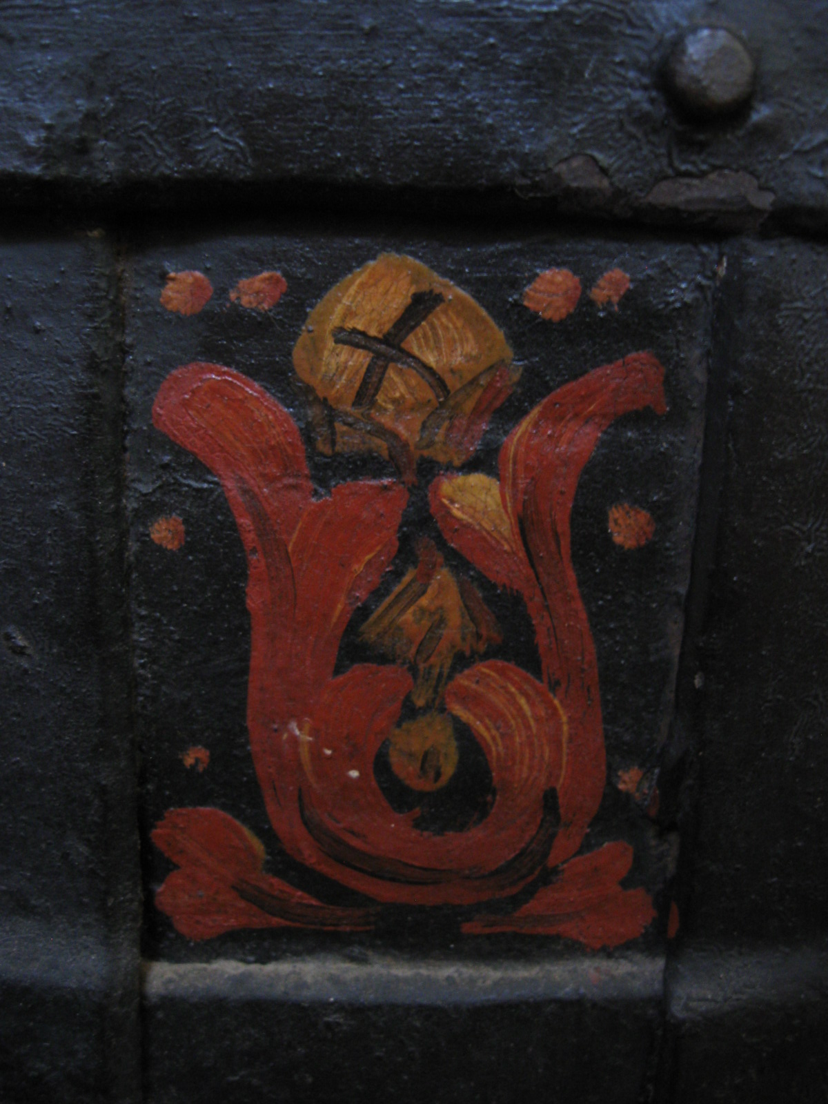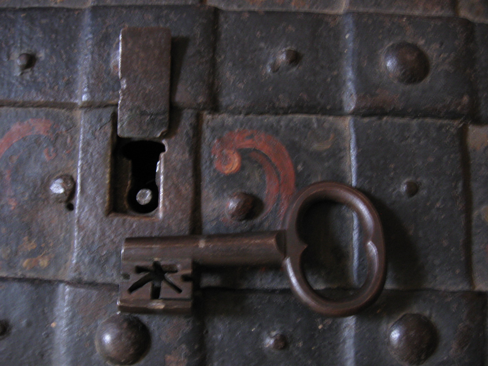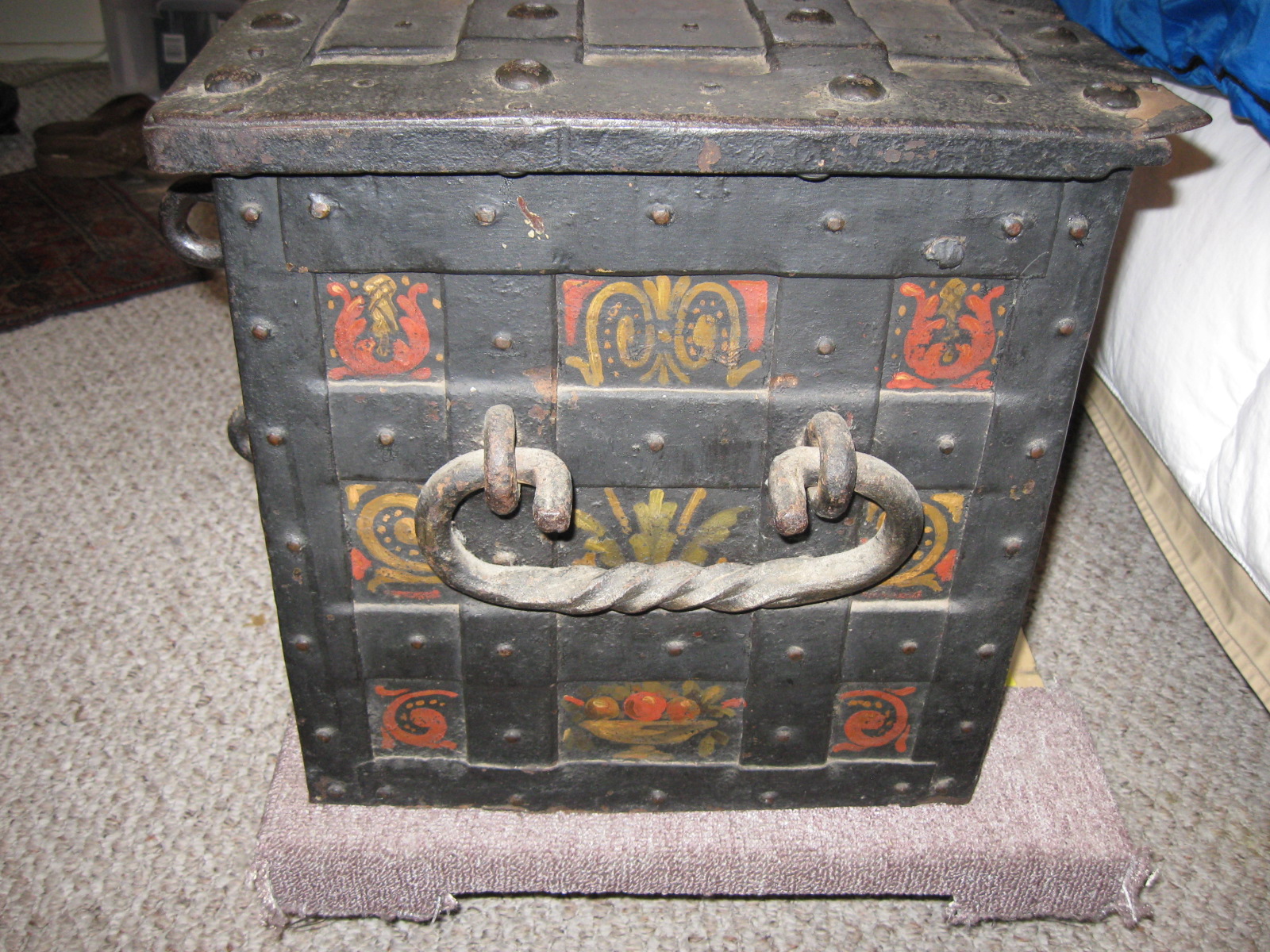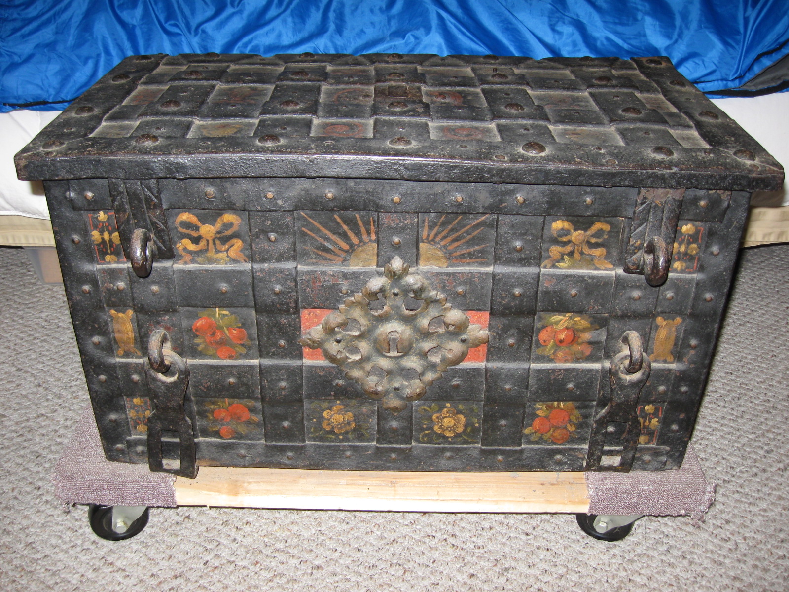 - Fully functional multi-point 7 bolt locking system, 1548 Printed on top, Lion Decorated locking plate, hidden keyhole up top snaps flush into place, Iron banded straps