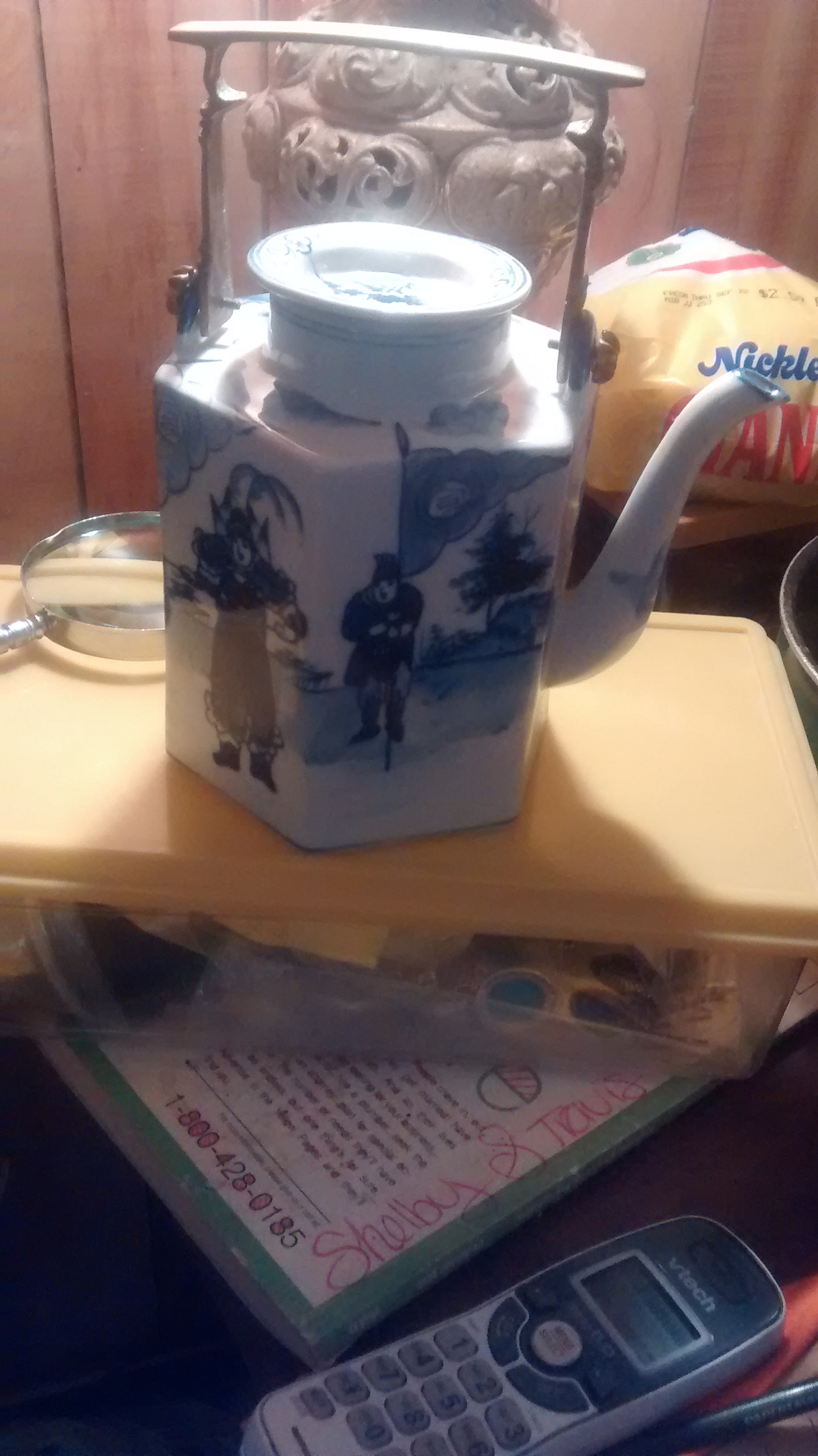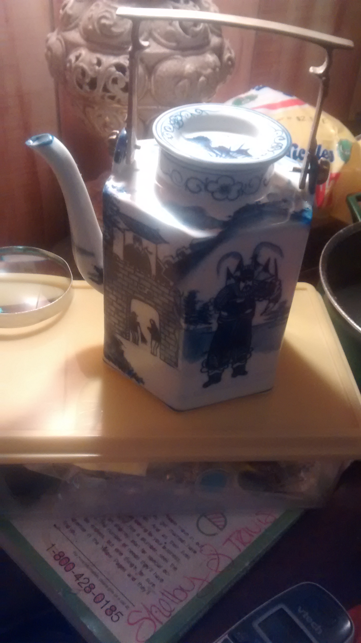 Porcelain with blue print has gold handle no markings that I seen has different scery of chinaman on it
