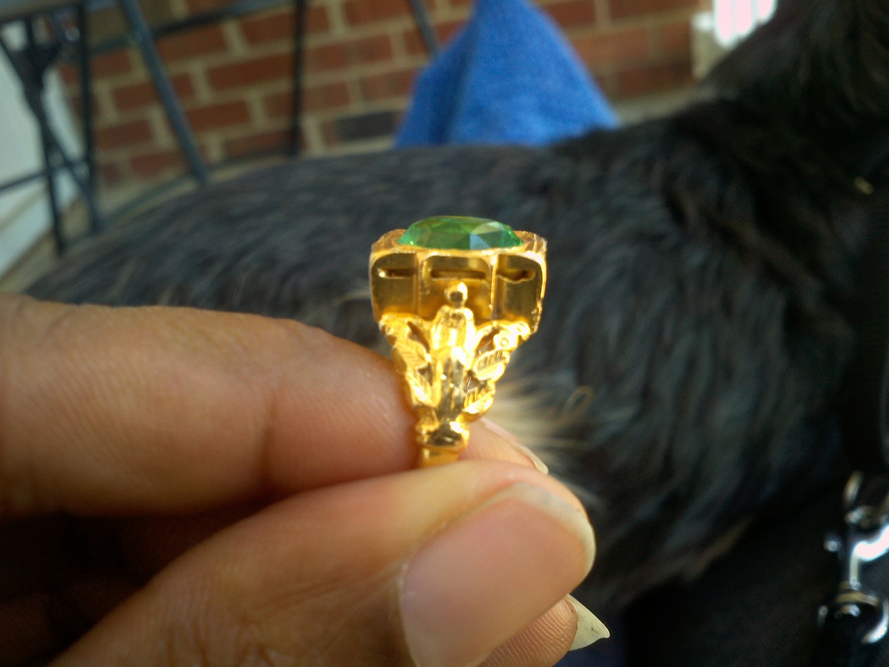 It is an 18kt yellow gold ring with a green gem that looks to be clear with green in it. The gem is oval shaped and the setting is rectangular in shape. It has a closed in bulbous back and on either side of the band connecting the band to the setting is a figure that looks to be a person and on either side of the person are leaves. The setting is large and somewhat architectural looking. There are no markings on the ring, but the gold was acid tested by a jeweler, bus he could not identify the gemstone. I am not sure if it is a man's ring or a woman's ring. I have no information on it's origin.