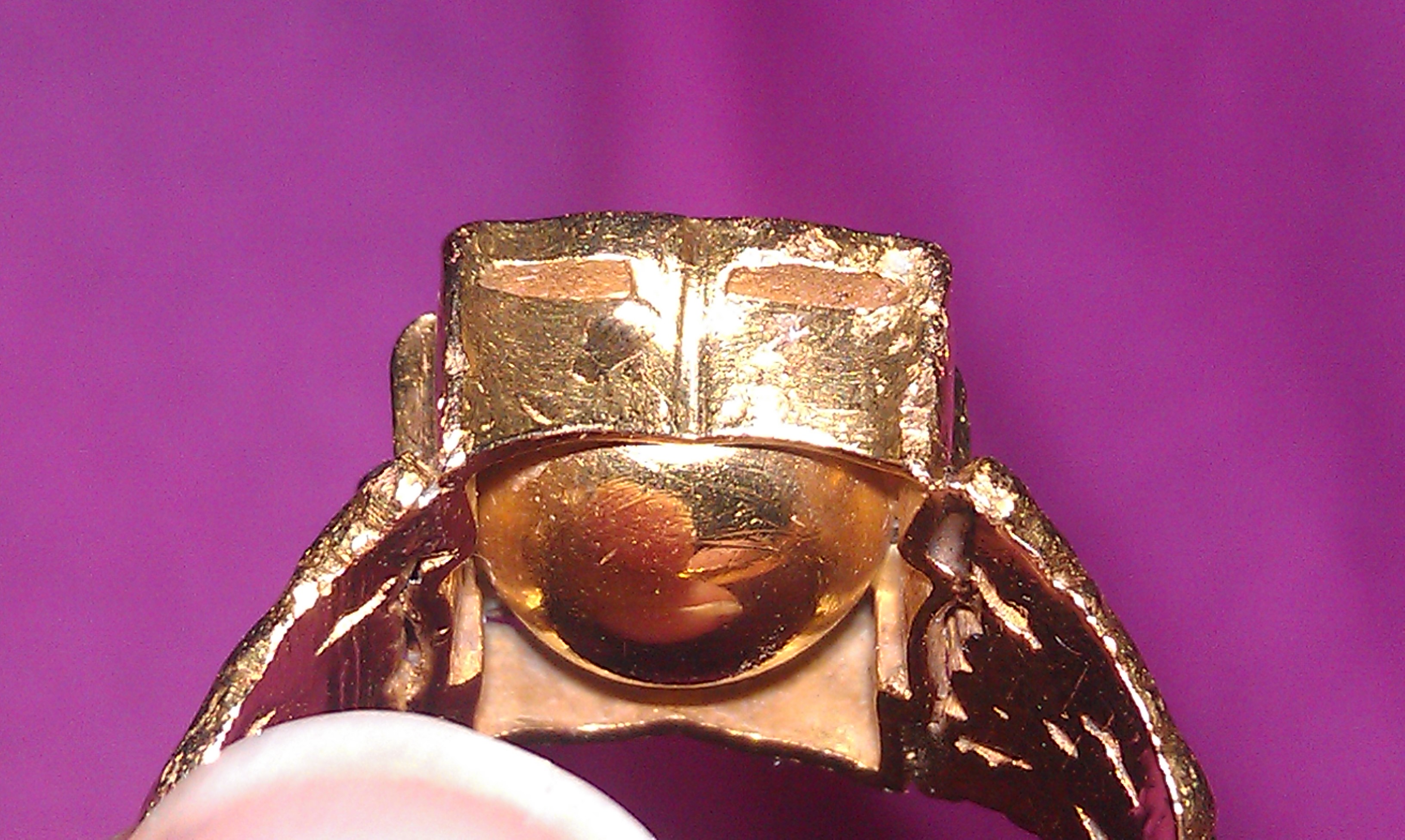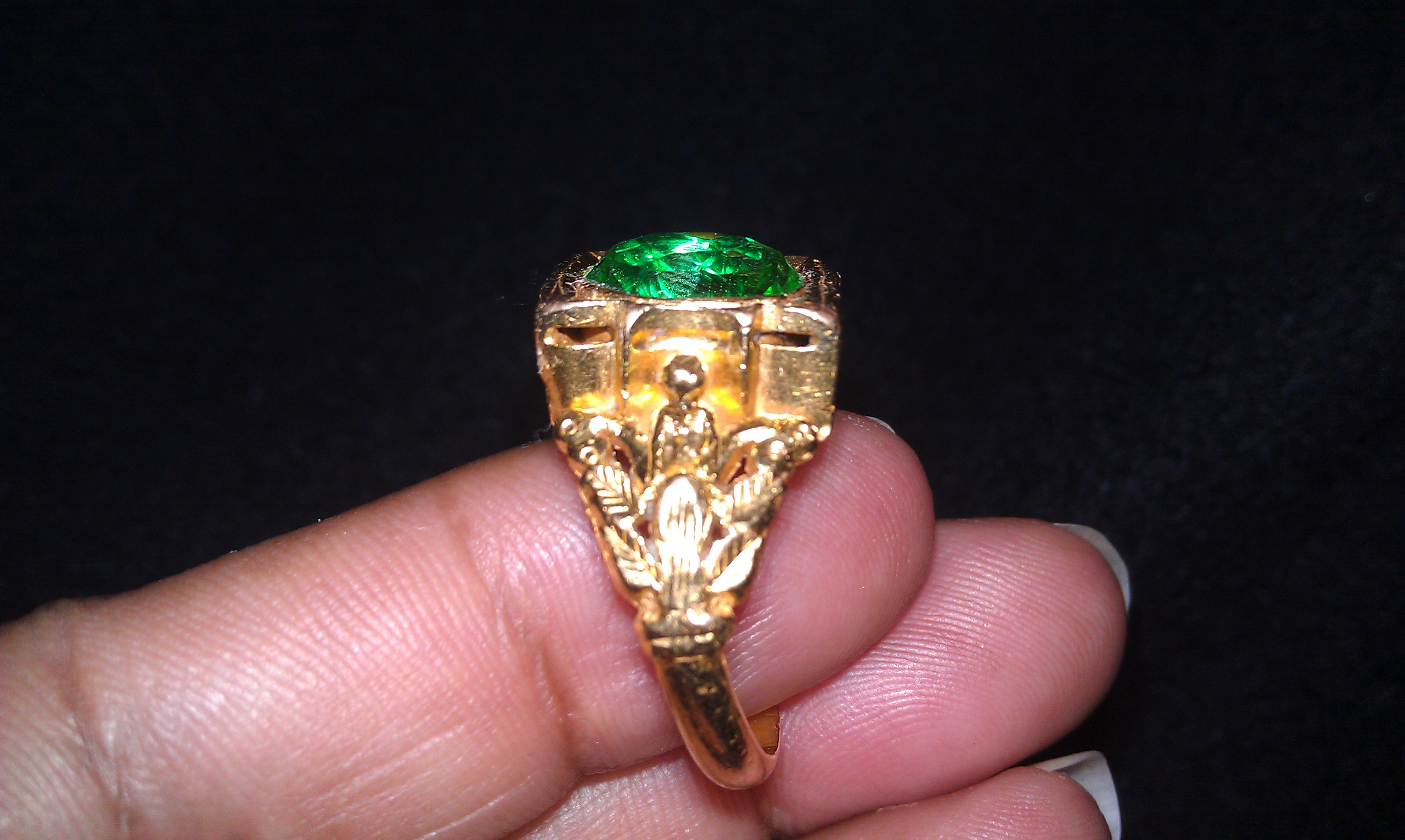 Antique 18kt it yellow gold ring with a green oval shaped stone. The stone in the ring appears to be clear with green in it. The setting is closed in the back and bulbous and the gem is bezel set. The band has what looks like the figure of a person on either side, and on either side of the figure are 2 leaves. I have no idea about the origin of the ring because there are no markings. The gold was acid tested by a jeweler.