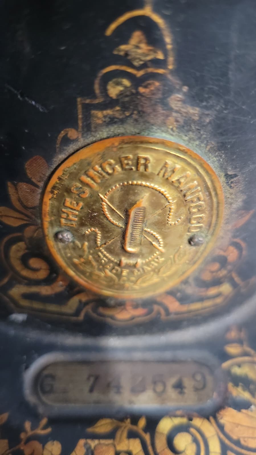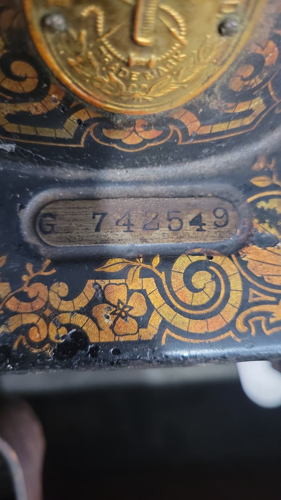 Description 1910 Singer sewing machine G7425459. Has all the pieces just the cord connecting the wheel around the pedal frayed.