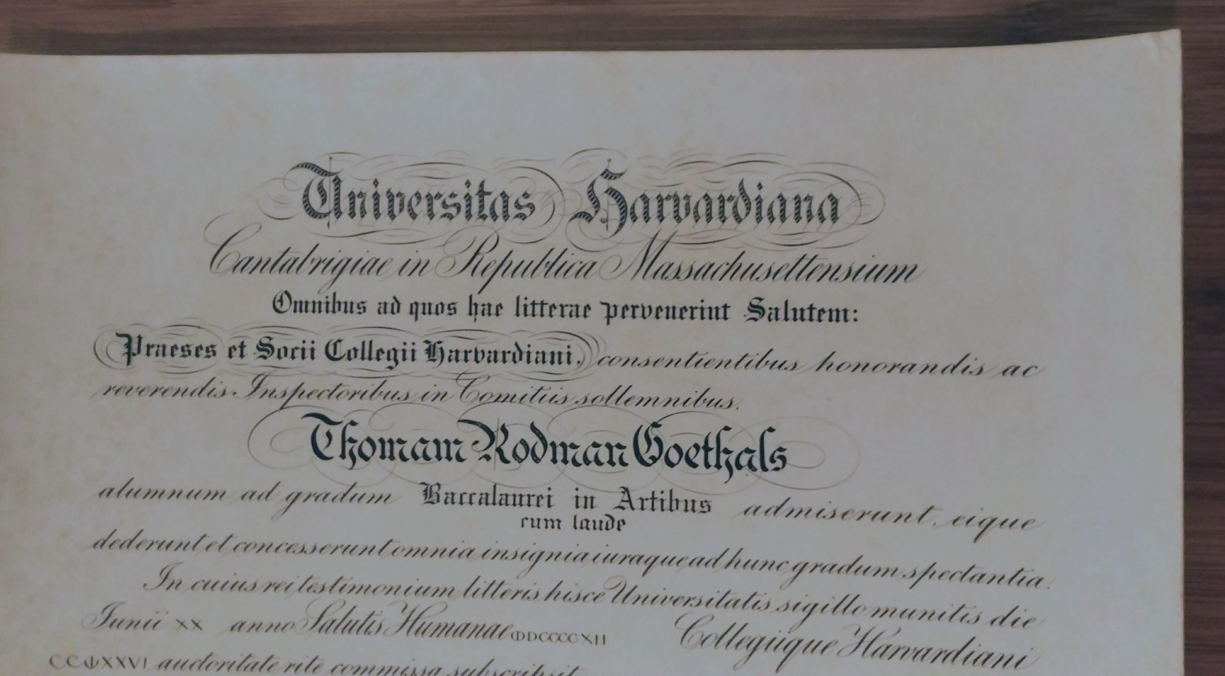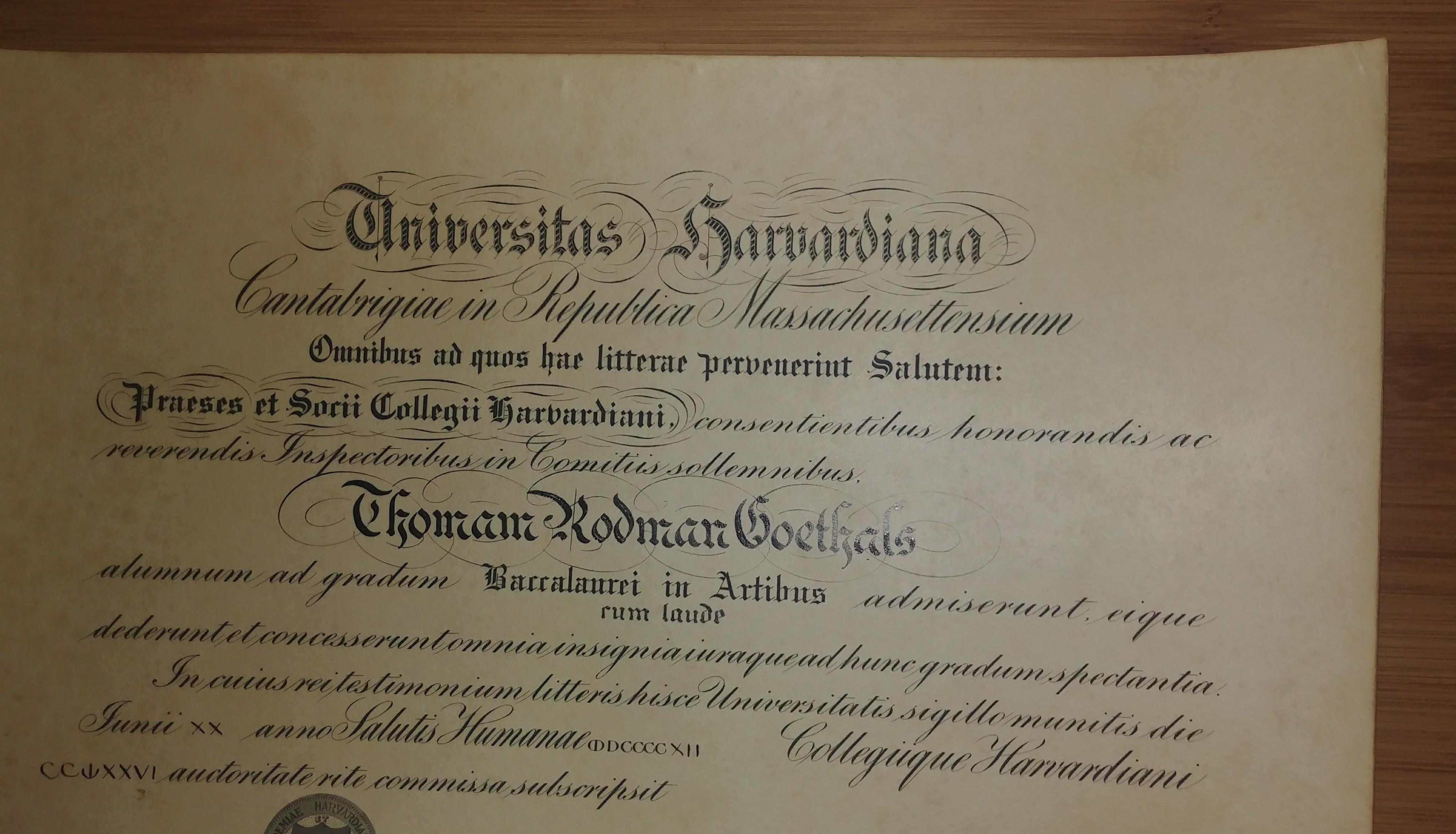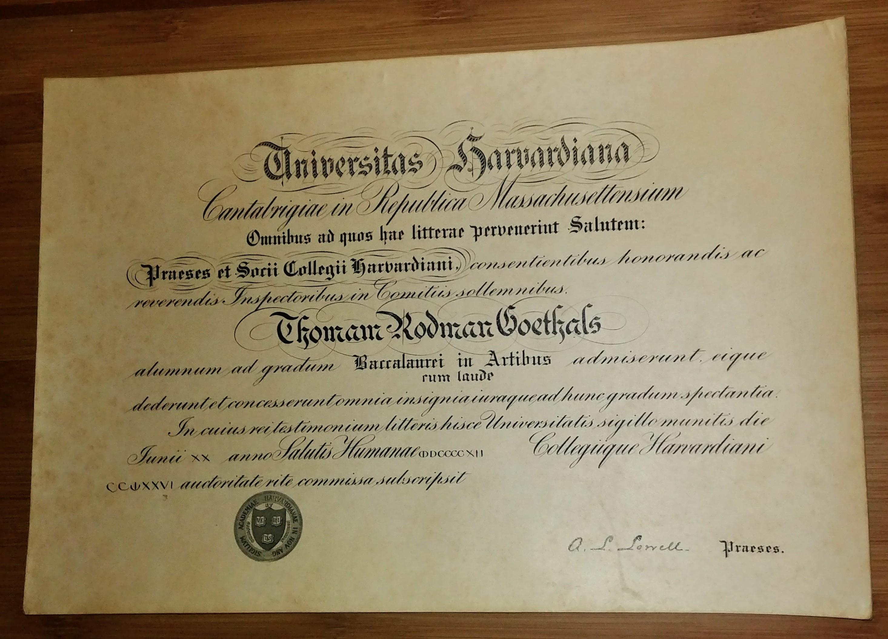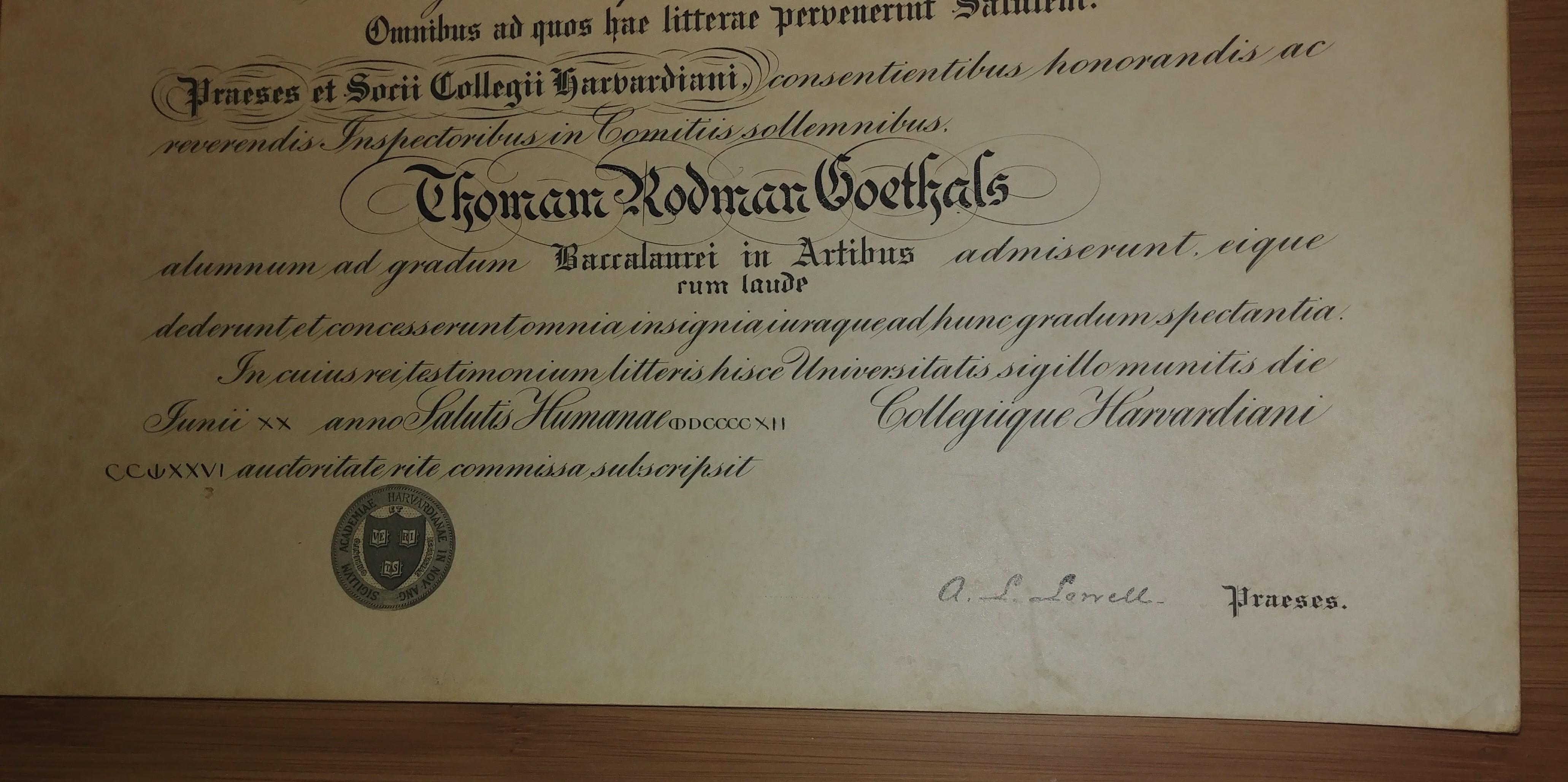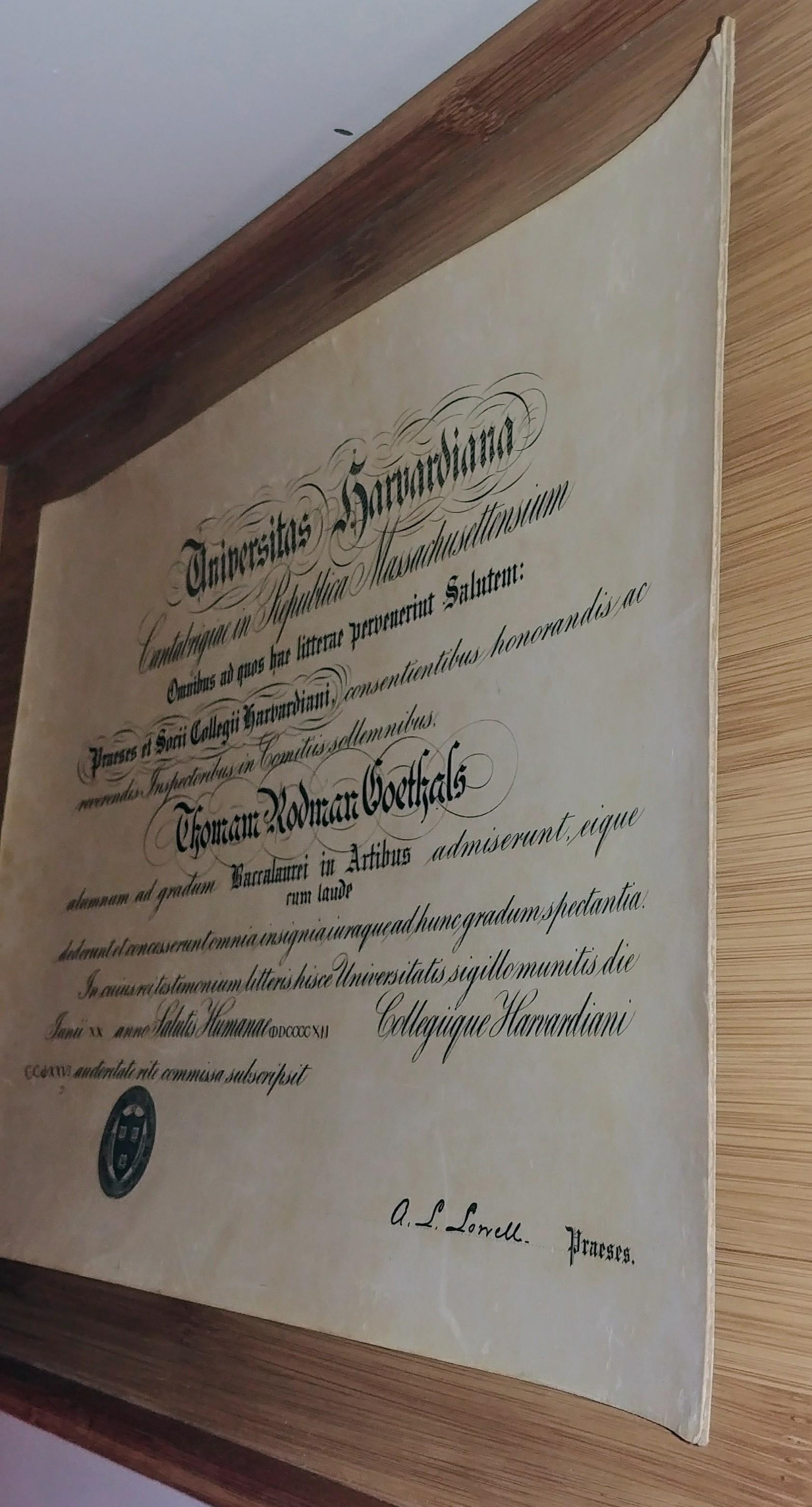 Antique 1912 Harvard Diploma Degree Latin Universitas Harvardiana Signed by the controversial President, A.L. Lowell, from 1909-1933.