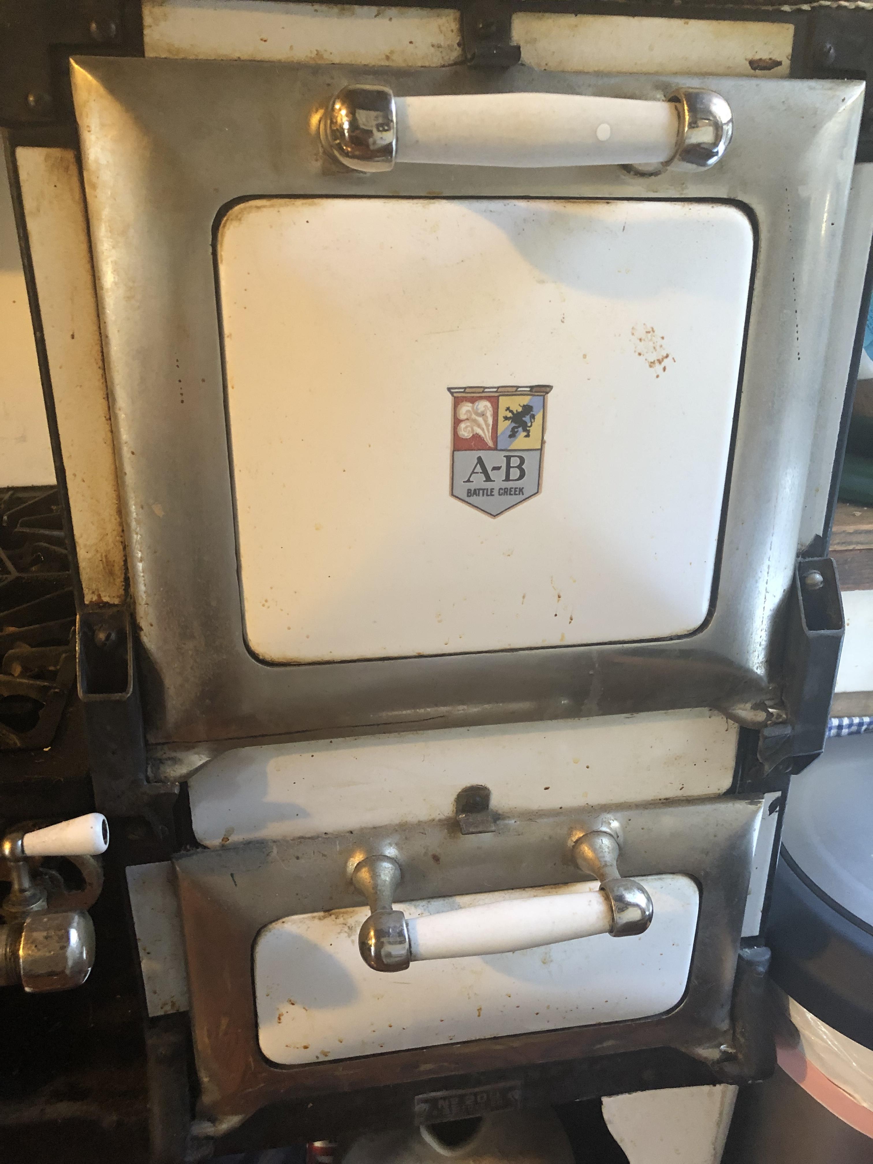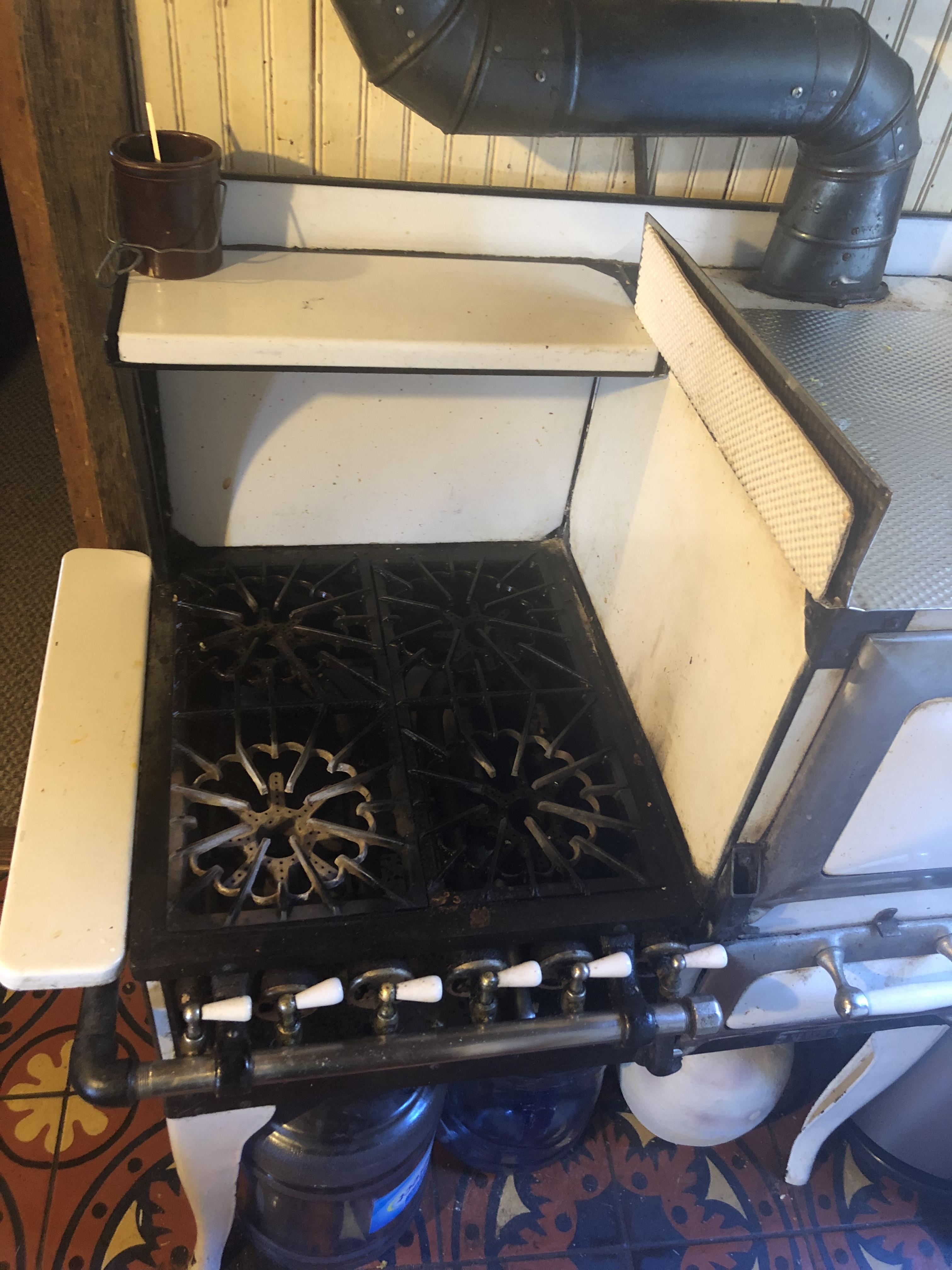 White, maybe 1920’s propane stove. Good condition. Still cooked on daily!