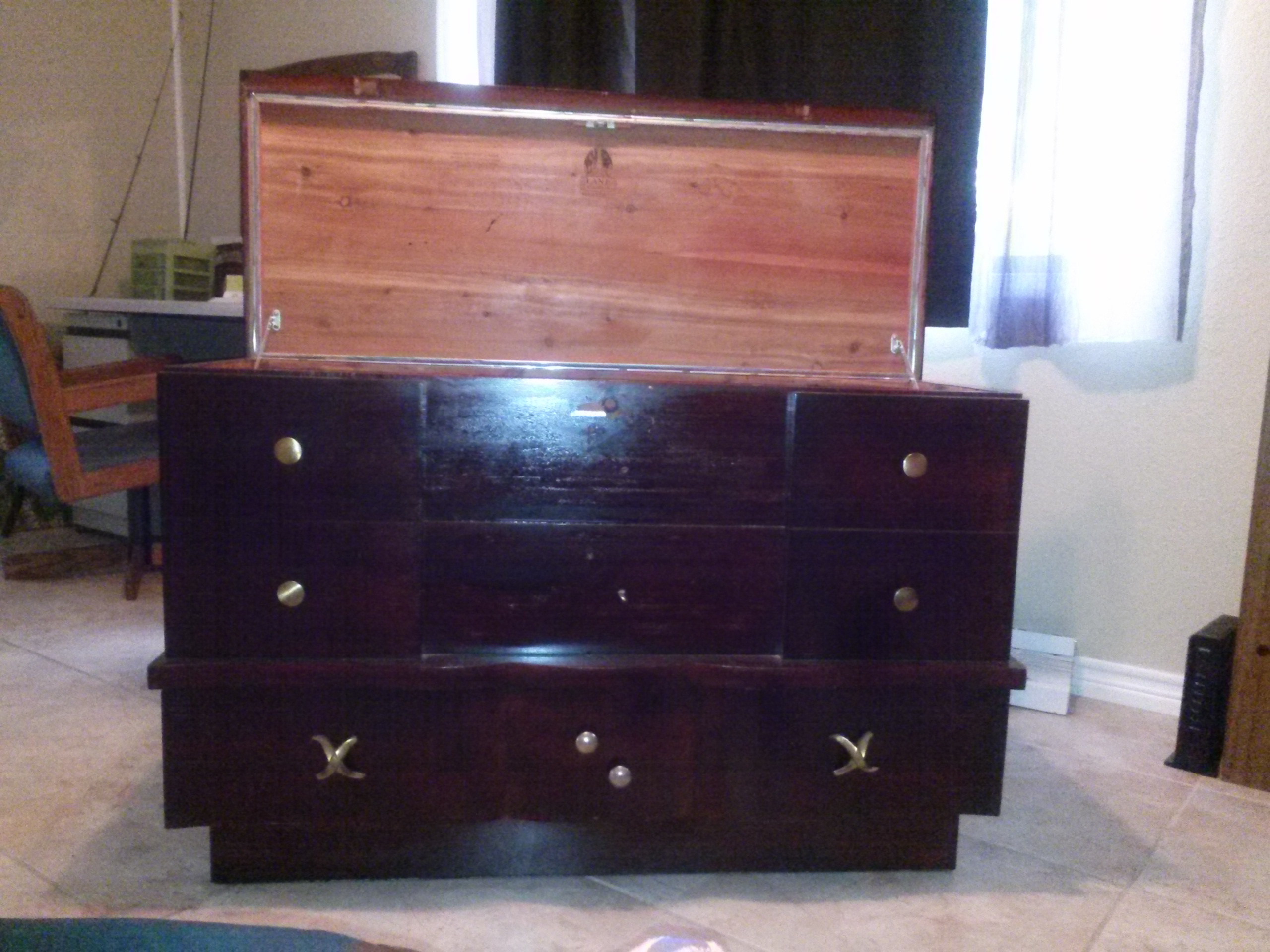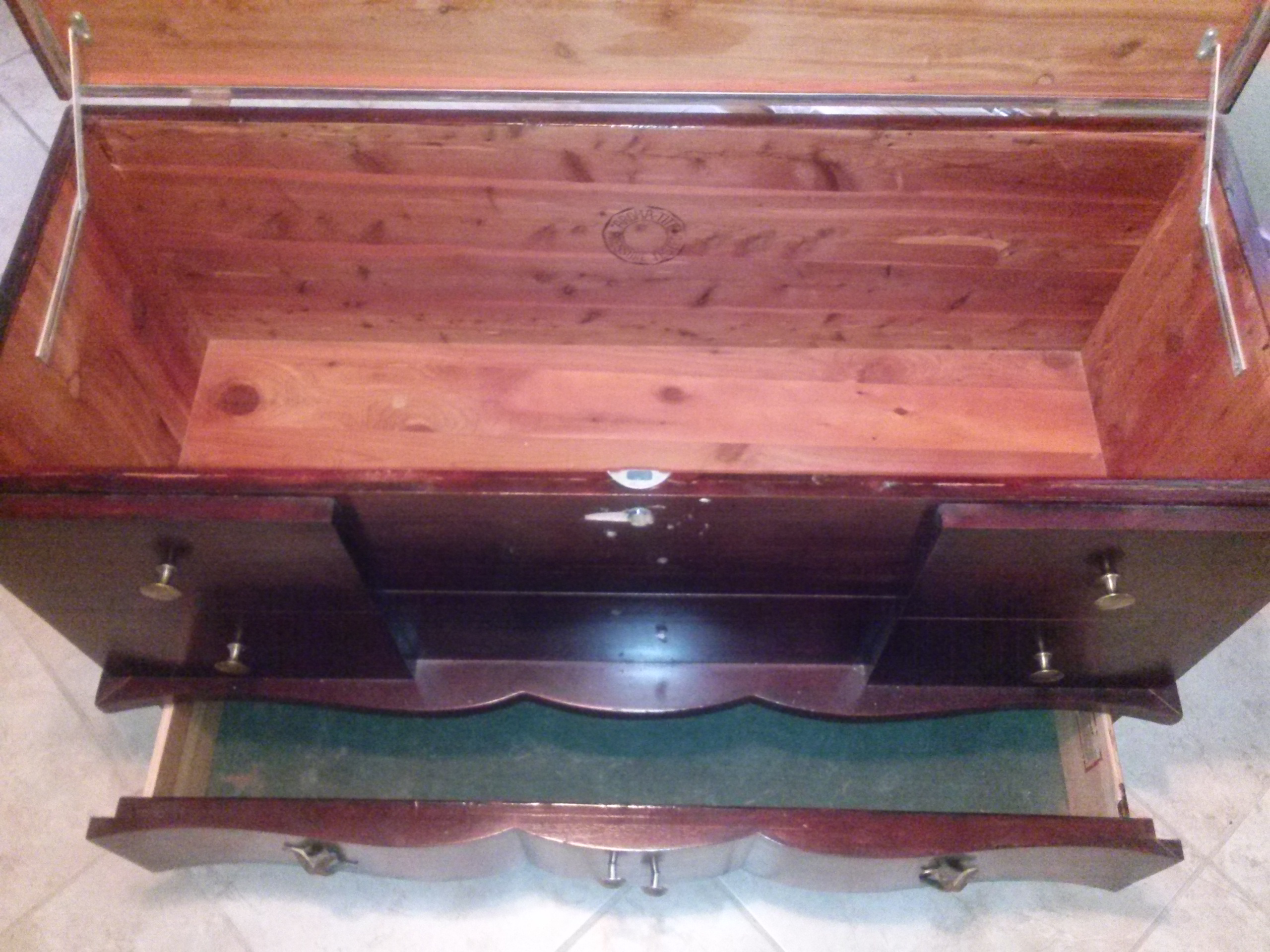it has two missing handles but I have the hardware itself original just have not put them on the lock no longer works there are a few surface scratches on top this cedar insides are perfect condition green felt in the bottom drawer also in great condition drawer functions perfectly hinges do as well overall it is invery good condition smells like fresh cedar
