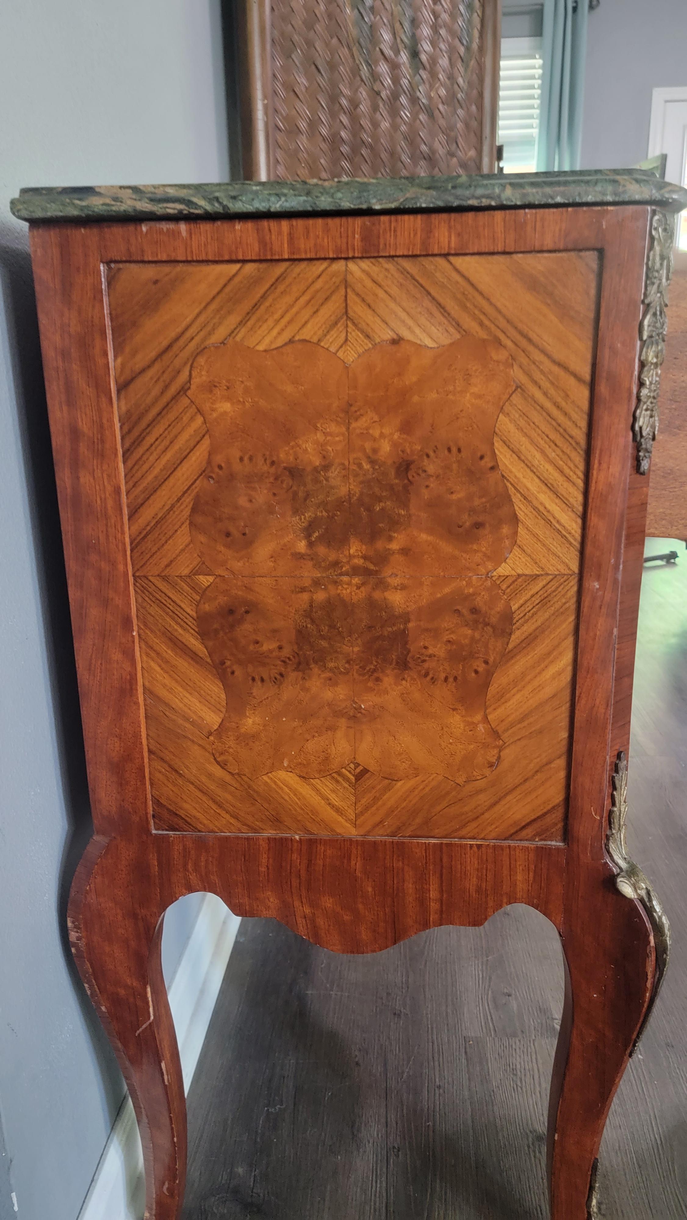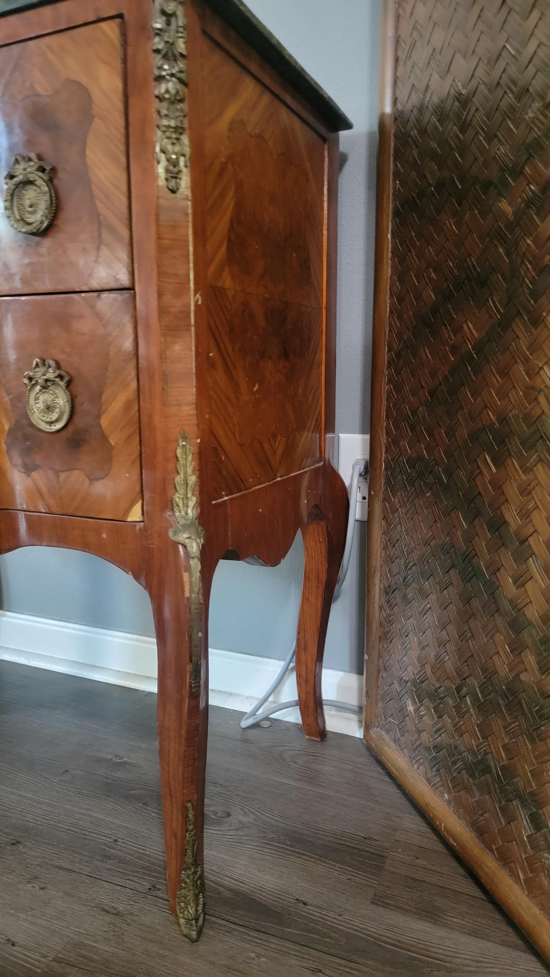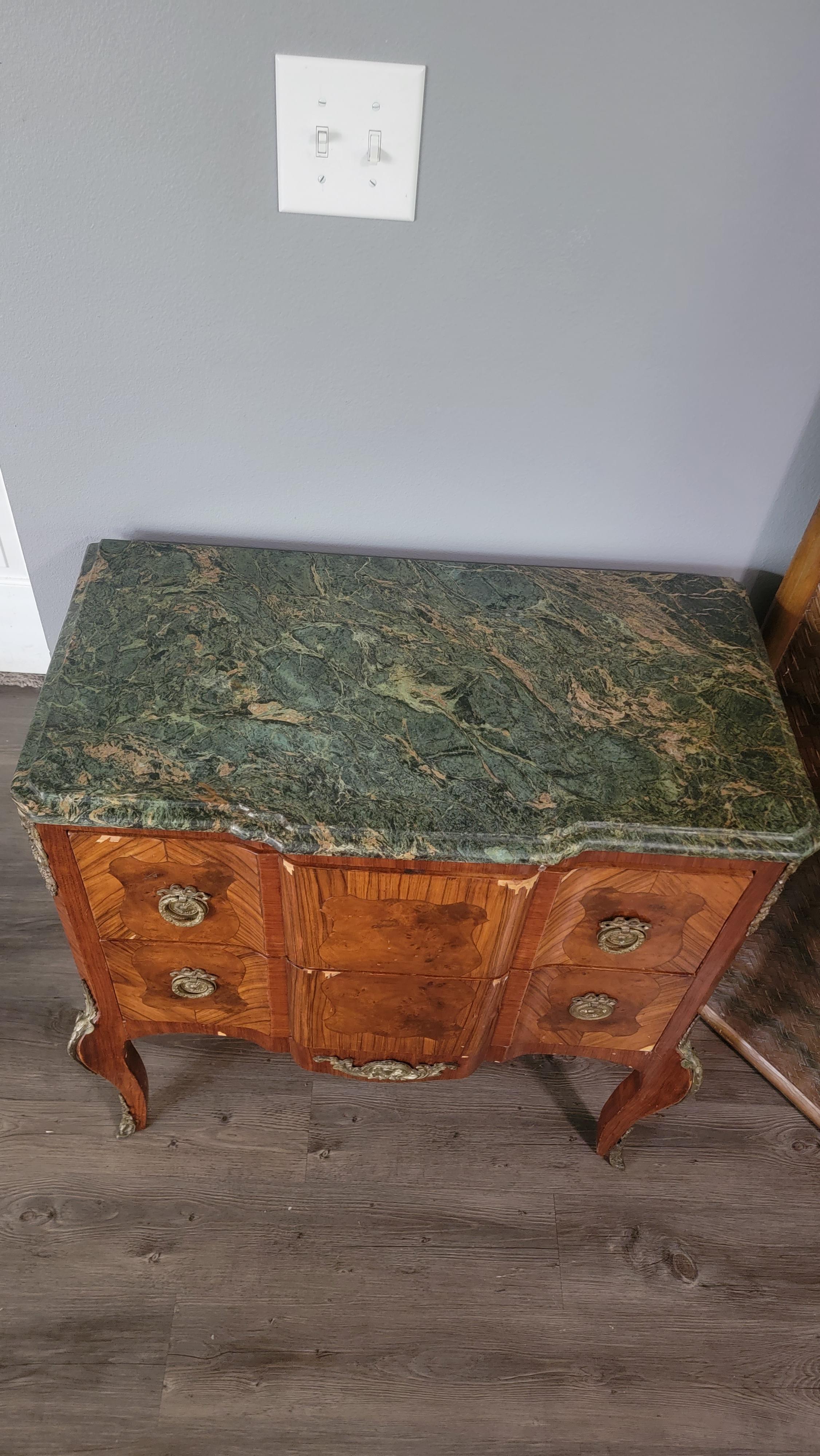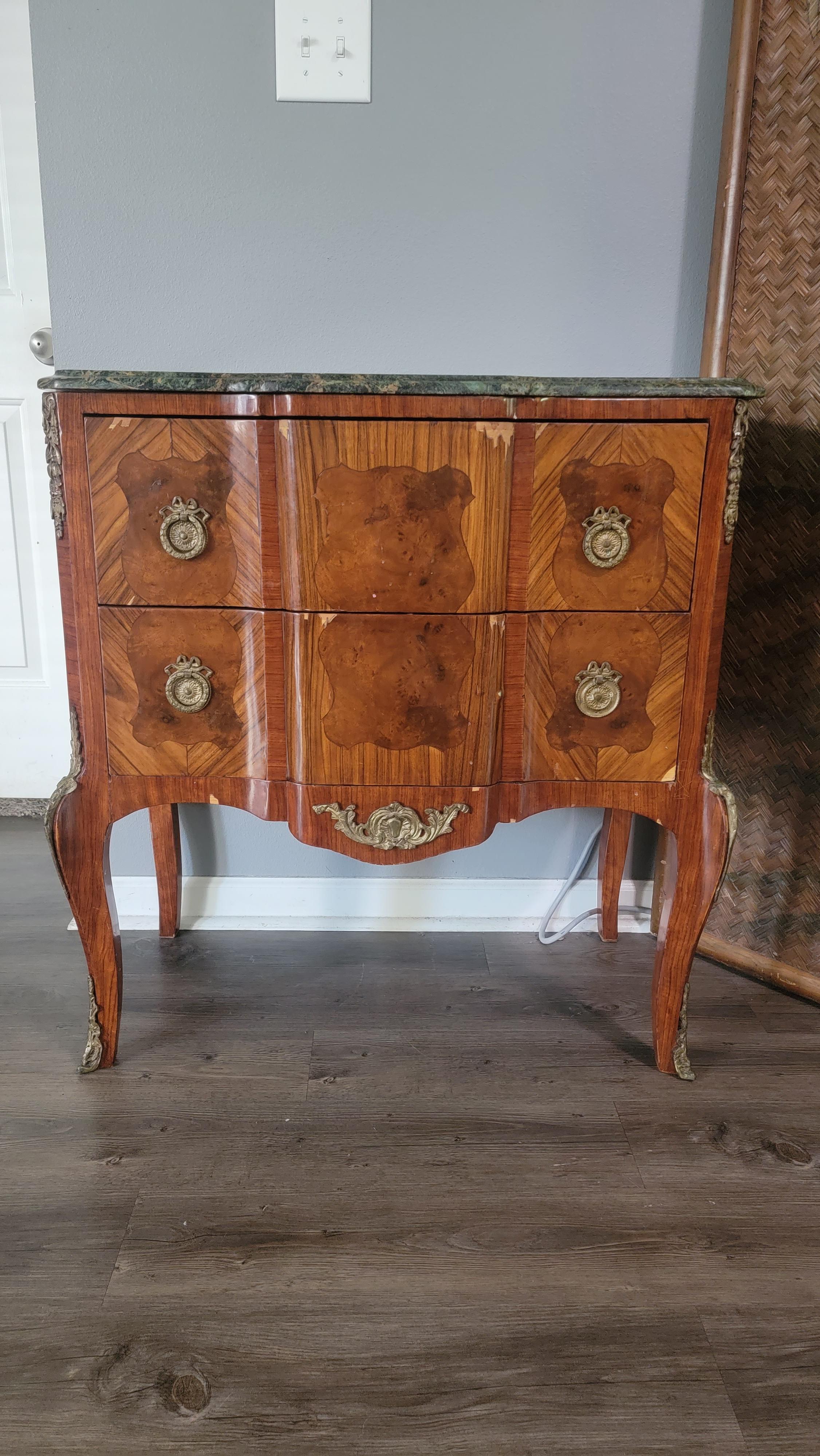 Antique 2 drawer burl chest on legs with inlade shield shapes, green marble top, wreath bow pulls, solid wood.