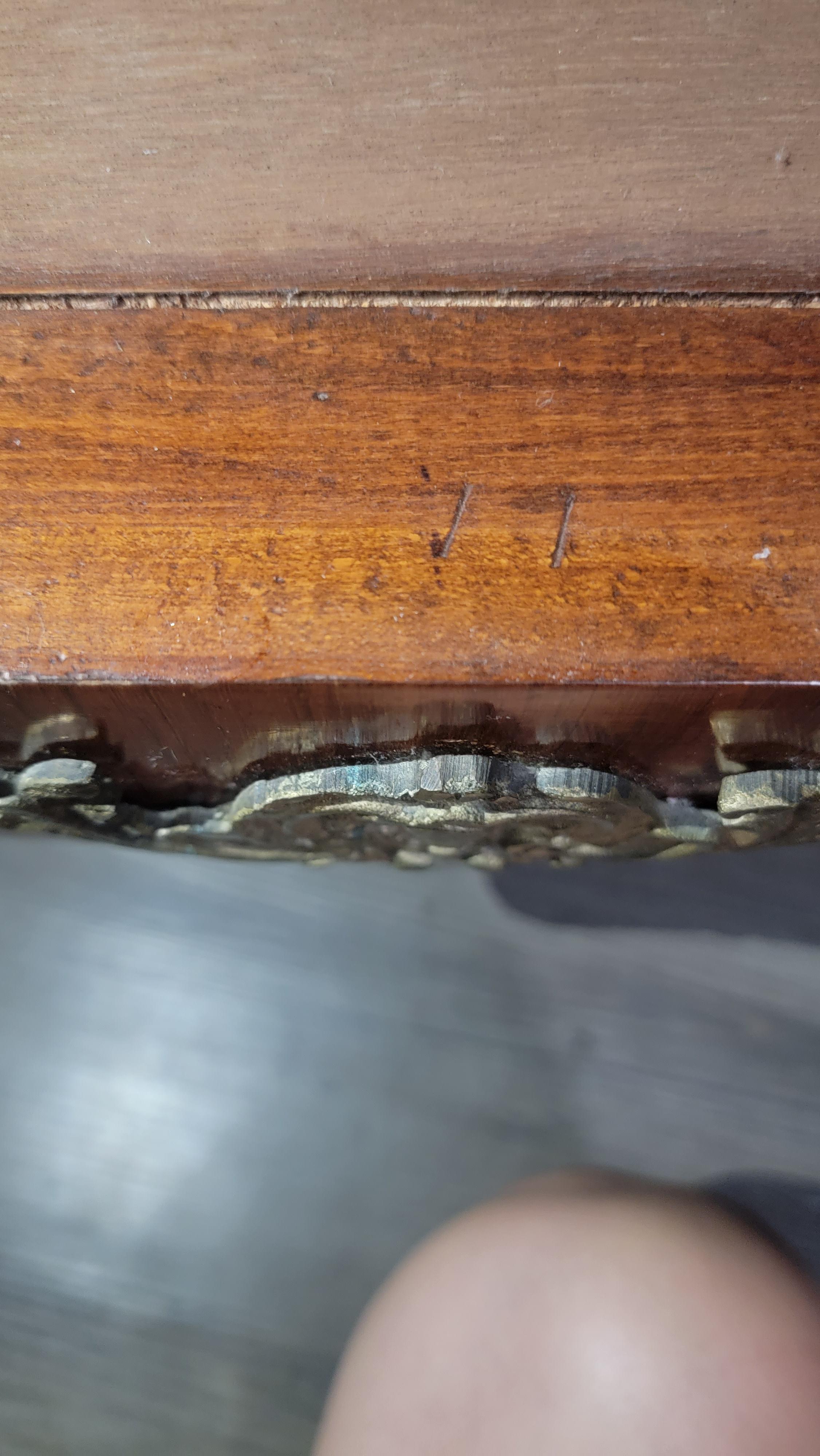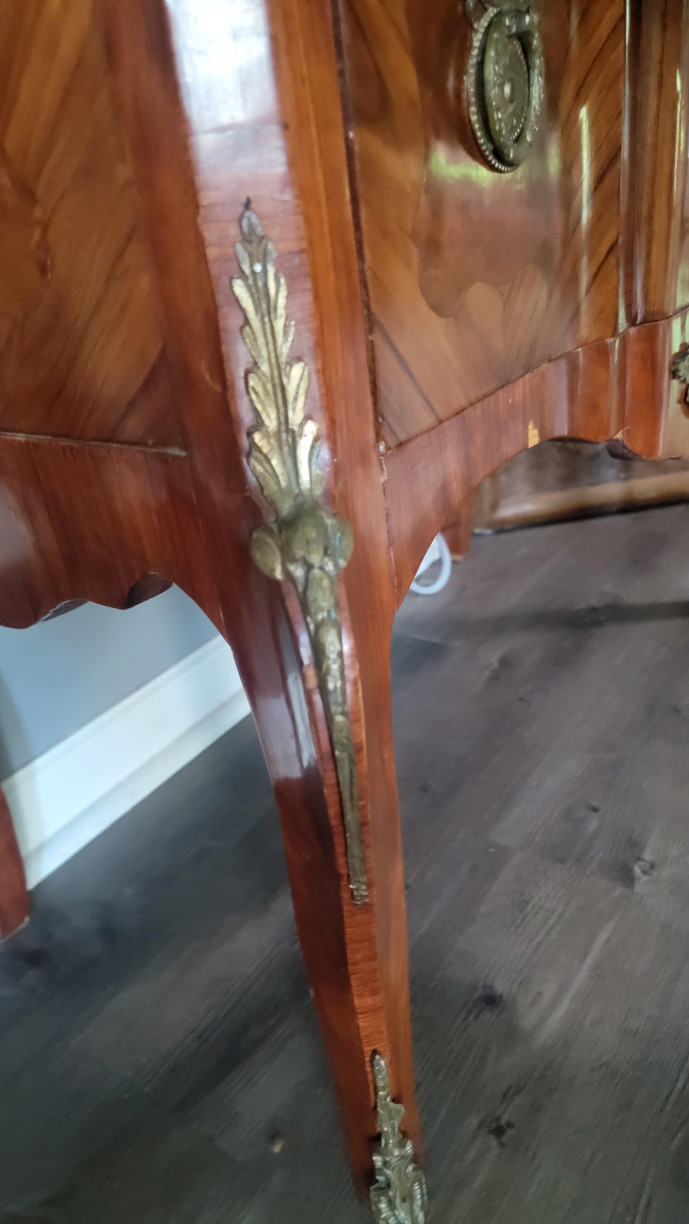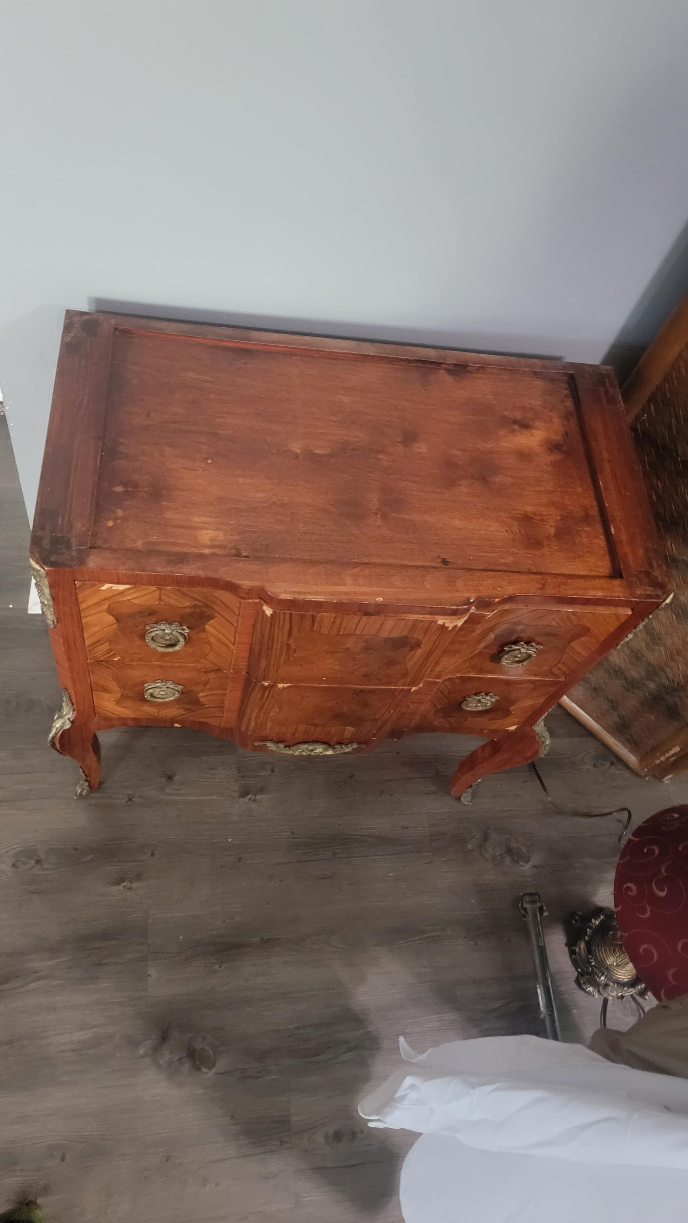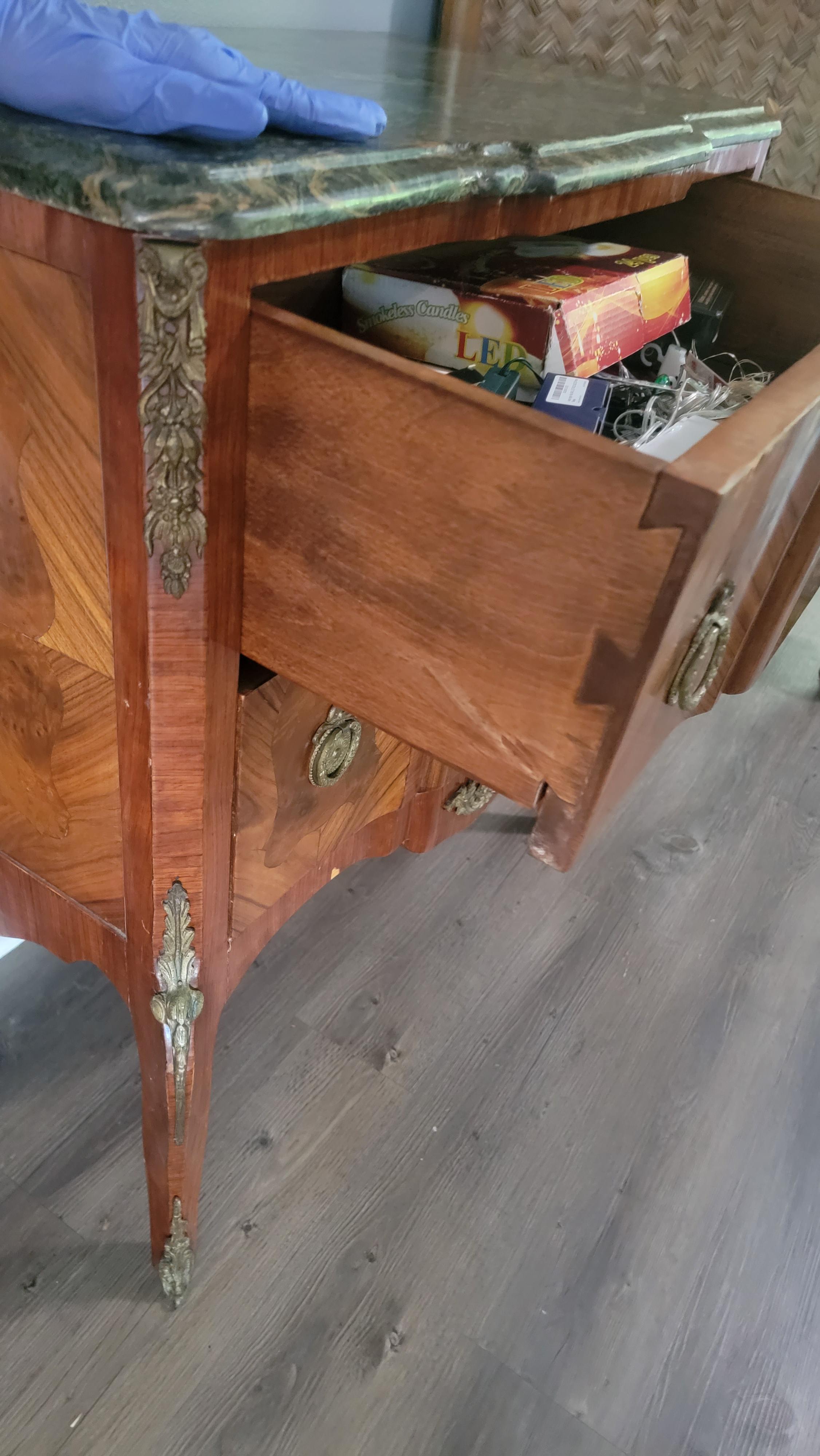 Antique 2 drawer burl chest on legs with inlade shield shapes, green marble top, wreath bow pulls, solid wood.