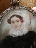 This pendant is 2.75" x 1.75" it is two sided. On one side is a portrait of a woman sitting, she is wearing a puufy sleeved black dress and a very ornate lace 'bonnet' and neck covering. She is holding a book. The artwork when looked at under magnification is amazing in detail. On the other side of the pendant it is predominently gold with a large oval stone in the center. Silver rope details accent the perimeter of the pendant as well as around the stone.
