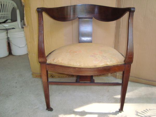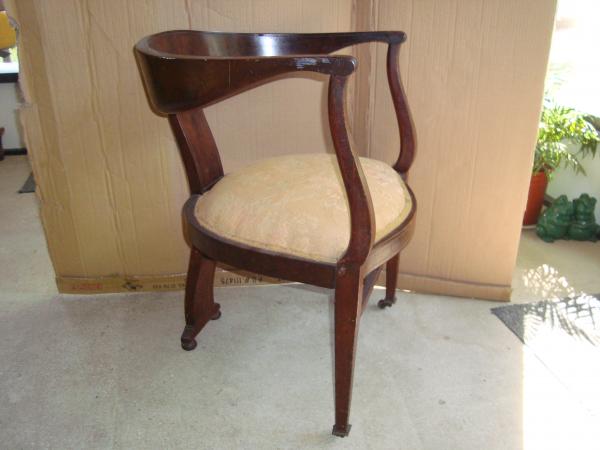 chair has 2 front legs on rollers, 1 large back leg, dark wood with metal