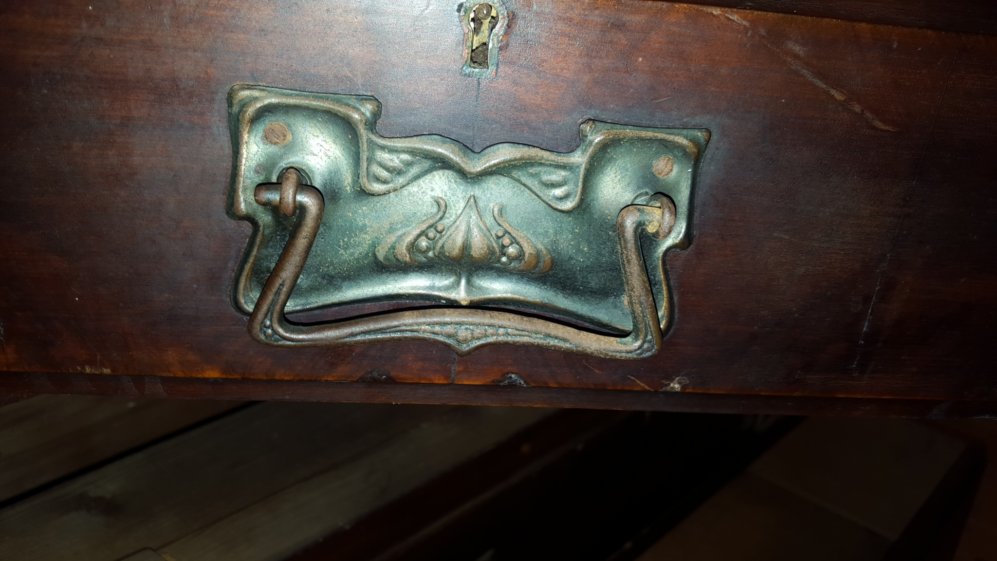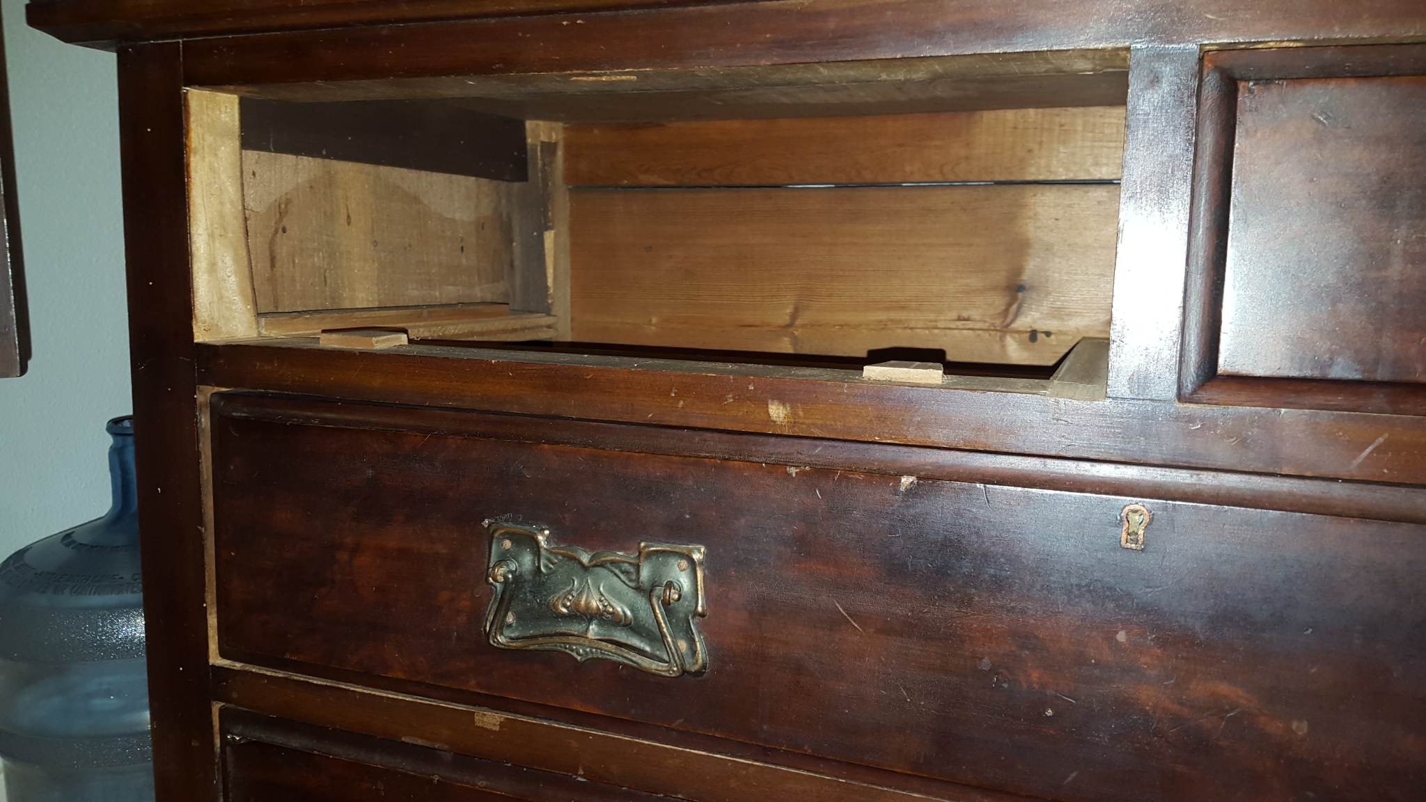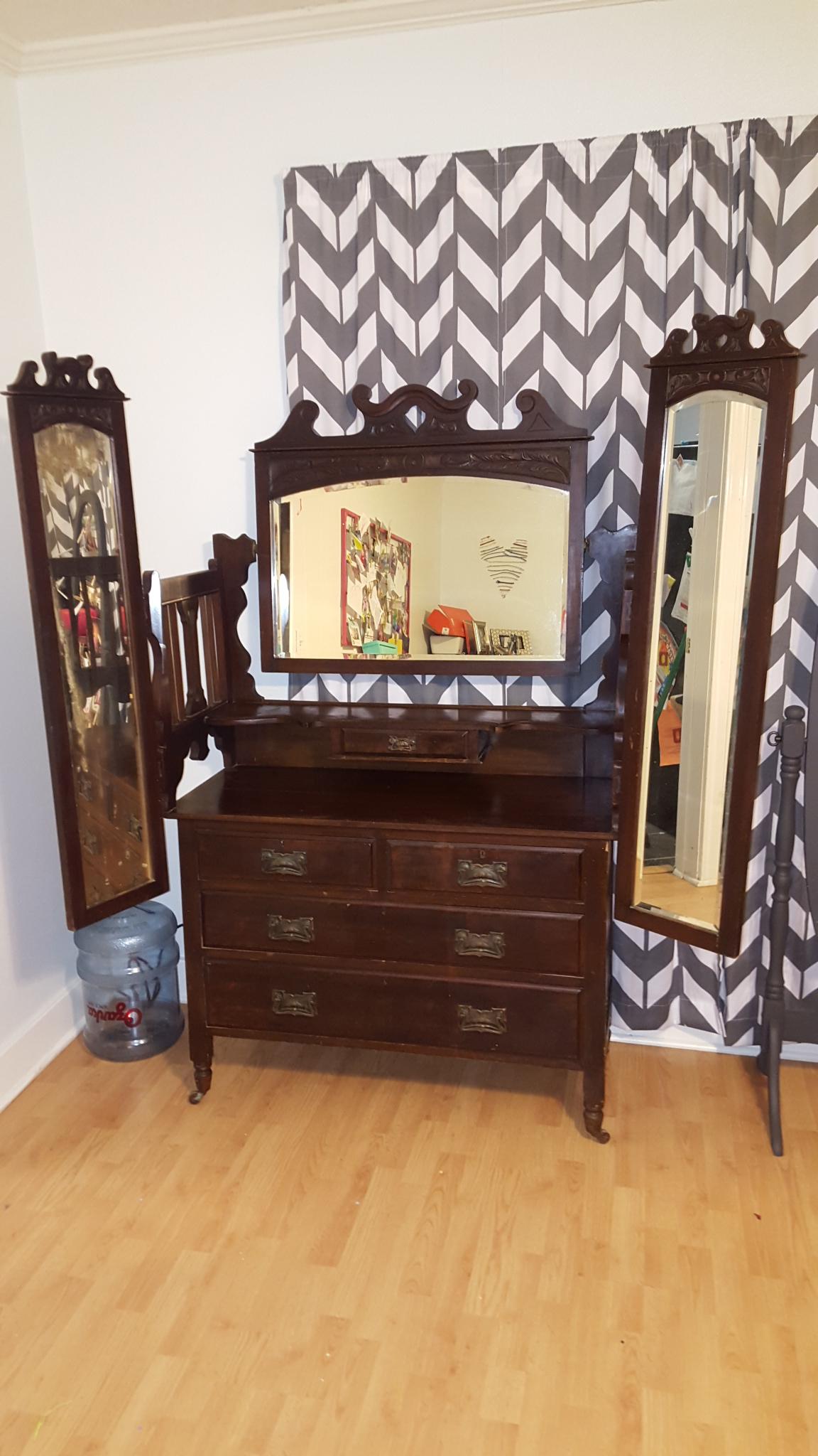 This is a dresser with 3 seperate mirrors. All three come off. There are no markings or labels anywhere on the piece. It sits on small caster wheels. Dovetail joints. I do not know anything about where it came from or anything else about it. If you could please even just let me know when it dates back to and a little bit about the piece, I'd be forever grateful. Thank you.