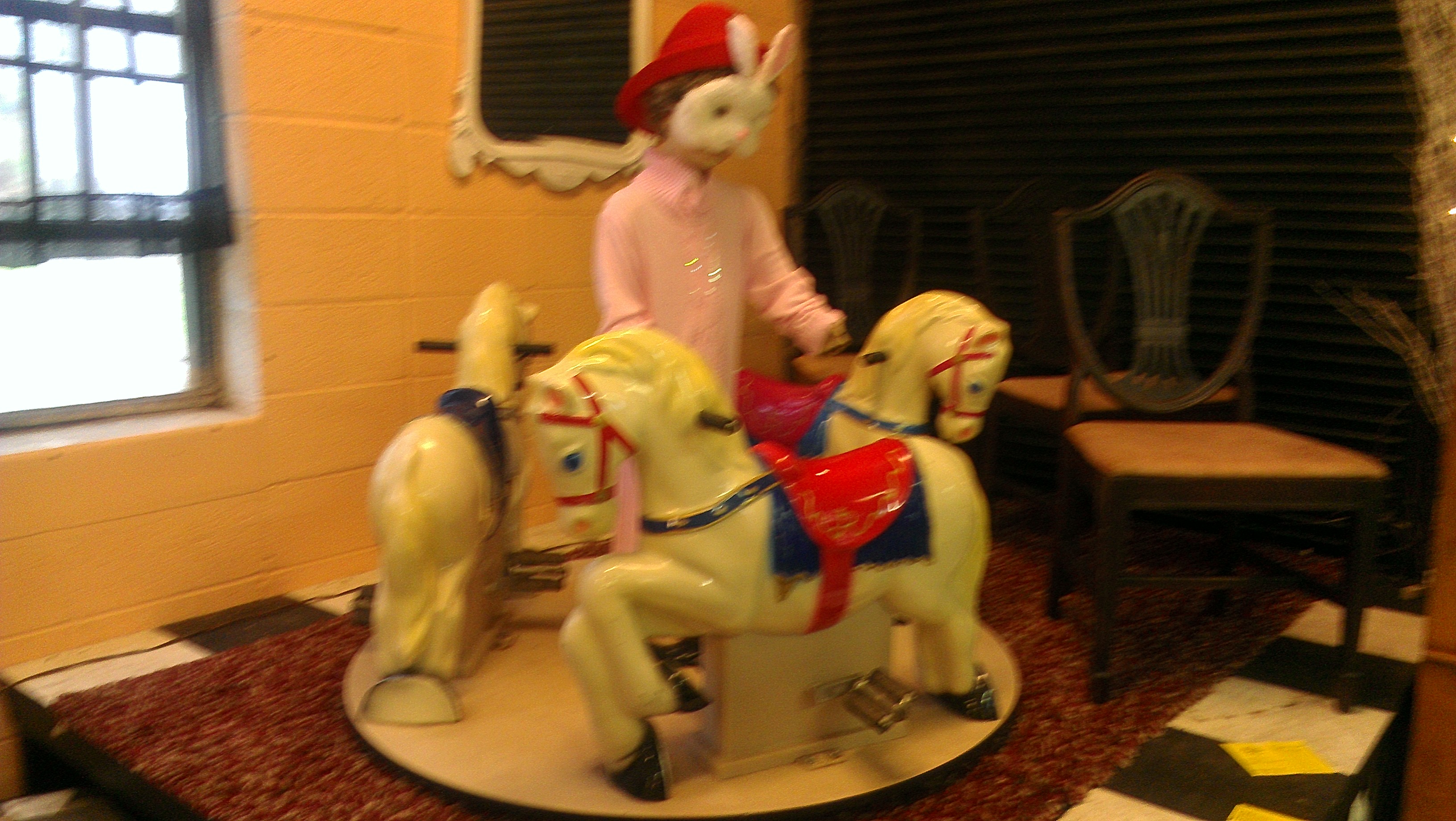 My husband and I are about to purchase an antique 3 horse pedal carousel for our granddaughter for her upcoming birthday. It's aprox 5' around, paint in pretty good shape, all of the pedal and turning/rotating/revolving mechanisms work great. We haven't fully inspected it for any manufacture information, etc. I've searched online for any information relating to the year and estimated value of it but haven't had any luck except for finding a picture of one. I'm hoping that you may able to give me more information or direct me somewhere. (the picture above is not of the carousel we are interested in purchasing but is exactly like it).