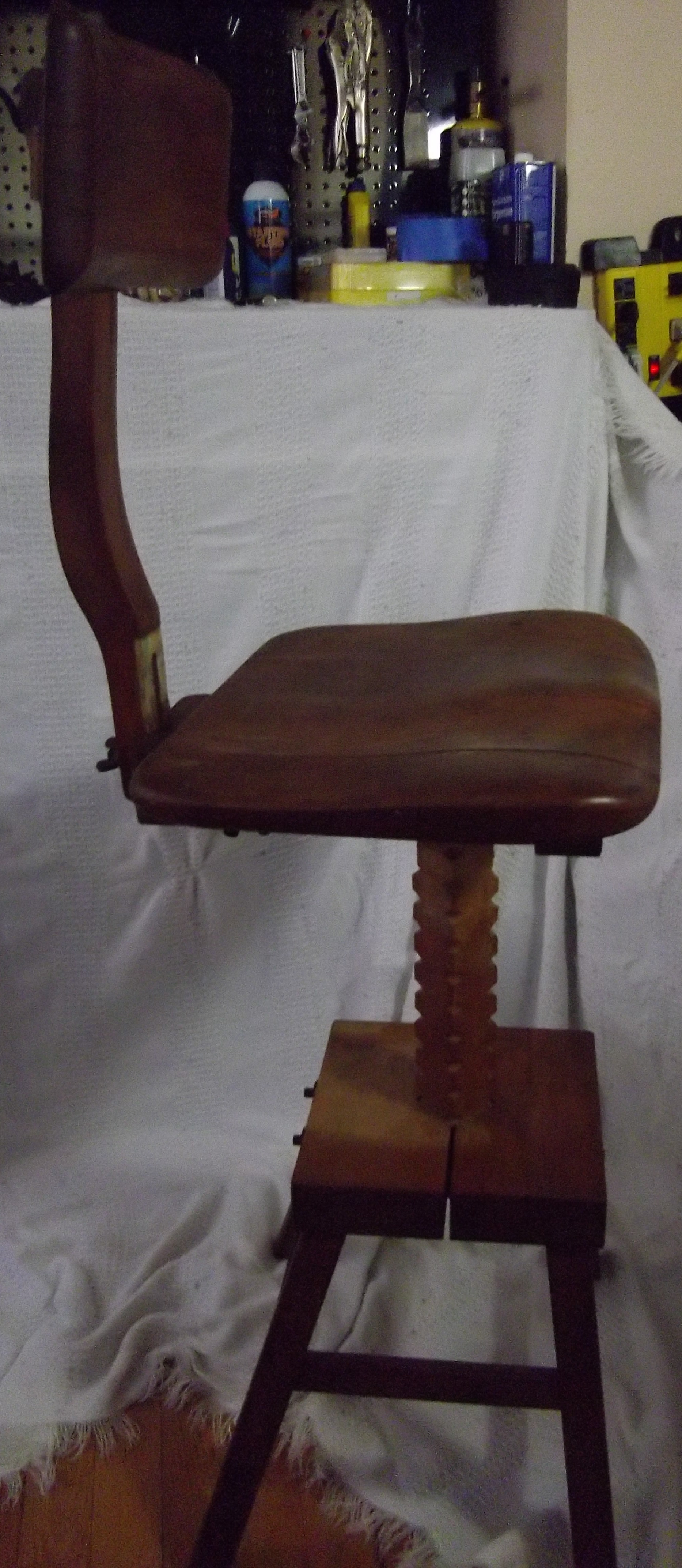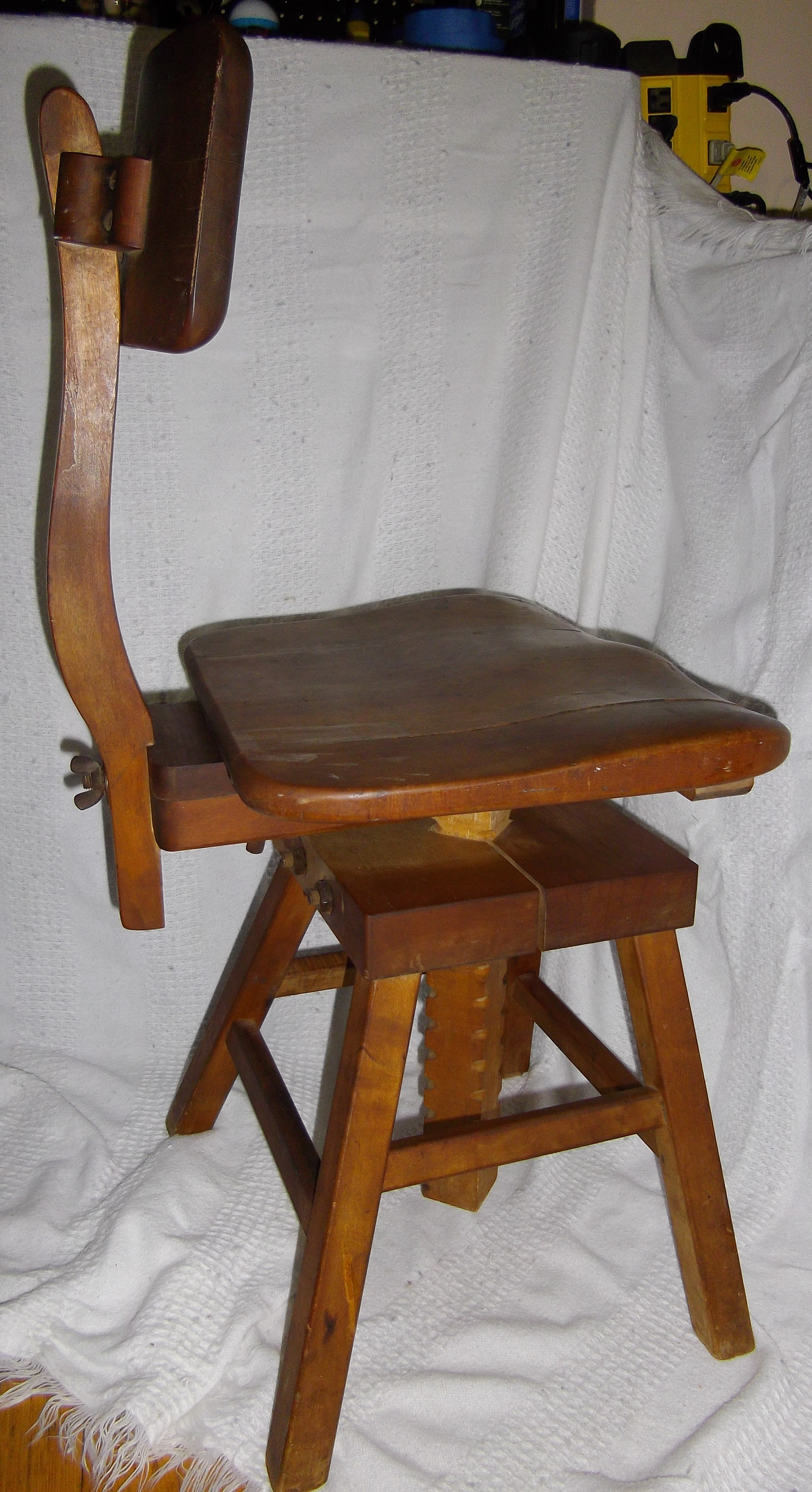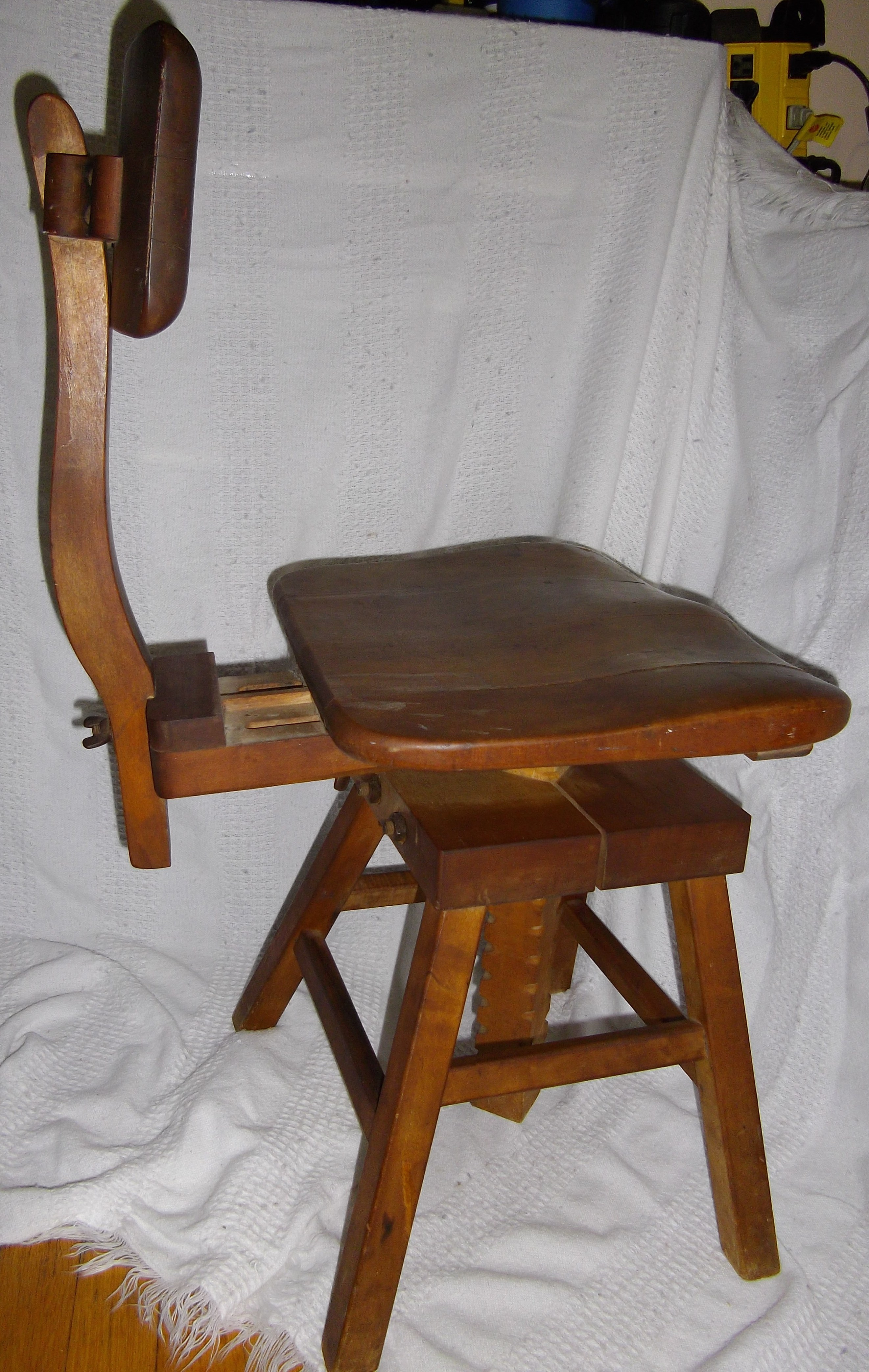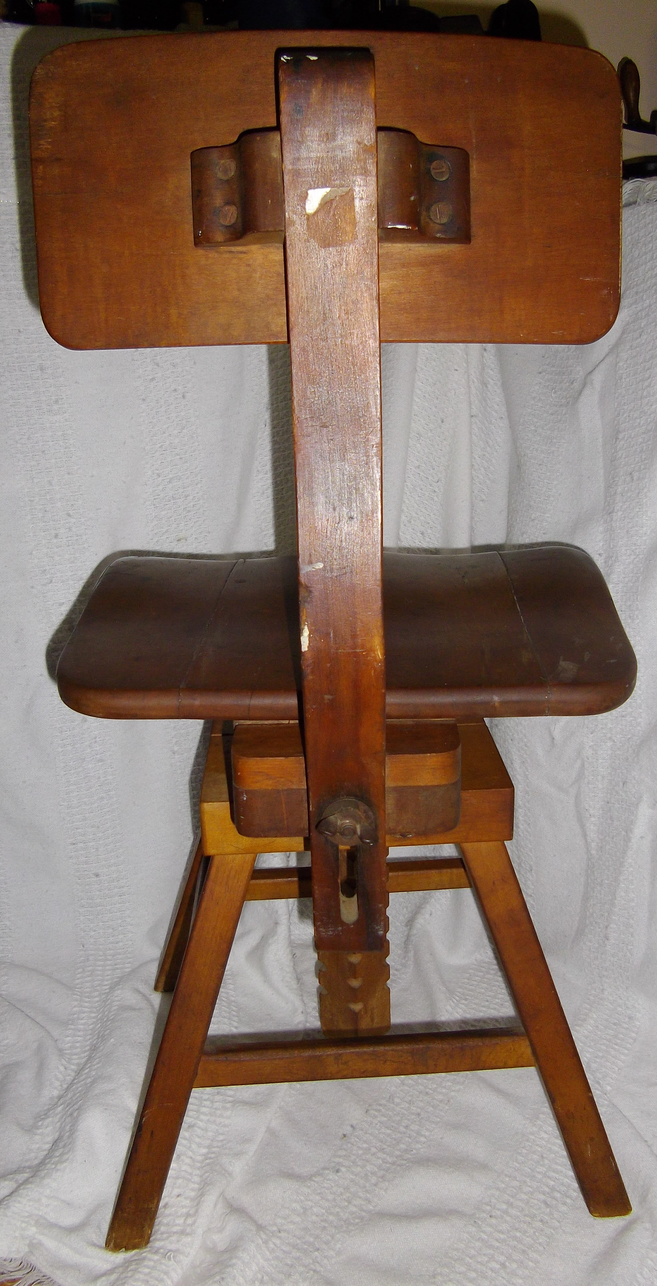 I spotted this chair while shopping in a small town in northern Maine. The adjustable seat height is what first caught my attention as I have never seen the design before. Upon closer inspection I noted that the back rest is also adjustable both vertically and horizontally. The back rest itself is also on a pivot to maintain contact with your back. The owner accepted an offer of $25. I showed it to an 87 year old friend of mine who is fine cabinet maker and craftsman of over 70 years. He stated (while excitedly inspecting and adjusting the chair) that he had only ever seen 1 before and then only in a photo. He said it was in "wonderfull" condition and would gladly take it off my hands for far more than I paid if it was for sale. Sadly he could not tell me anything as far as where, when, who or why about the chairs design and history. I would be very gratefull for any and all information anyone may have concerning this odd little chair.