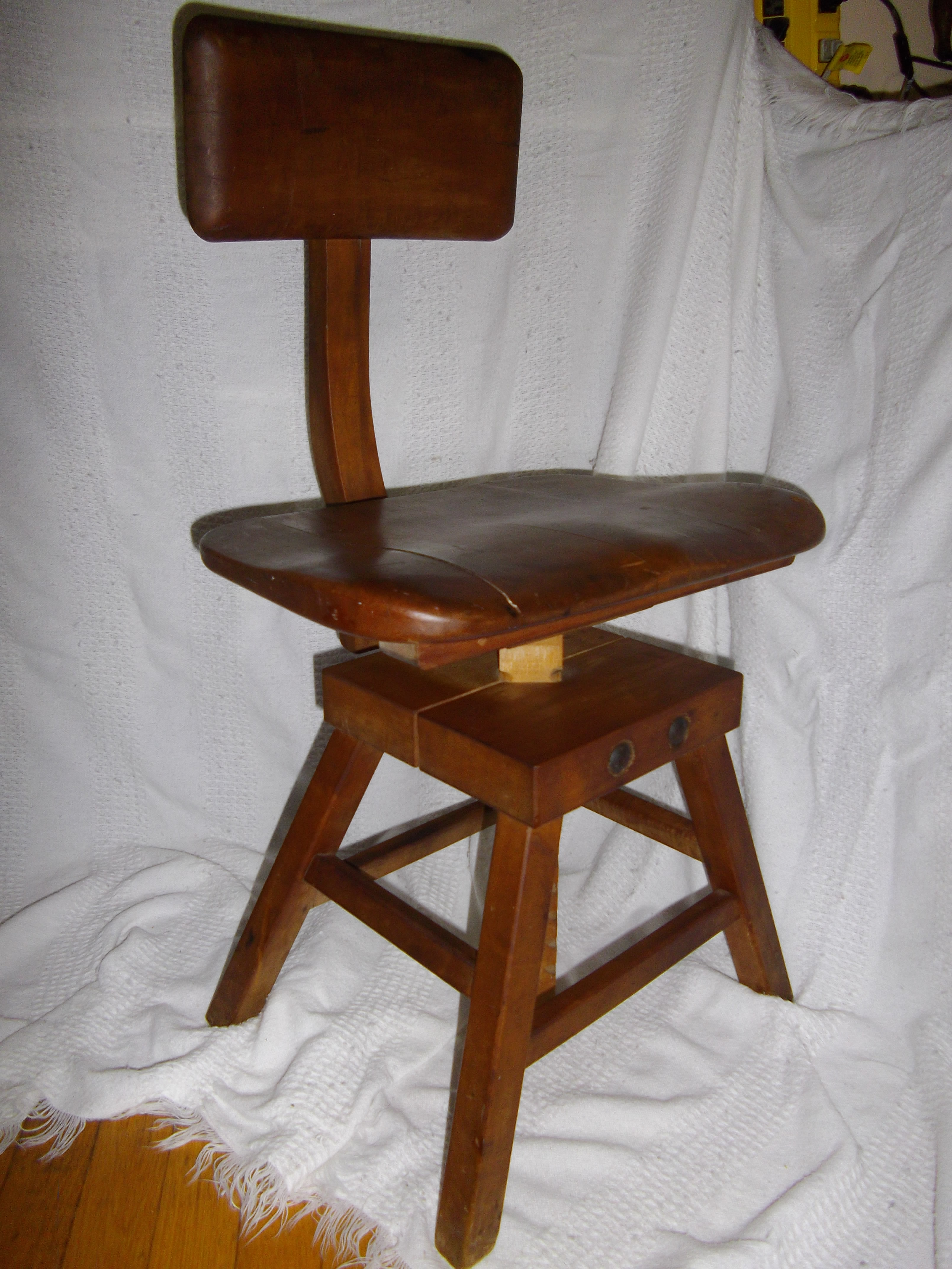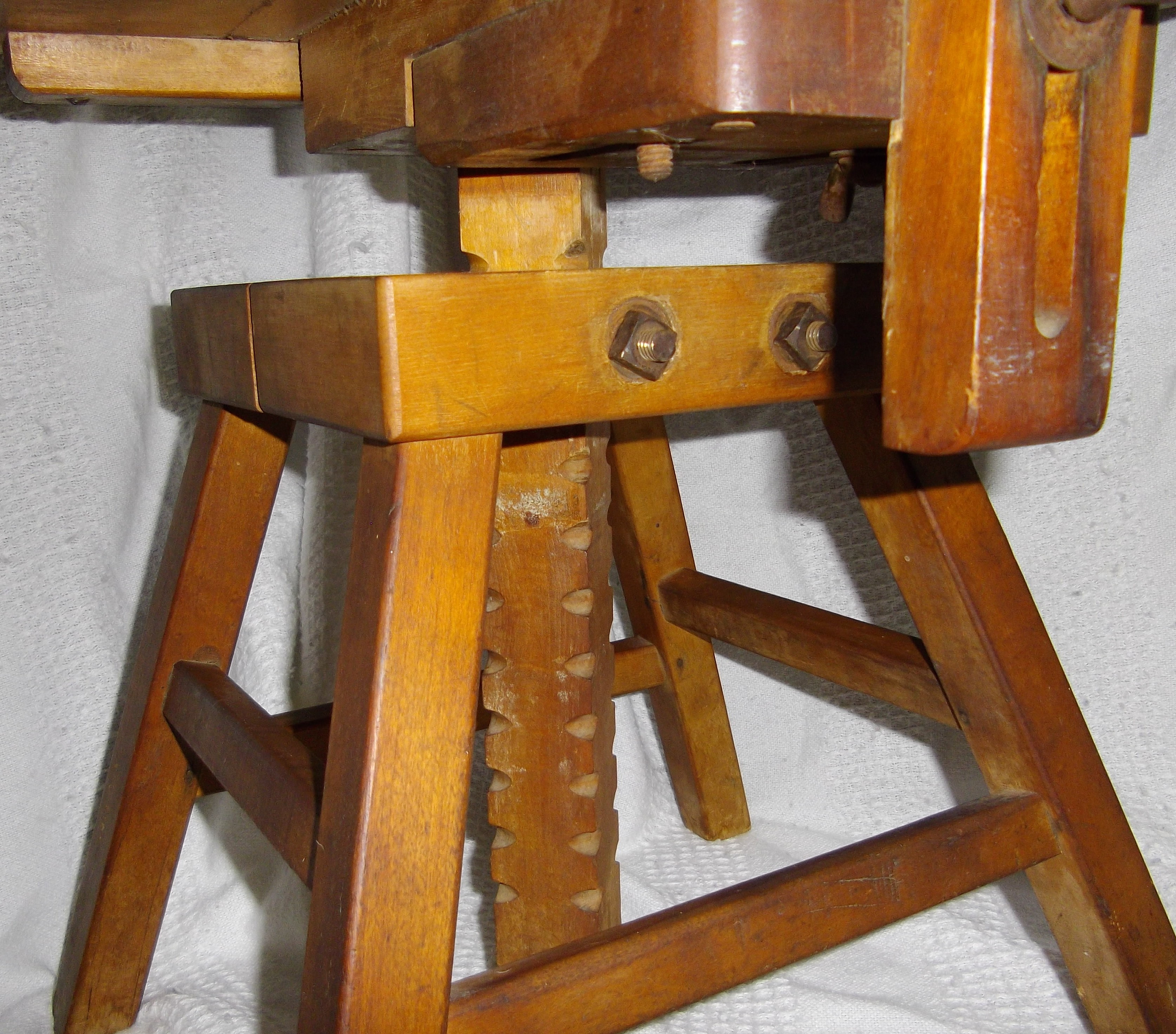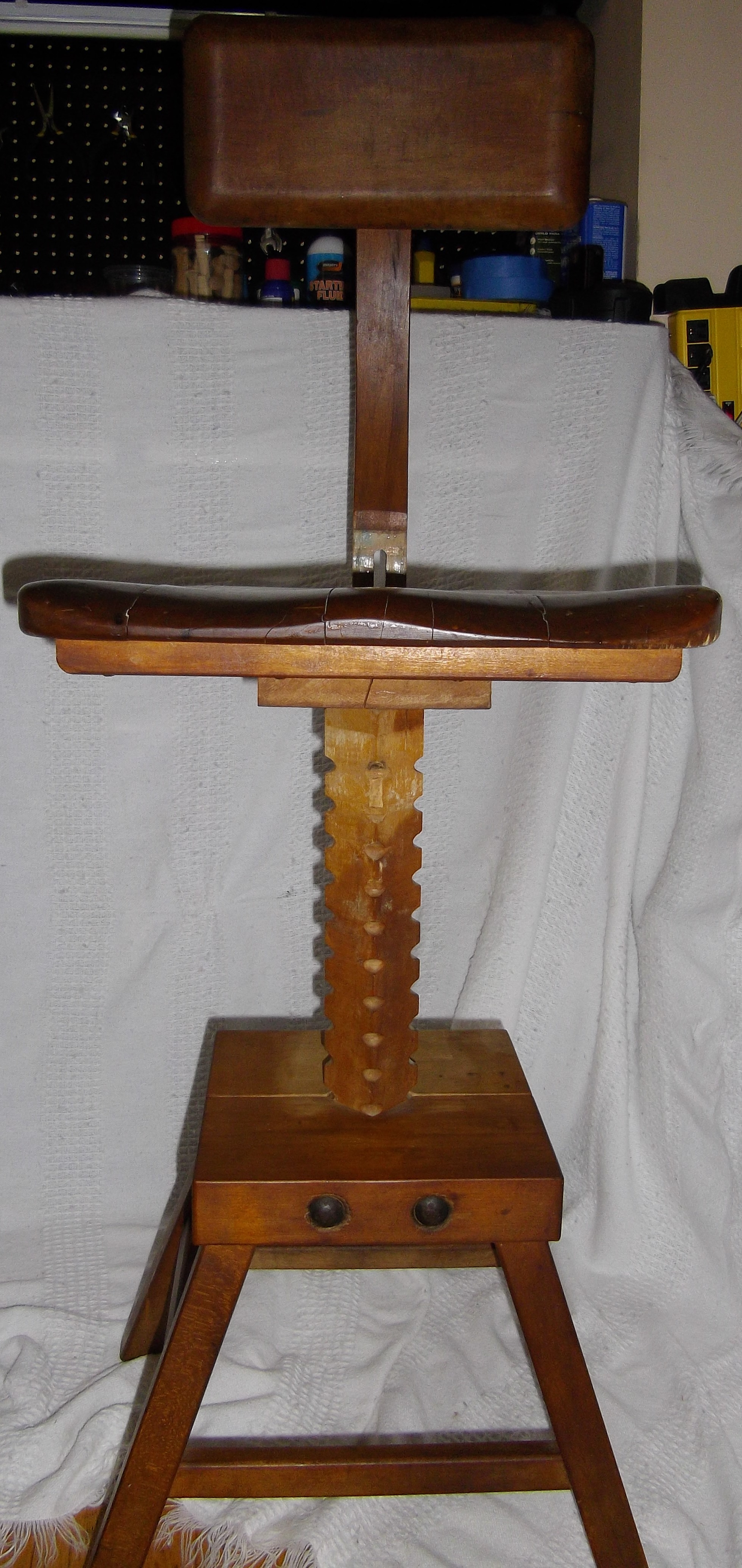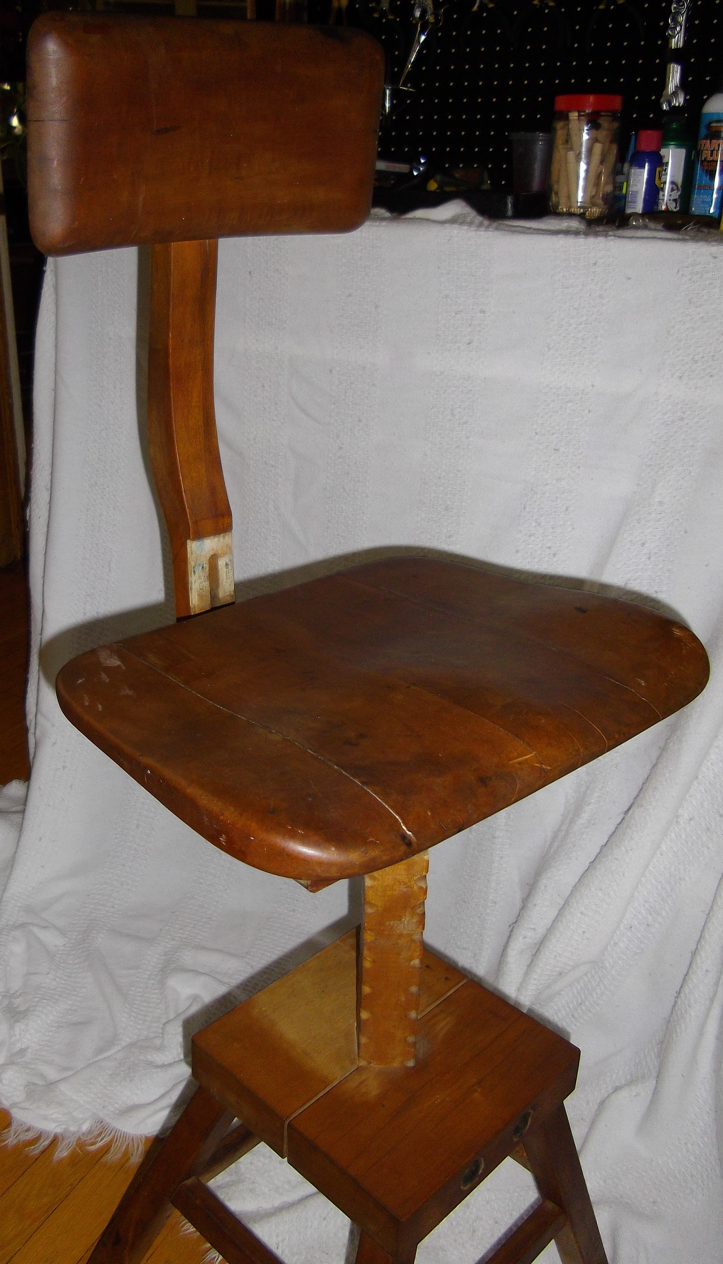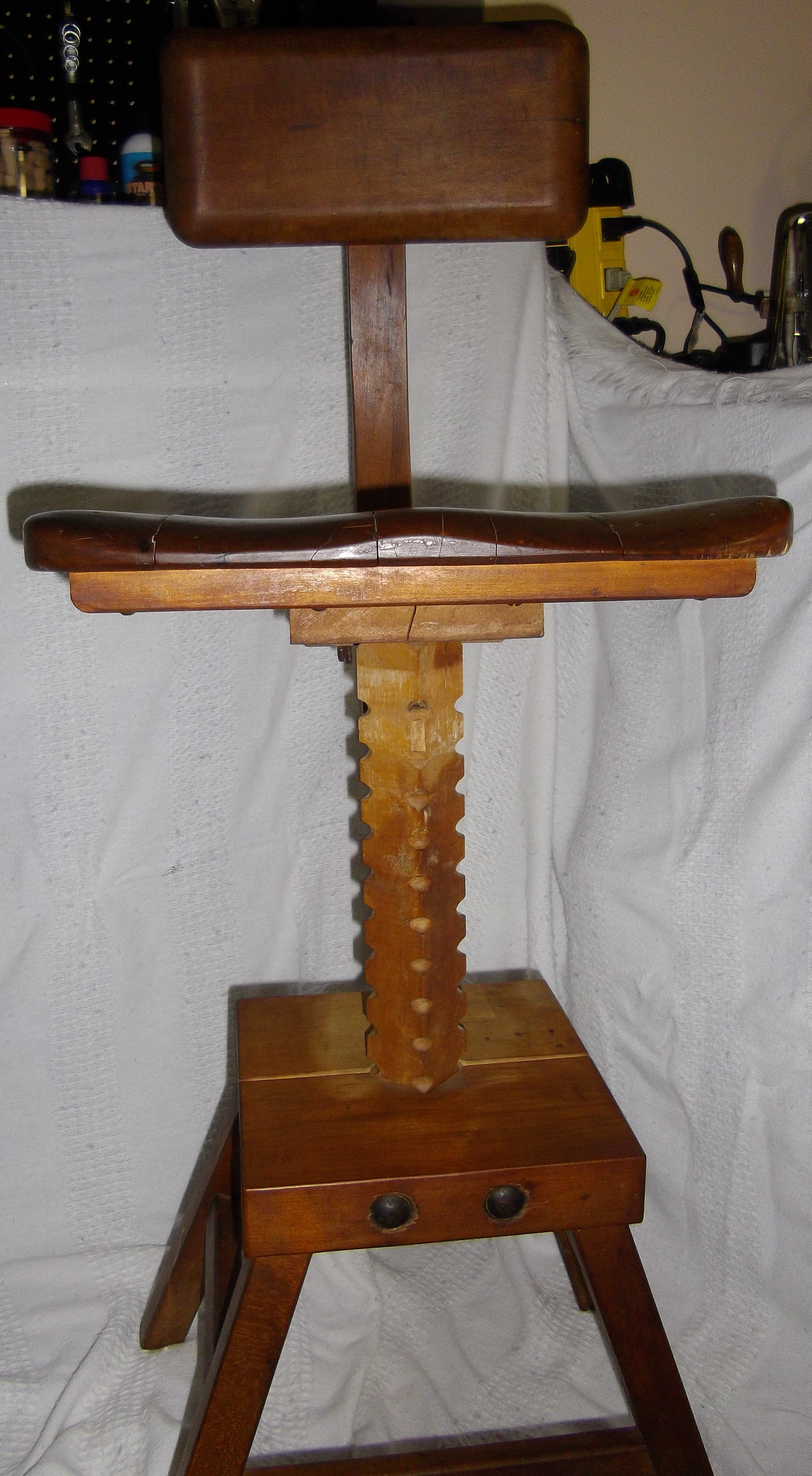 I spotted this chair while shopping in a small town in northern Maine. The adjustable seat height is what first caught my attention as I have never seen the design before. Upon closer inspection I noted that the back rest is also adjustable both vertically and horizontally. The back rest itself is also on a pivot to maintain contact with your back. The owner accepted an offer of $25. I showed it to an 87 year old friend of mine who is fine cabinet maker and craftsman of over 70 years. He stated (while excitedly inspecting and adjusting the chair) that he had only ever seen 1 before and then only in a photo. He said it was in "wonderfull" condition and would gladly take it off my hands for far more than I paid if it was for sale. Sadly he could not tell me anything as far as where, when, who or why about the chairs design and history. I would be very gratefull for any and all information anyone may have concerning this odd little chair.